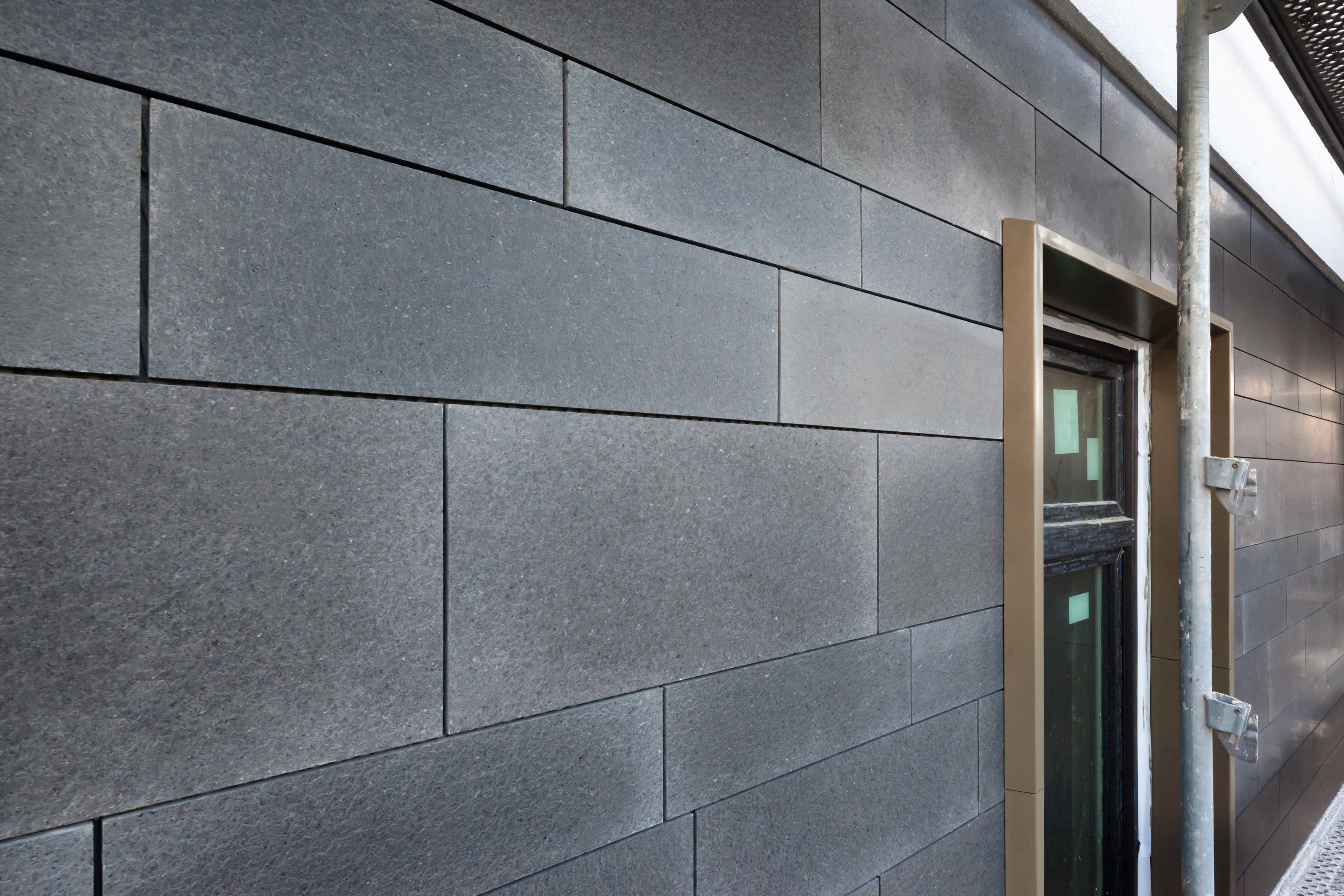 Auch hinter der dunklen Steinoberfläche des Erdgeschosses verbirgt sich ein spezielles Wärmedämm-Verbundsystem von Caparol. Die 500 Quadratmeter große Sockelfläche basiert auf dem Lithoboard-System mit der besonders abrissfesten und verdübelten Mineralwolle-Lamelle VB 101, einer Gewebearmierung mit Dübelung und der Naturstein-Verkleidung aus echtem italienischen Basalt. „Ursprünglich befanden sich noch ein Muschelkalk sowie ein Sandstein in der engeren Auswahl“, erklärt Jörn Gehrig, Bauingenieur und Technischer Leiter bei Caparol für das Gebiet Mitte. „Aufgrund seiner ausdrucksstarken Farbigkeit sagte der Basalt dem Investor jedoch am meisten zu“. Speziell nach individueller Stückliste in zehn verschiedenen Formaten gefertigt, wurden die zehn Millimeter starken Basalt-Platten auf dem Caparol-WDVS verklebt.