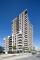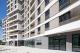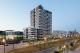 Der Baukörper besteht strukturell aus zwei Volumen: aus dem zwanziggeschossigen Hochhaus sowie einem kleineren, vorgelagerten Bau mit sieben Geschossen und Dachterrassen. Geschossweise umlaufende Bänder, hell abgesetzt, betonen die Horizontale und gliedern die aufstrebende Baumasse. Rücksprünge durch Loggien, auskragende Balkone sowie bodentiefe Fensteröffnungen rhythmisieren die Fassaden intensiv. Damit nicht genug: Der Baukörper steht nicht als monolithischer Block da, sondern als ein prismatisches Objekt. Eine vertikale, über alle Etagen laufende Faltung bringt eine raffinierte Dynamik ins Spiel, macht schlank und unterstreicht die städtebauliche Position des Gebäudes. Die Verschwenkung sorgt überdies auch noch für bessere Ausblicke aus allen Wohnungen – ein interessanter Nebeneffekt.