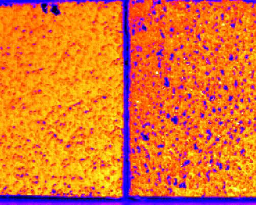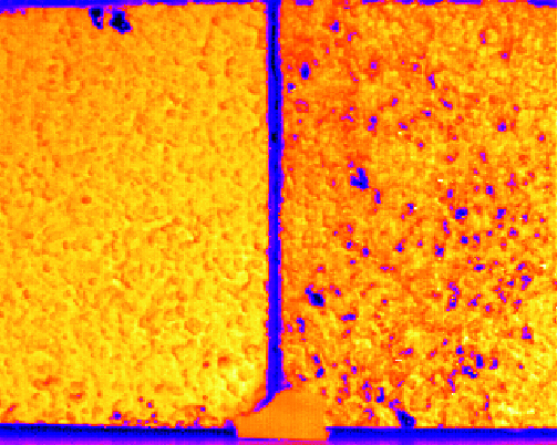 To clearly demonstrate the effect laboratory tests with measurement systems specially developed for this purpose were elaborated. In these tests NQG³ showed 30 percent quicker drying after intensive watering compared to the comparison paints. This was measured and visualised spectroscopically using a special infrared camera (Figs. 6 and 7). The darker the colour, the more moisture is located at this point on the surface. On larger, rendered test panels the difference could be clearly seen even without measurement equipment (Fig. 5).