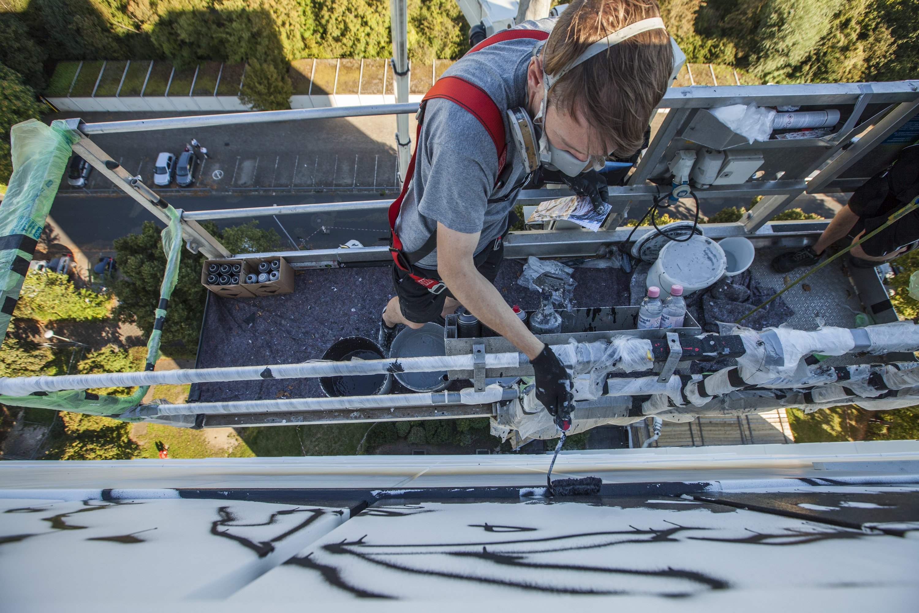 Nun war Künstler Hendrik Beikirch an der Reihe. Er hatte zunächst am Computer simuliert, wie die Skizze auf dem Gebäude wirken würde. Und übertrug sie dann – teils mit der Spraydose, teils mit Farbrolle und Amphibolin – frei Hand und in tausendfacher Vergrößerung auf die Fassade. Caparol unterstützte ihn bei der Auswahl des richtigen Farbtons: „Es galt, einen Amphibolin-Ton zu finden, der dem Schwarz aus den verwendeten Spraydosen möglichst nahe kommt“, erklärt Leonhardt. „Um das zu erreichen, haben wir verschiedene Rezepturen ausprobiert und Bemusterungen vorgenommen.“
