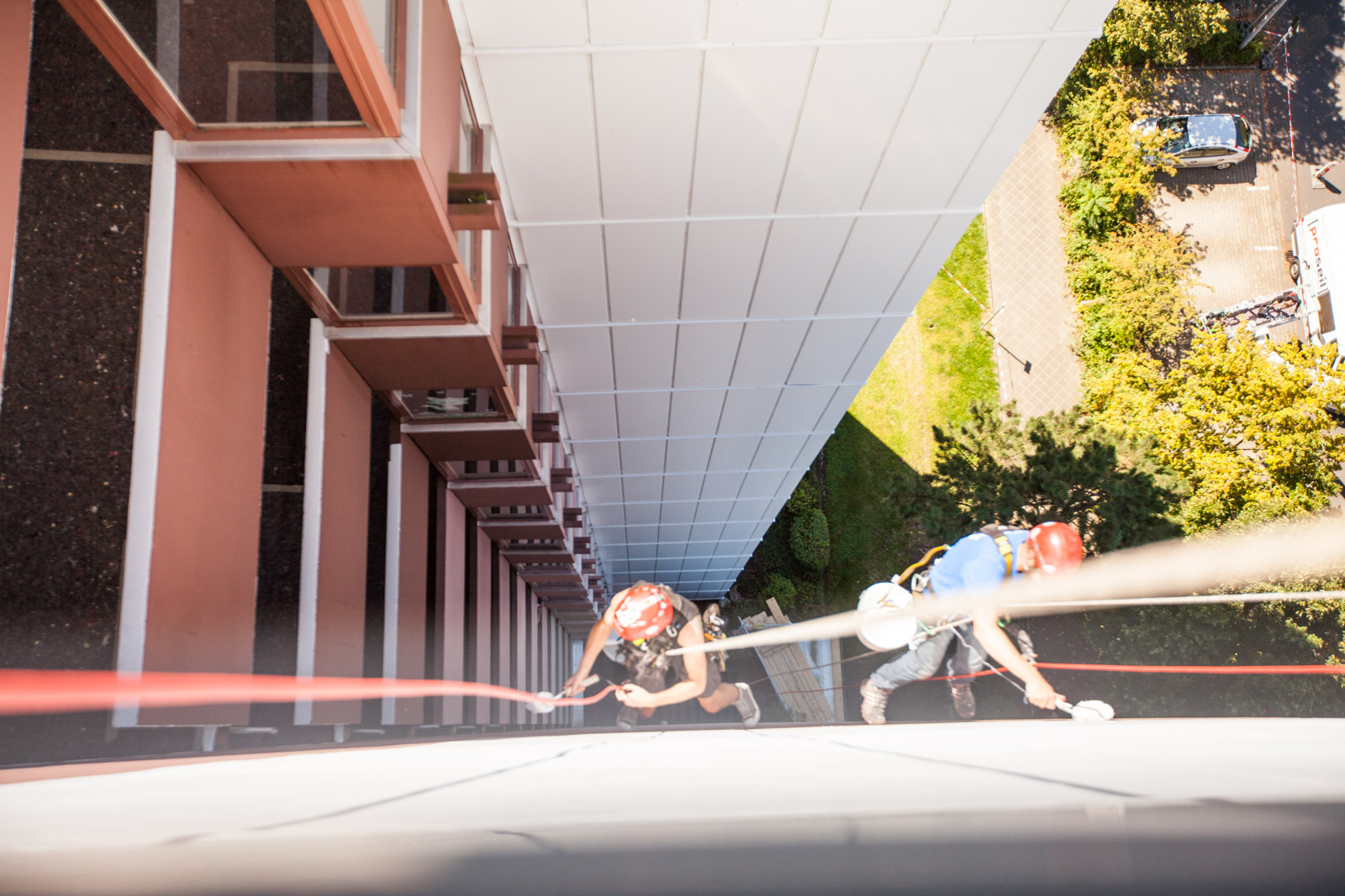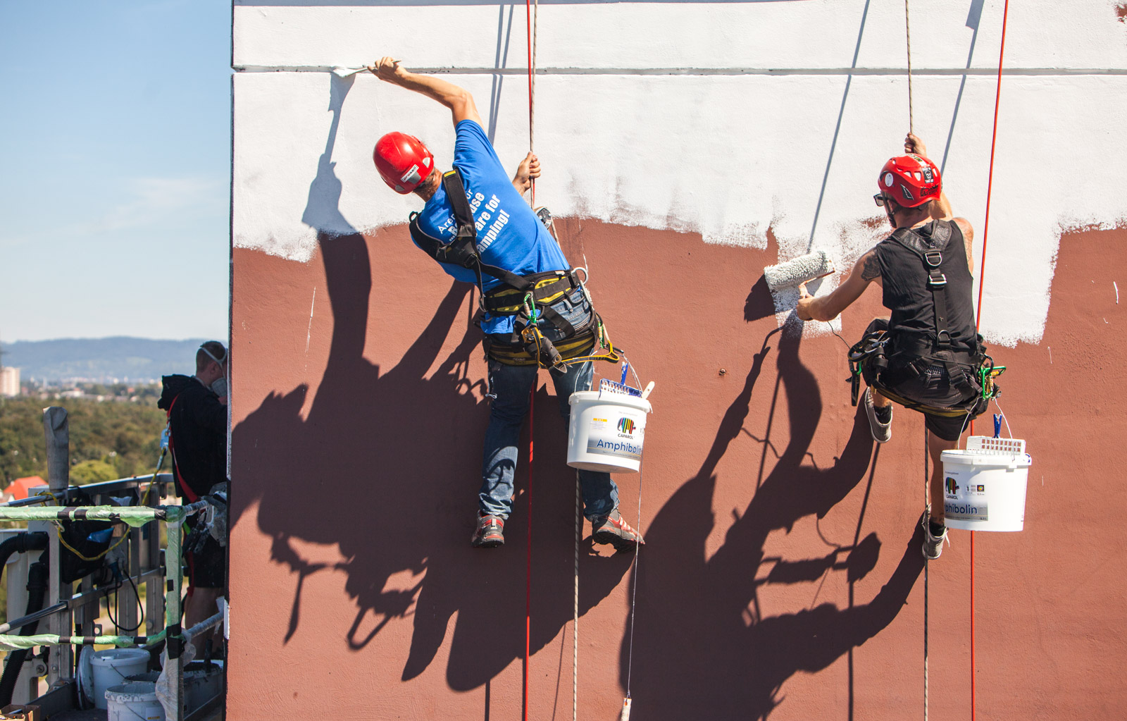 Die reine Fläche stellte den Malermeister und seine Kollegen nicht vor große Herausforderungen – wohl aber die Höhe des Gebäudes: Die unteren zwei Drittel des mächtigen Wohnblocks bearbeiteten sie von 30-Meter-Hubsteigern aus. Um das obere Gebäudedrittel kümmerten sich dagegen Industriekletterer, die sich vom Hausdach abseilten – die Koordination dieser Arbeiten lag dabei ebenfalls bei Krippl. Hochsommerliche Temperaturen von um die 35 Grad brachten die Verarbeiter zusätzlich ins Schwitzen, erinnert er sich: „Glücklicherweise befindet sich das Wandgemälde auf der nordseitig ausgerichteten Fassade, so dass wir nicht in der prallen Sonne arbeiten mussten. Trotz der Hitze hatten wir so mit Amphibolin keine Probleme mit Ansätzen.“