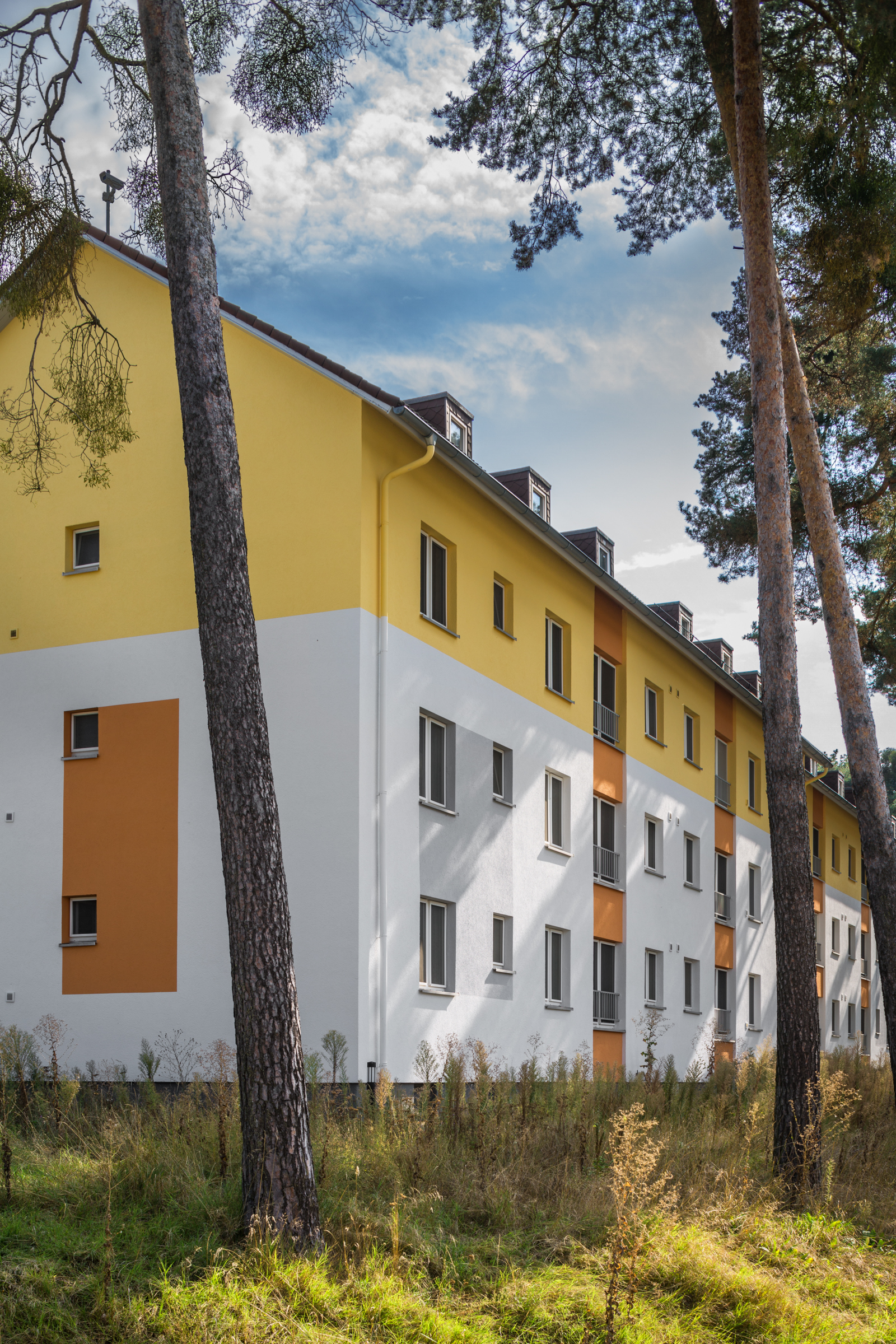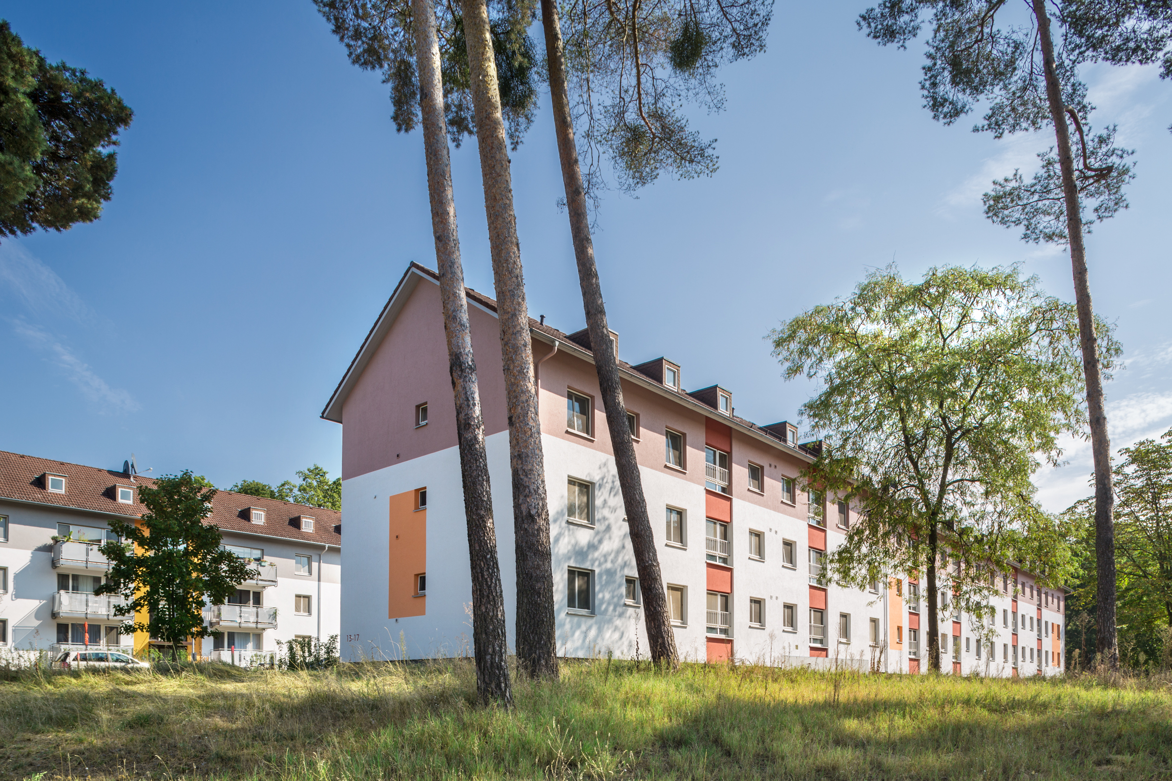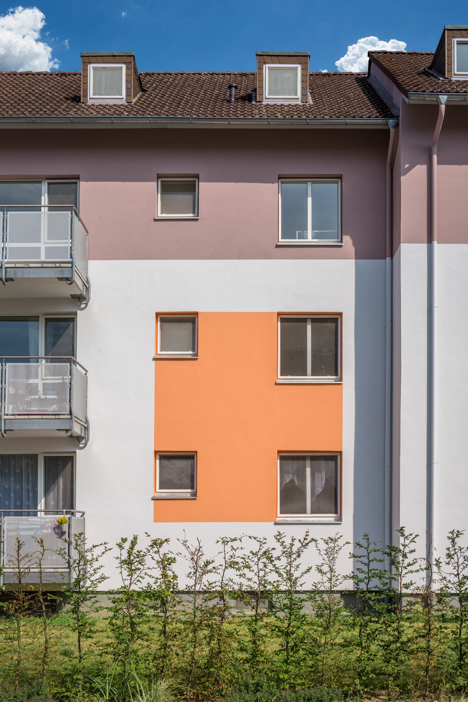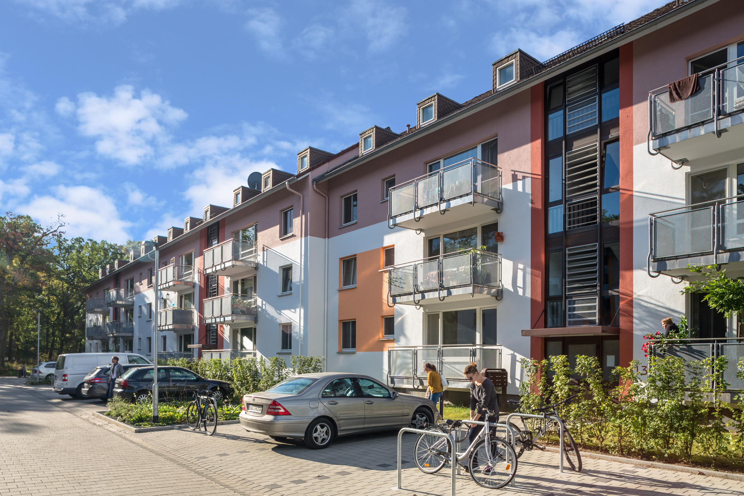 Interessant ist, dass sich die Farbrichtungen der Häuser zwar wiederholen, aber die Gestaltung der Akzentflächen variiert. Das hat zum Teil mit der Gebäudearchitektur zu tun, da einige Häuser Anbauten haben. Charakteristisch sind die abgesetzten oberen Geschosse und Farbflächen, die meist vier Fenster miteinander verbinden. Die Wohnblöcke wirken so optisch niedriger und durch die klare, farbliche Gliederung insgesamt freundlich und einladend.