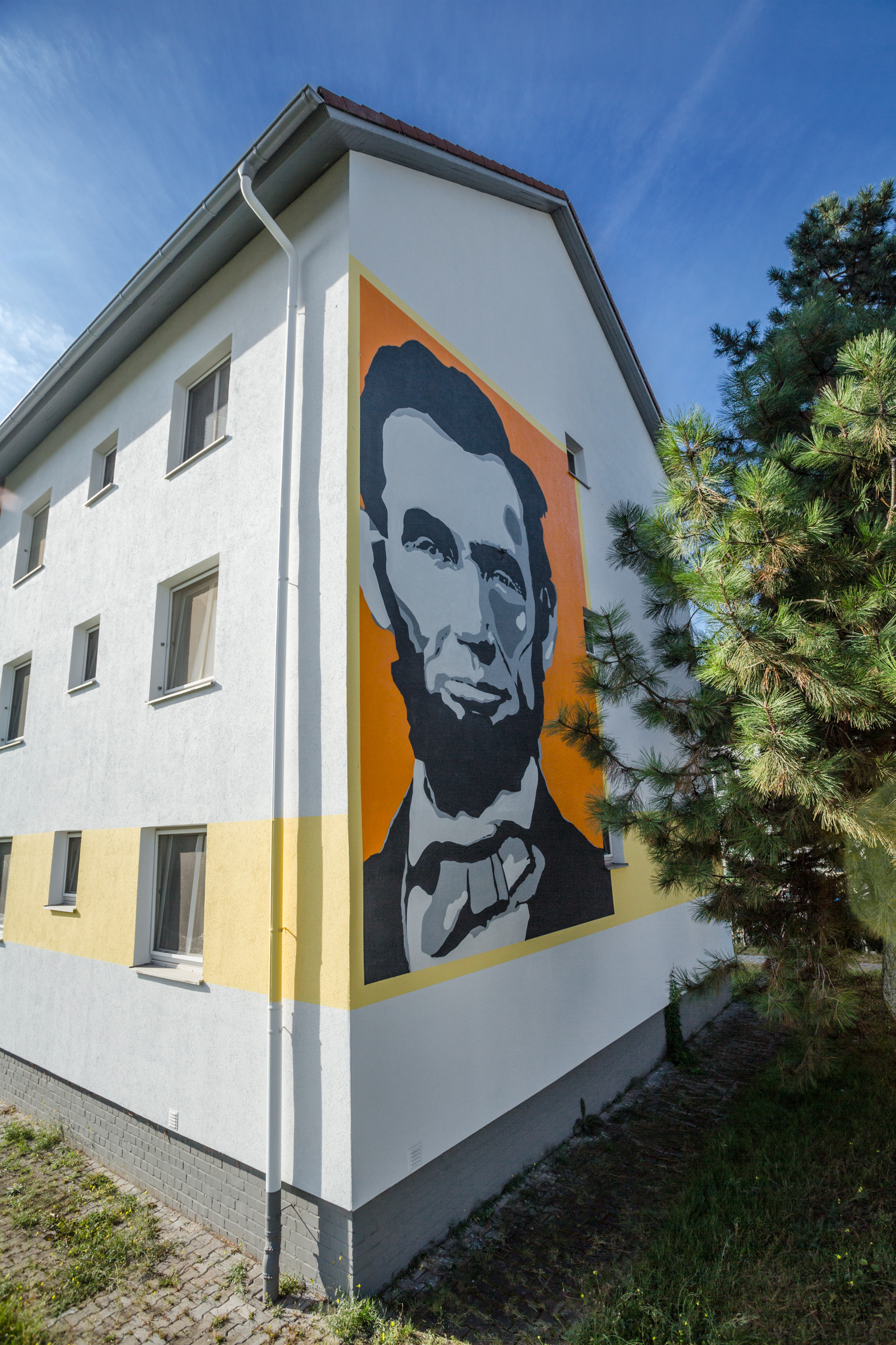 Zwei Giebelseiten an der Noackstraße lenken die Blicke auf sich. Auf Anregung der Geschäftsleitungen der bauverein AG und der BVD New Living GmbH und Co. KG, einer hundertprozentigen Tochter der bauverein AG, sind sie mit 45 Quadratmeter großen Porträts von Albert Einstein und Abraham Lincoln plakativ gestaltet. Der Darmstädter Spraykünstler Elmar Compes hat die beiden Charakterköpfe im Stil von Andy Warhols Serigrafien aus Grauwerten und Schwarz dargestellt und Gelb-orange umrahmt. Einstein symbolisiert die Wissenschaft. Der bärtige Namensgeber Lincoln aber wird wohl bald die einzige Erinnerung an die ehemalige „Lincoln-Siedlung“ der Amerikaner sein.