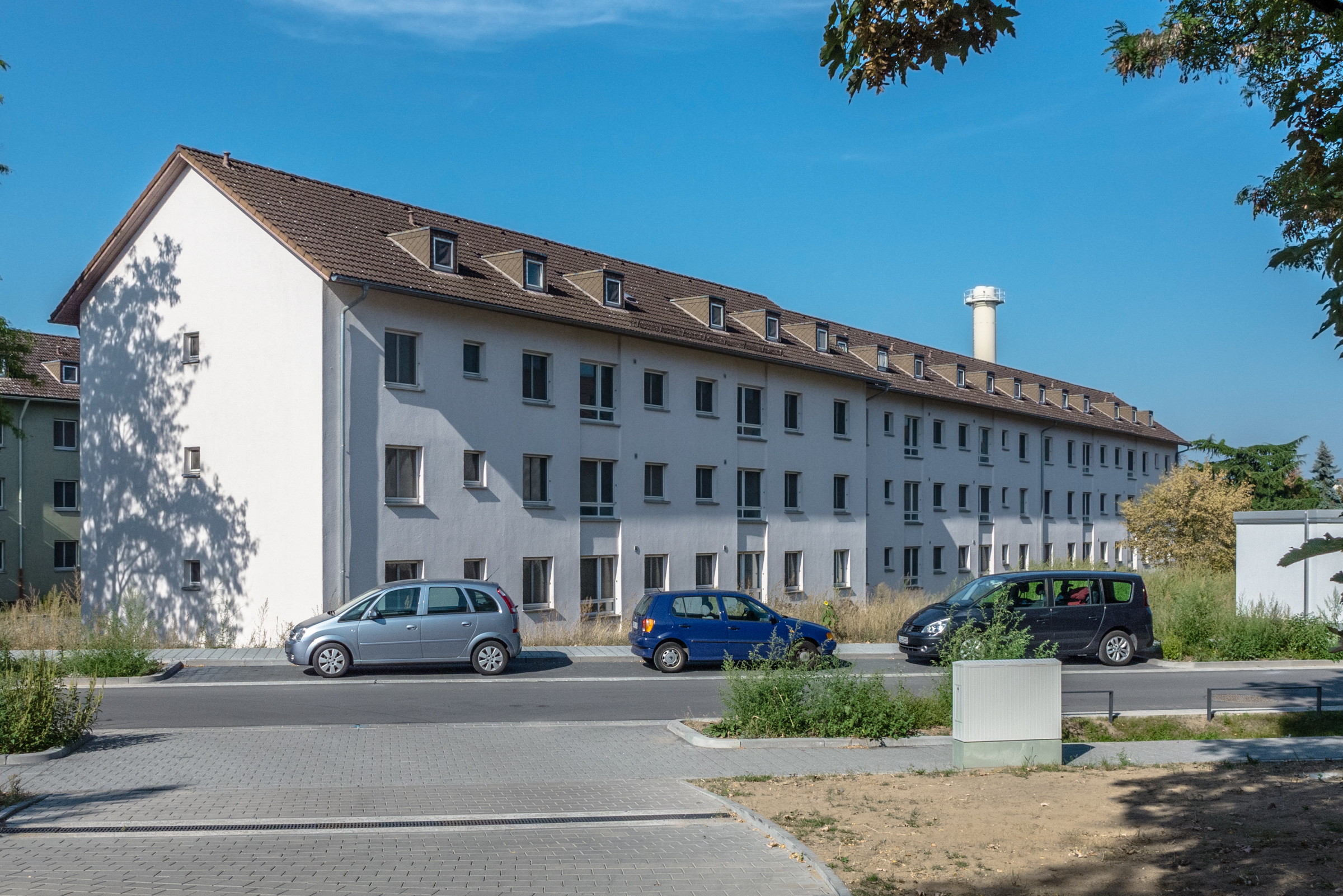Jenseits des Zauns bot sich Autofahrern und Fußgängern sieben Jahre lang der Anblick unbewohnter, akkurat nebeneinander stehender Wohnblocks in einheitlichem Hellgrau und verschmutzten Beige- und Ockertönen. Einer wie der andere - wie geklont. Einziges Unterscheidungsmerkmal waren die turmartigen Badanbauten an einigen Blocks.