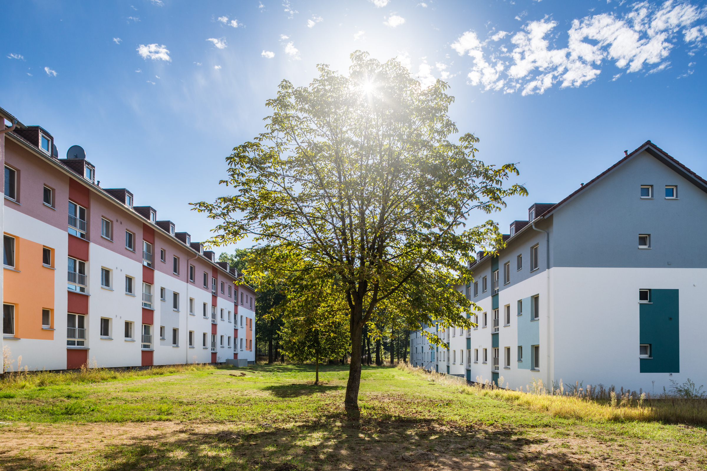 Aber ab 2014 erlebten die Zaungäste eine Überraschung. Ein Teil der Bauten wurde abgerissen. Der Bebauungsplan sah hier Neubauten, neben Wohngebäuden auch Tiefgaragen, eine neue Schule und eine geänderte Straßenerschließung vor. Andere Bauten hatten eine so gute Substanz, dass sich ihre Sanierung lohnte. Nach und nach verschwanden die langweiligen Außenfassaden und machten einem heiteren neuen Erscheinungsbild mit heller Grundfarbe sowie raffiniert platzierten Farbakzenten Platz.
