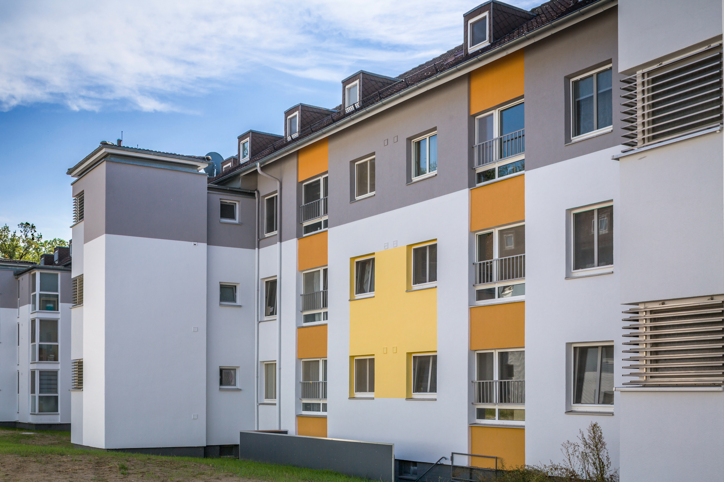 Was war geschehen? Im Herbst 2015 hatte die bauverein AG begonnen, in einem Baufeld mit Bestandsgebäuden sechs Gebäudezeilen für die Vermietung herzurichten. Mit den Planungs- und Sanierungsarbeiten wurde das Ingenieurbüro Wandrey aus Darmstadt beauftragt. Als freie Mitarbeiterin wirkte die Architektin Rosemarie Schorr nicht nur hierbei mit, sondern erhielt auch den Auftrag, den monotonen Einheits-Look aufzulockern. Jede Häuserzeile sollte sich von der anderen zwar unterscheiden, jedoch nicht abgrenzen. Eine gemeinsame Note musste erkennbar bleiben.