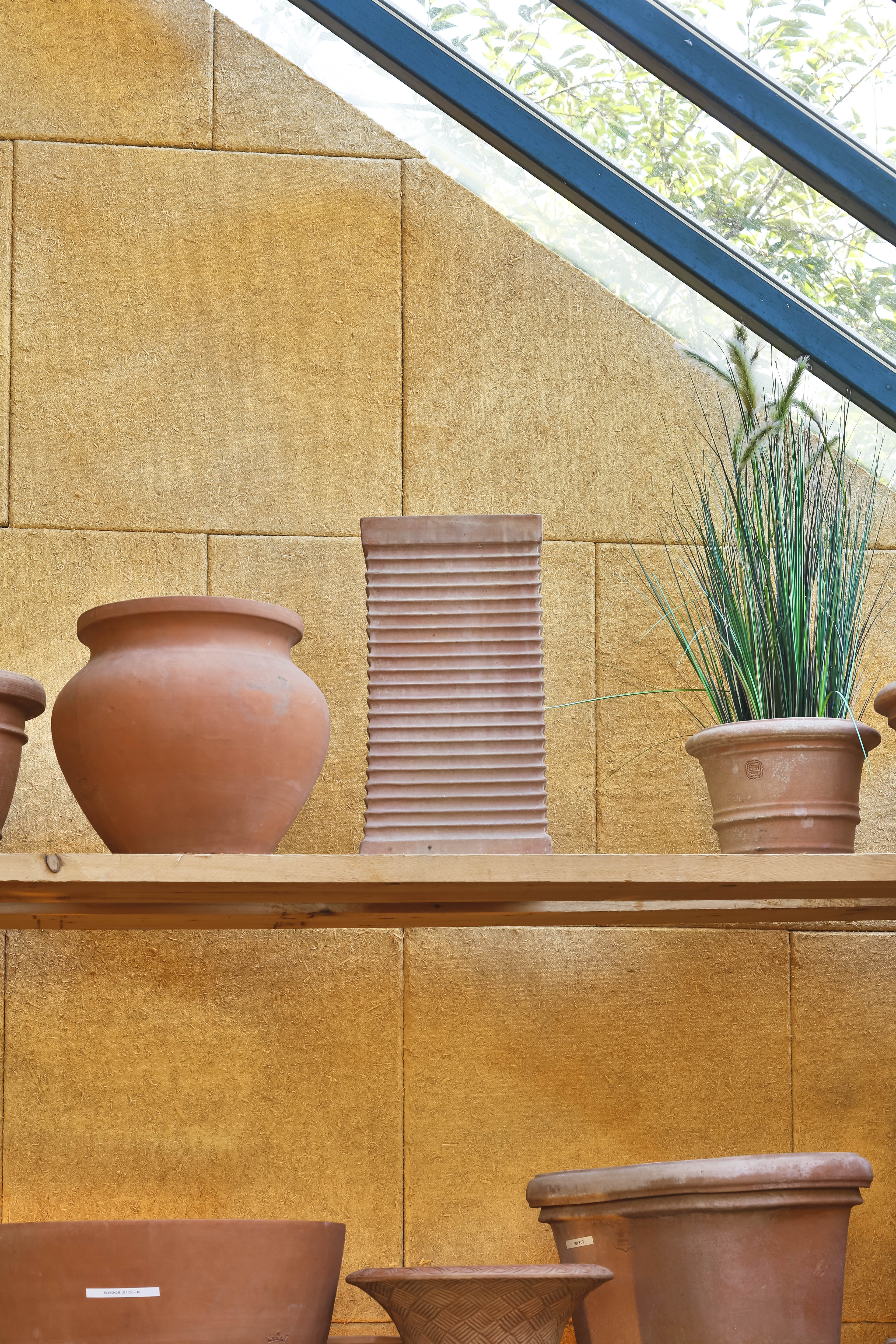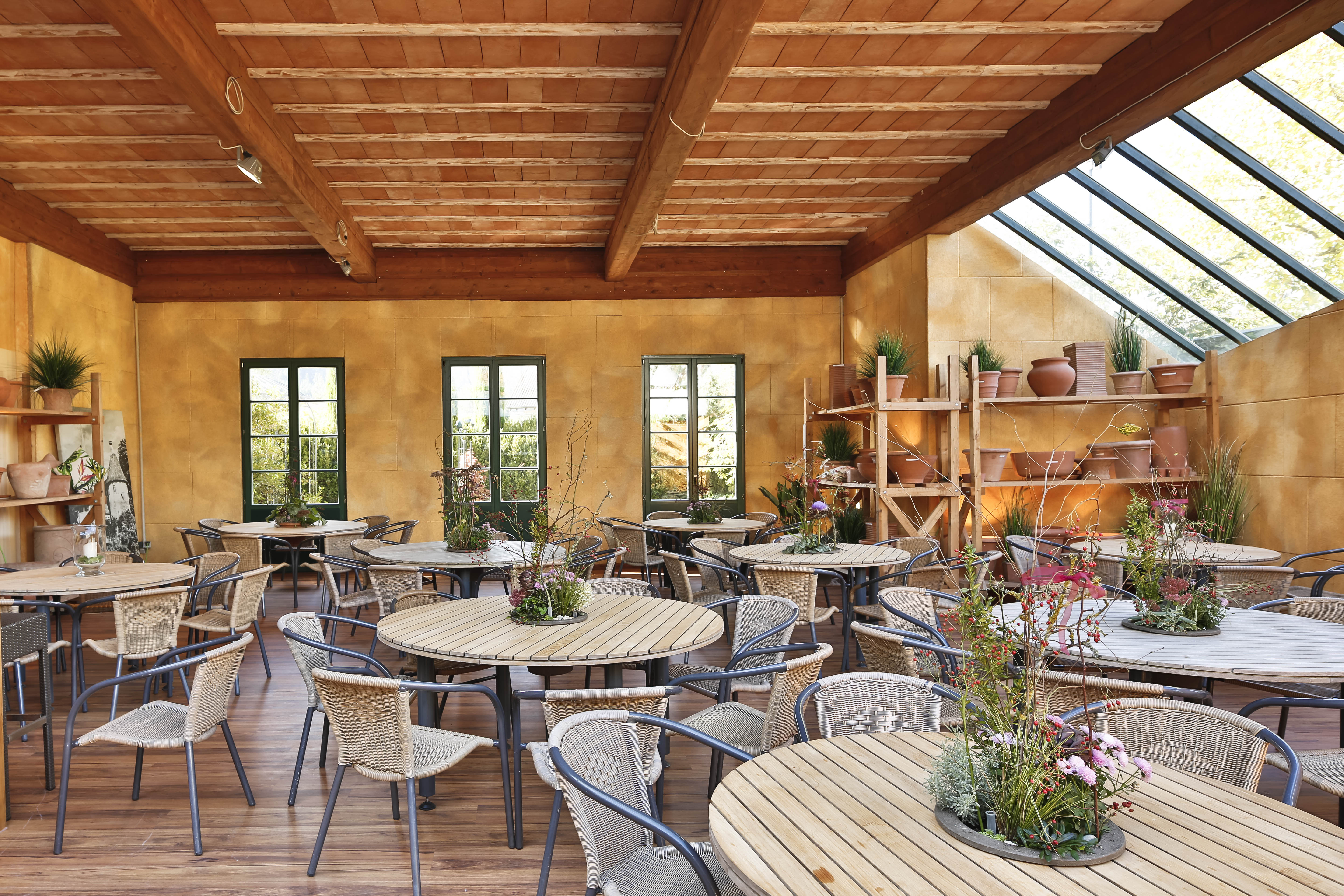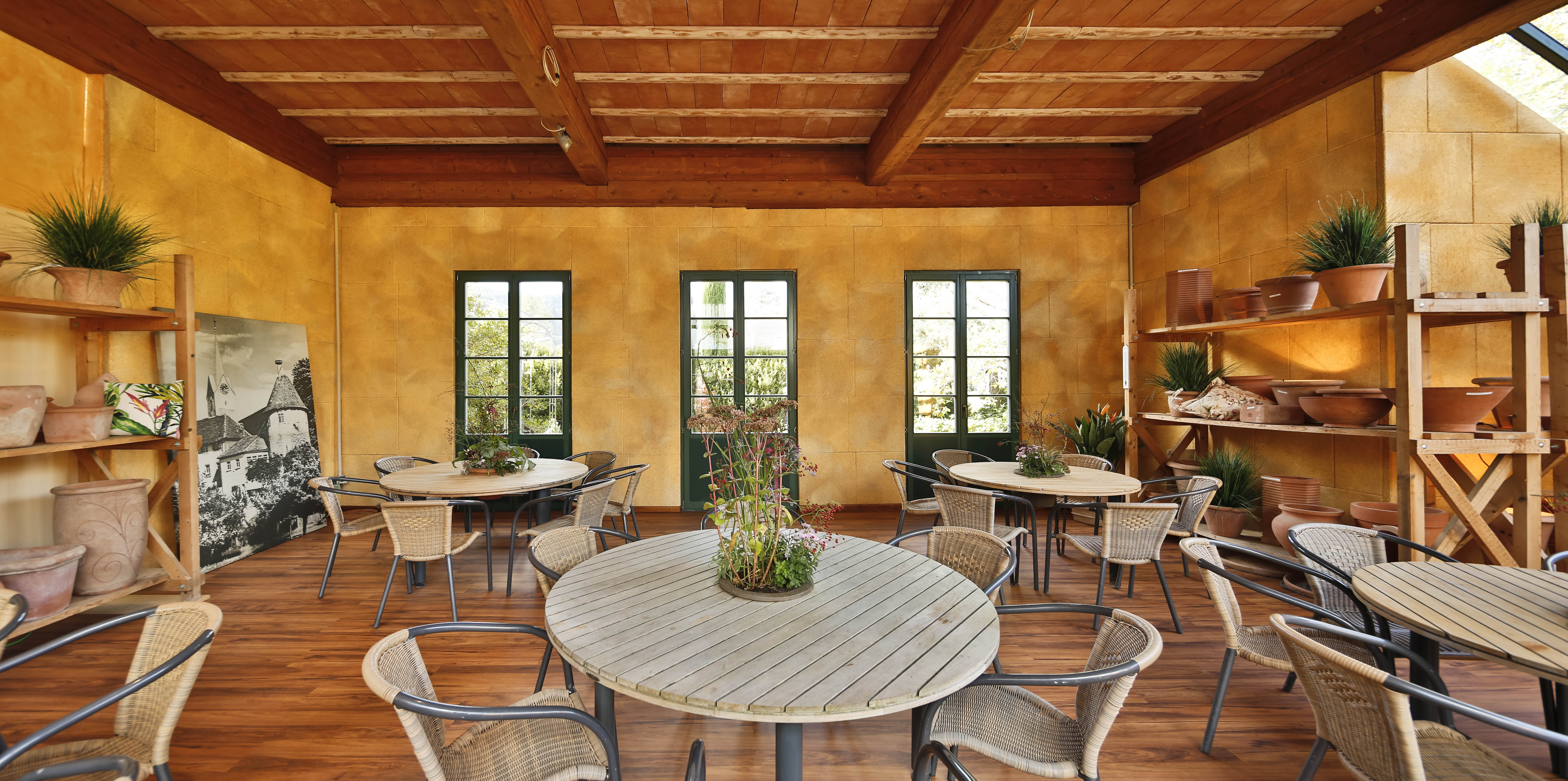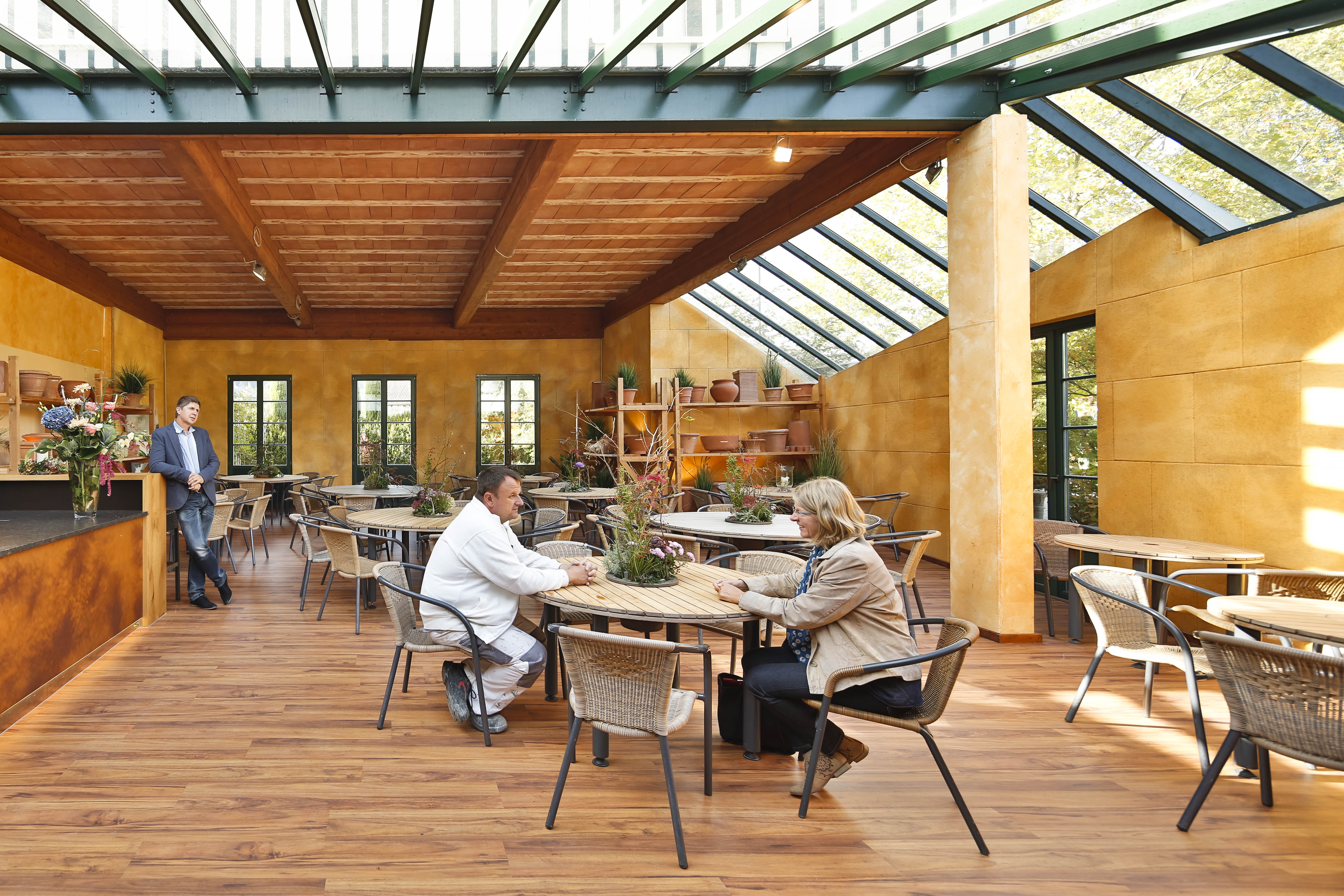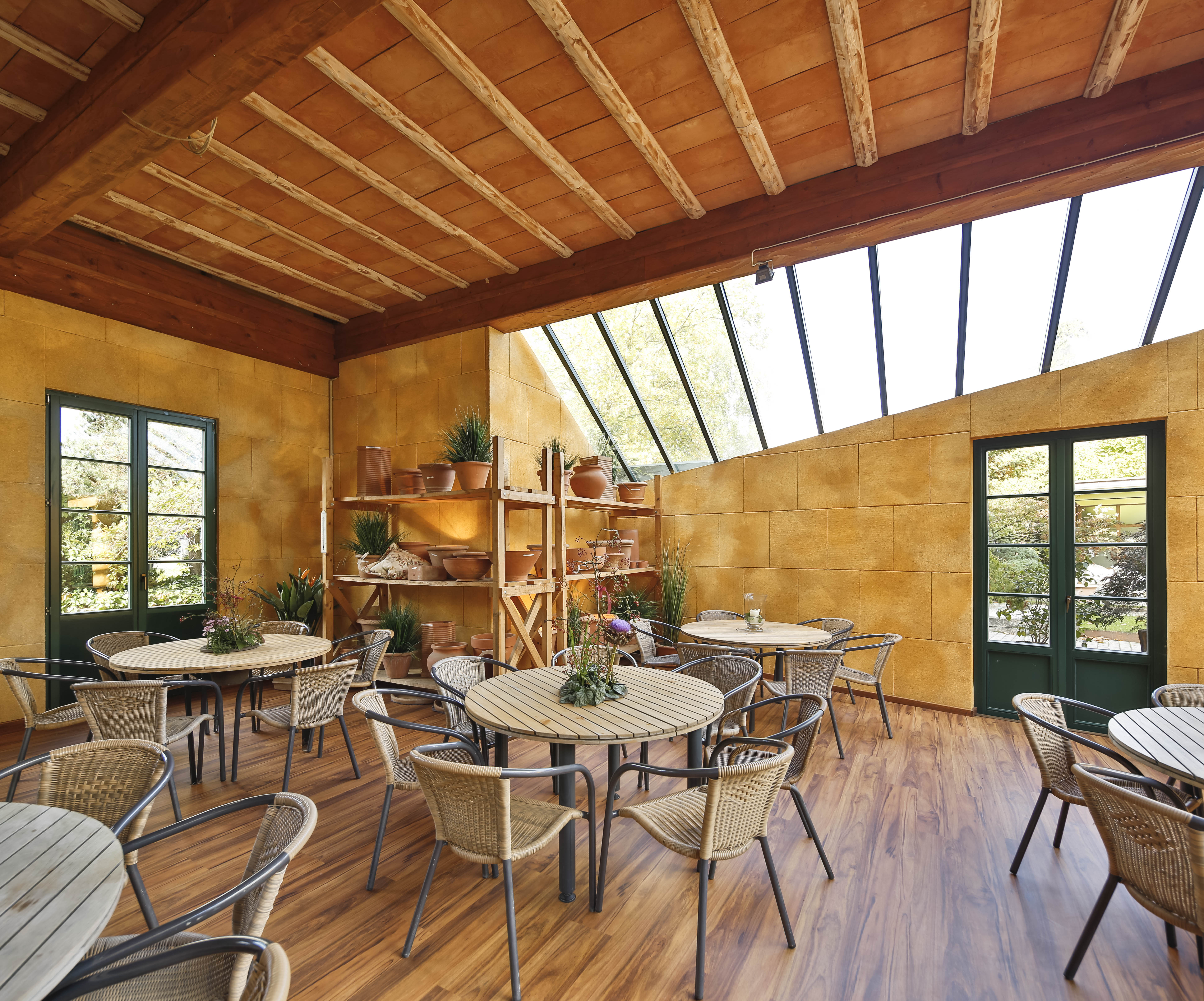 Warmtonig und weich wirken die Wände im Veranstaltungsraum der Gartenmanufaktur in Singen-Bohlingen. Sie wurden in drei Farbtönen mit Sylitol Bio Innenfarbe so gespritzt, dass sie wie gewischt aussehen, genauso wie die angrenzenden Wände aus Mauerwerk und Putz. Bei näherer Betrachtung zeigen die schallgedämmten Wände lebendige organische Strukturen. Streicht man mit der Hand drüber, fühlt sich die Oberfläche warm an. Die gepressten Naturfasern sind zu spüren.