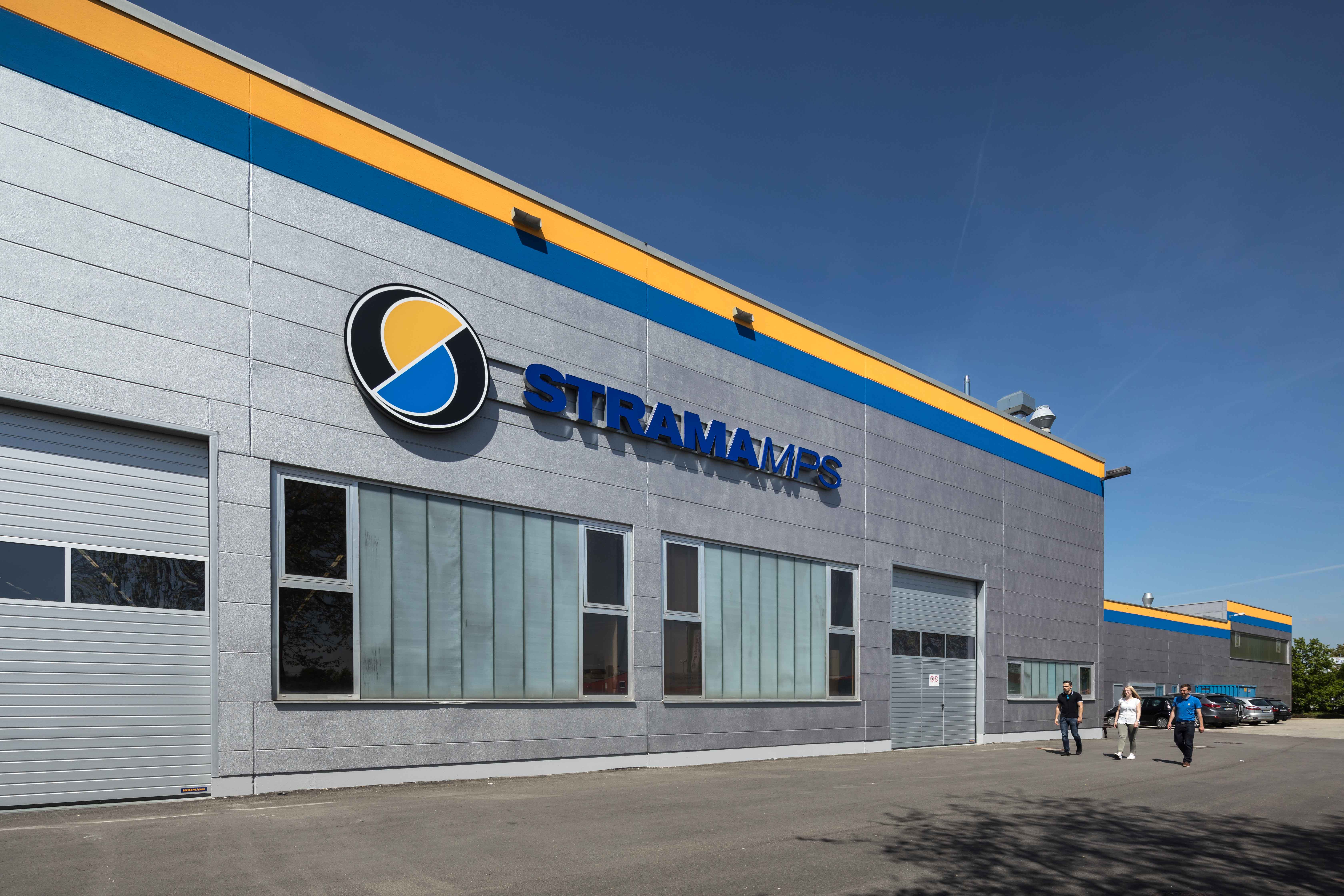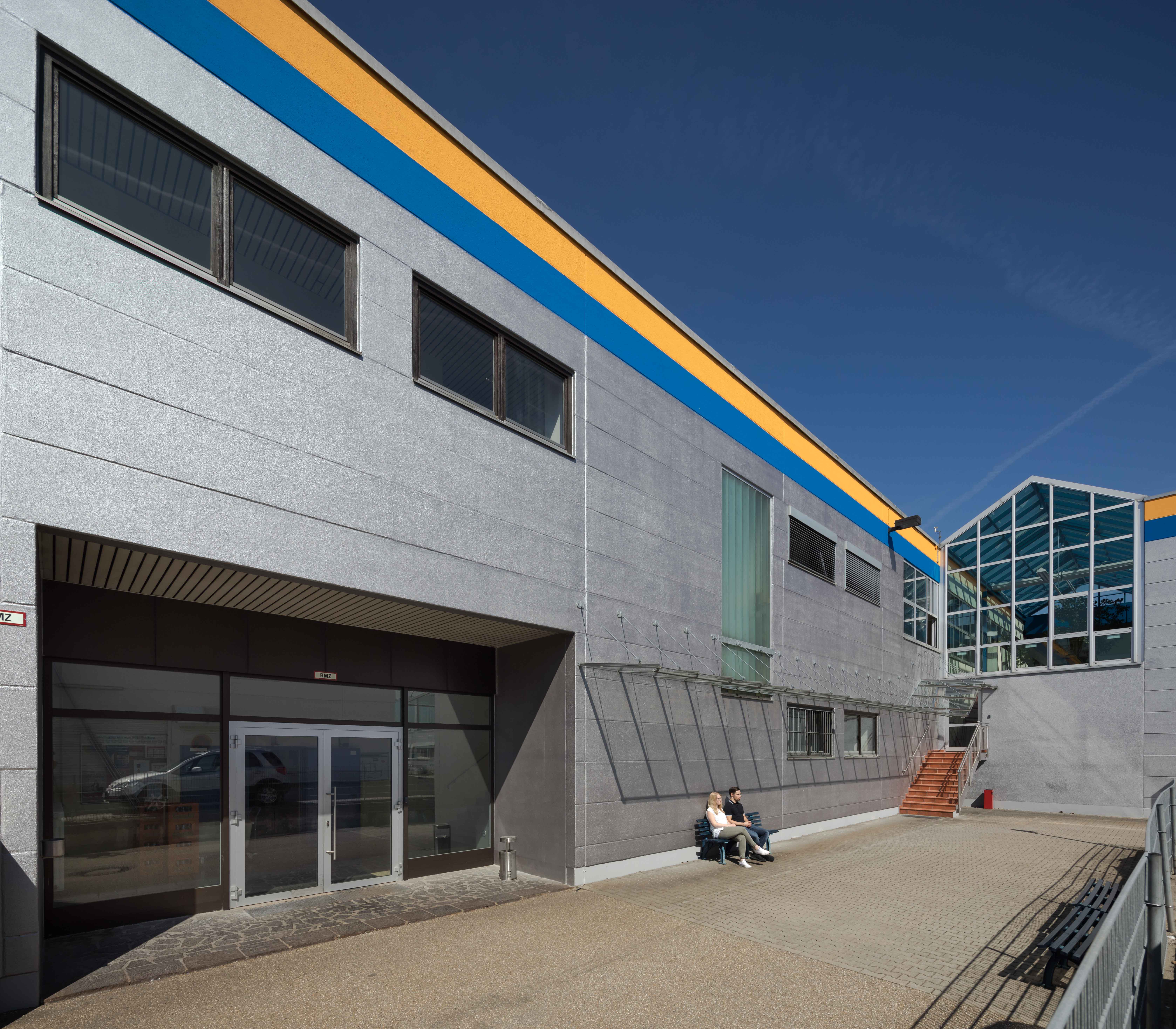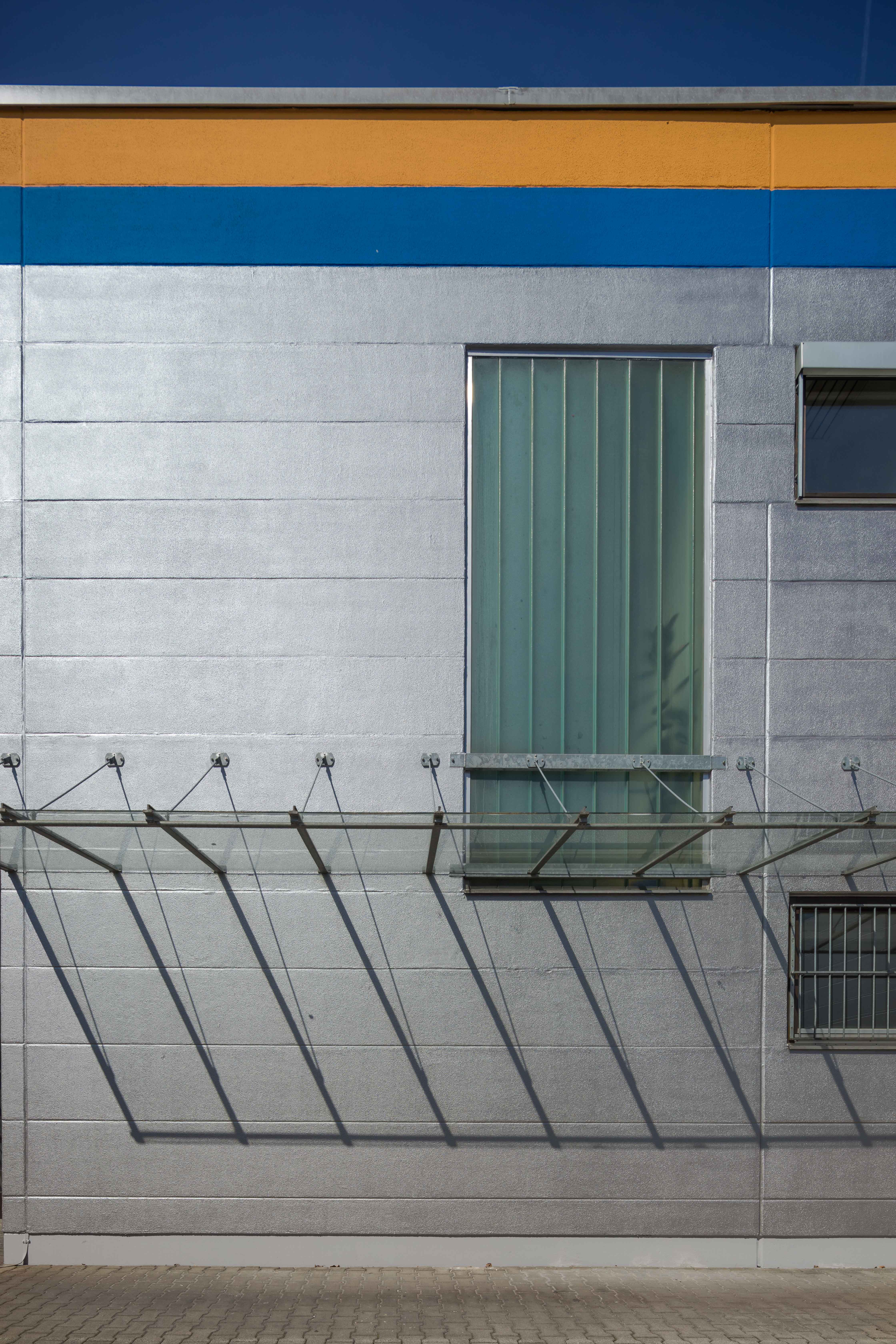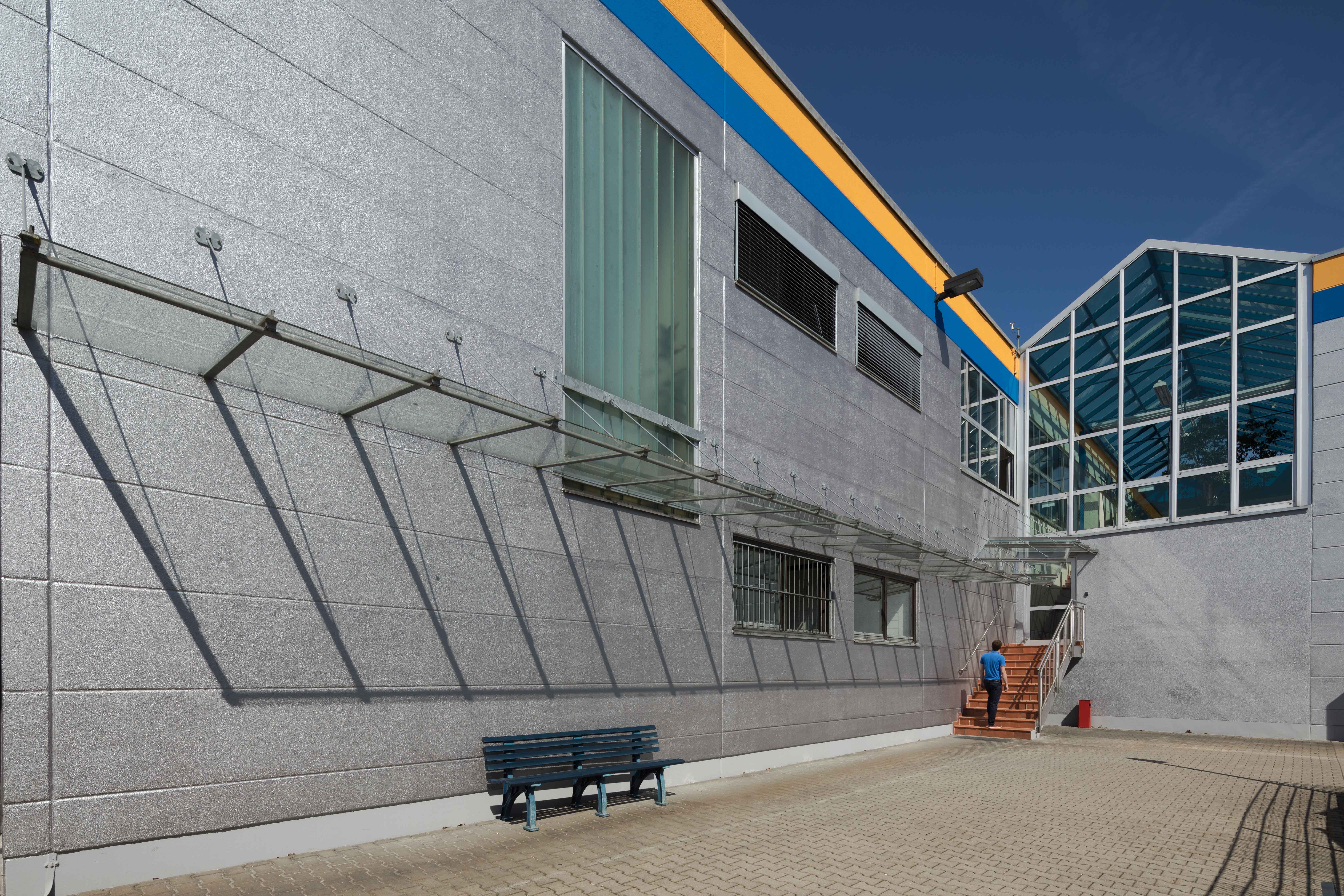 Edel silbrig glänzt die Halle der Strama-MPS in Straubing im Sonnenlicht, an der Oberkante ein gelb-blaues Band in den Unternehmensfarben. Eine moderne Metallfassade könnte man meinen, doch der alte Firmensitz täuscht Echtmetall nur vor – das Gebäude ist aus Porenbetonelementen gebaut. Das zeigt sich jedoch erst beim genauen Hinsehen: Dann erkennt man die grobkörnige Betonstruktur, edel metallisch beschichtet mit Capadecor Metallocryl Exterior.