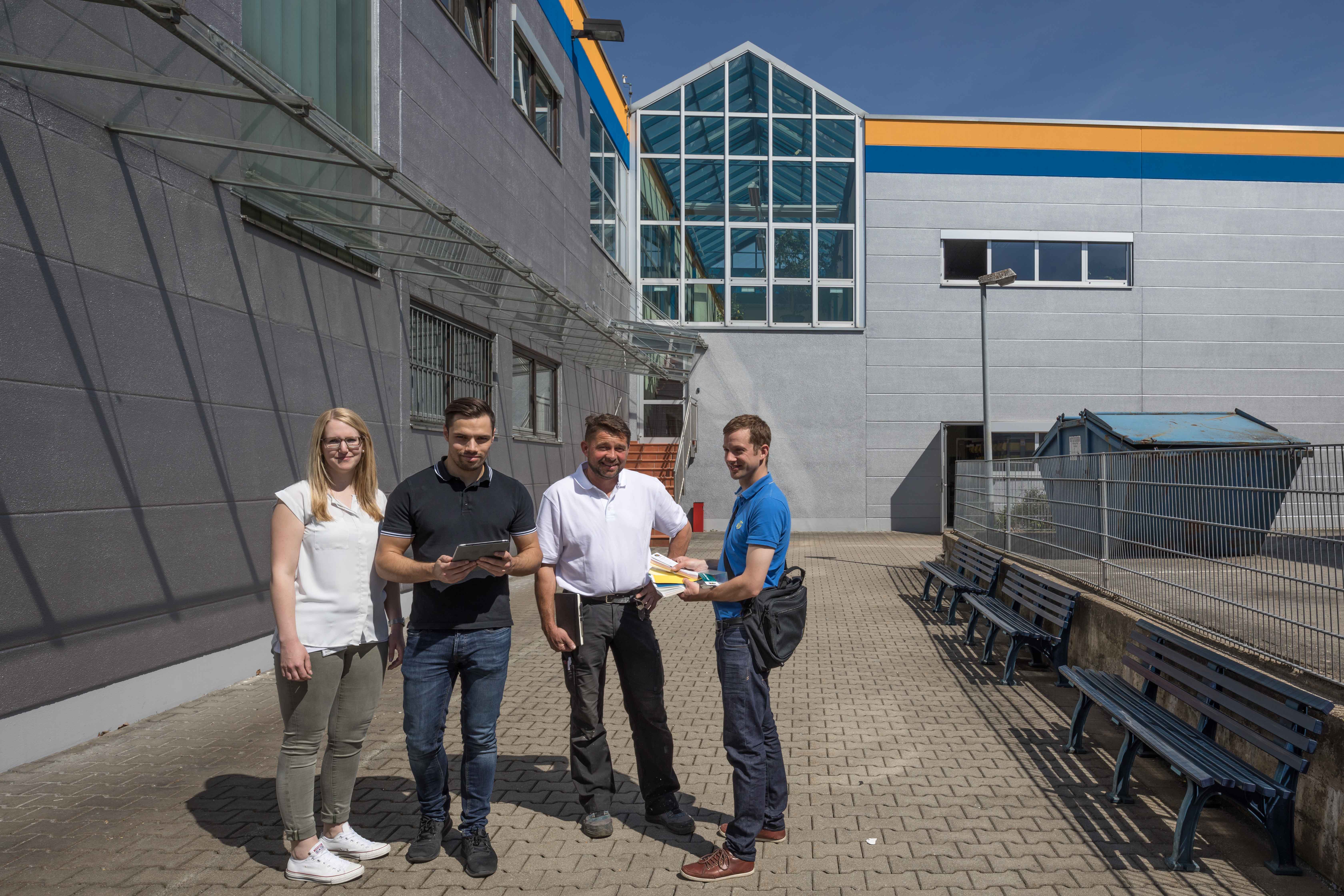 Metallocryl Exterior trugen mehrere Maler gleichzeitig mit dem Farbroller auf. „Dabei kam uns die begrenzte Feldgröße der Porenbetonsteine mit 60 cm Höhe zugute, dadurch konnte das übliche Nachstrukturieren enfallen. Wir arbeiteten immer in eine Richtung, und ein gleichmäßiger Metallglanz war da“, freut sich Malermeister Helmut Renner. Üblicherweise wird Capadecor Metallocryl Exterior erst gleichmäßig aufgebracht und quer verteilt und dann in eine Richtung nachgerollt, um eine möglichst einheitliche Ausrichtung der Metallic-Pigmente zu gewährleisten, so dass die gerichtete Metallstruktur entsteht. Strama-MPS-Geschäftsführung und Mitarbeiter sehen die metallisch glänzende Fassade ihrer alten Porenbetonhalle gerne. „In erster Linie ging es ja um einen Renovierungsanstrich und den Gebäudeerhalt. Nun haben wir den schönen Mehrwert einer metallisch glänzenden Fassade in den Firmenfarben, die gut zur neuen metallverkleideten Halle passt und unser Arbeitsspektrum als metallverarbeitendes Unternehmen eindrucksvoll darstellt“, erläutert Johann Groß, Projektleiter bei der Strama-MPS. Maler Renner ergänzt: „Am schönsten glänzt die Halle bei sonnigem Wetter, denn der Metallglanz lebt ganz klar vom Lichteinfall.“