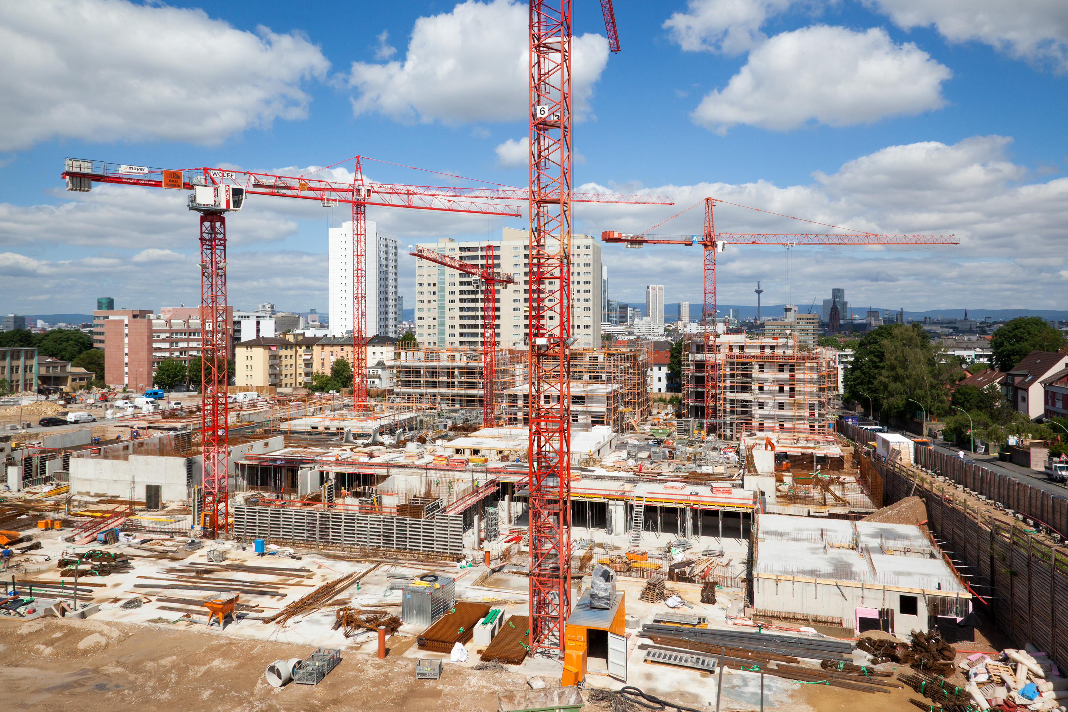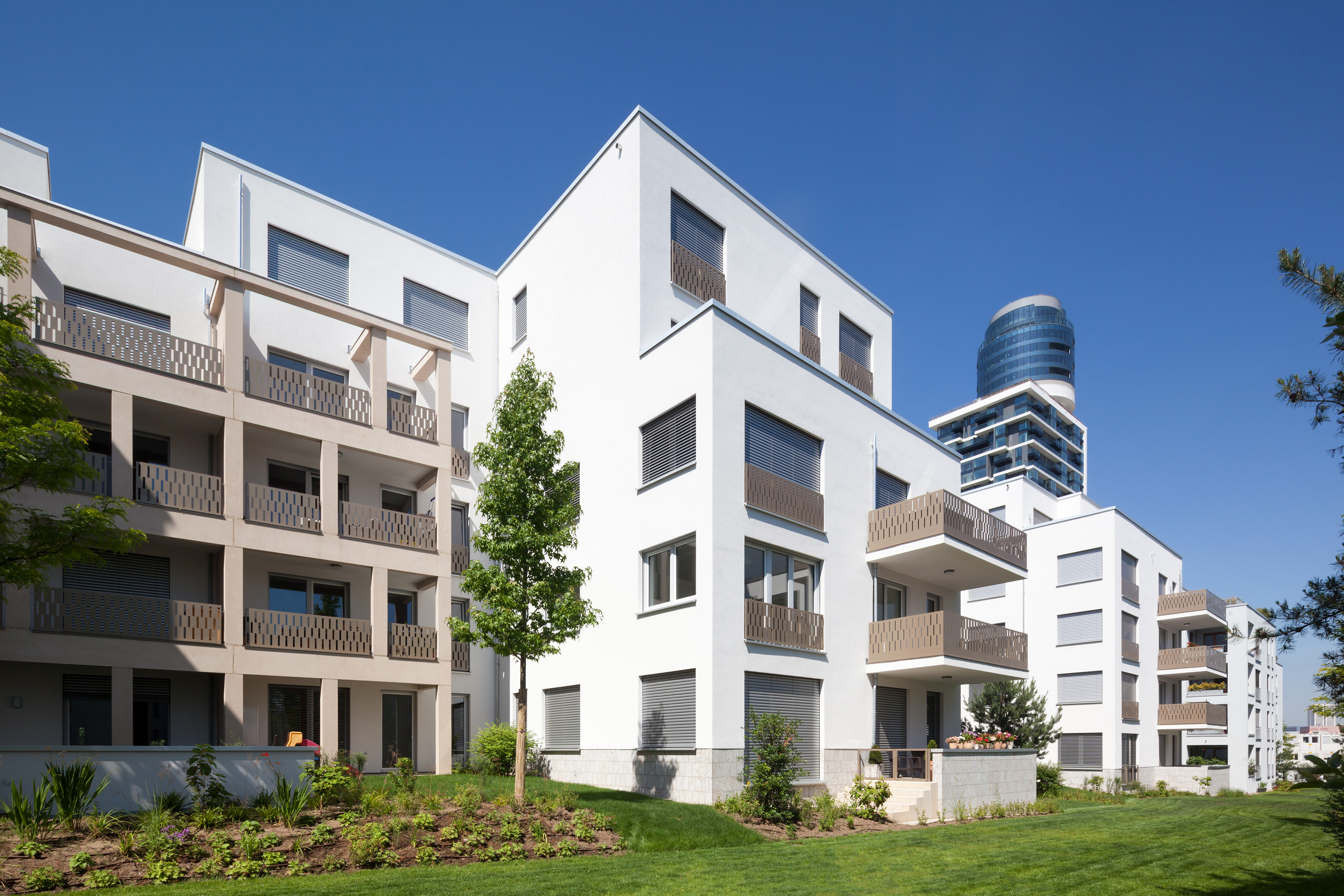 Rund um den neuen Turm entsteht ein Wohnquartier mit viel Atmosphäre, hervorragender Infrastruktur, kurzen Wegen in die Innenstadt und ins Umland. Die im Baufeld 1 mittlerweile fertig gestellten, insgesamt sechzehn Stadtvillen zeichnen sich durch eine besonders anspruchsvolle und vielfältige Architektur aus. Sie wurden individuell von den vier Preisträgern eines Architektenwettbewerbs entworfen, der eigens für das Henninger Areal ausgeschrieben war. Kein Haus gleicht dem anderen und doch fügen sich alle Gebäude harmonisch in das gestalterische Gesamtkonzept ein. „Der individuelle Charakter der einzelnen Häuser wird hervorgehoben durch die Variation in Form, Farbe, Fassade und Materialien. Unterschiedliche Beputzarten, Fensterformate und Oberflächen unterstreichen ihre Eigenständigkeit“, betont Marcus Wiesendanger, Geschäftsführer der Conceptaplan GmbH, die das Projekt im Auftrag der Quartier am Henninger Turm GmbH & Co. KG entwickelt und realisiert hat.