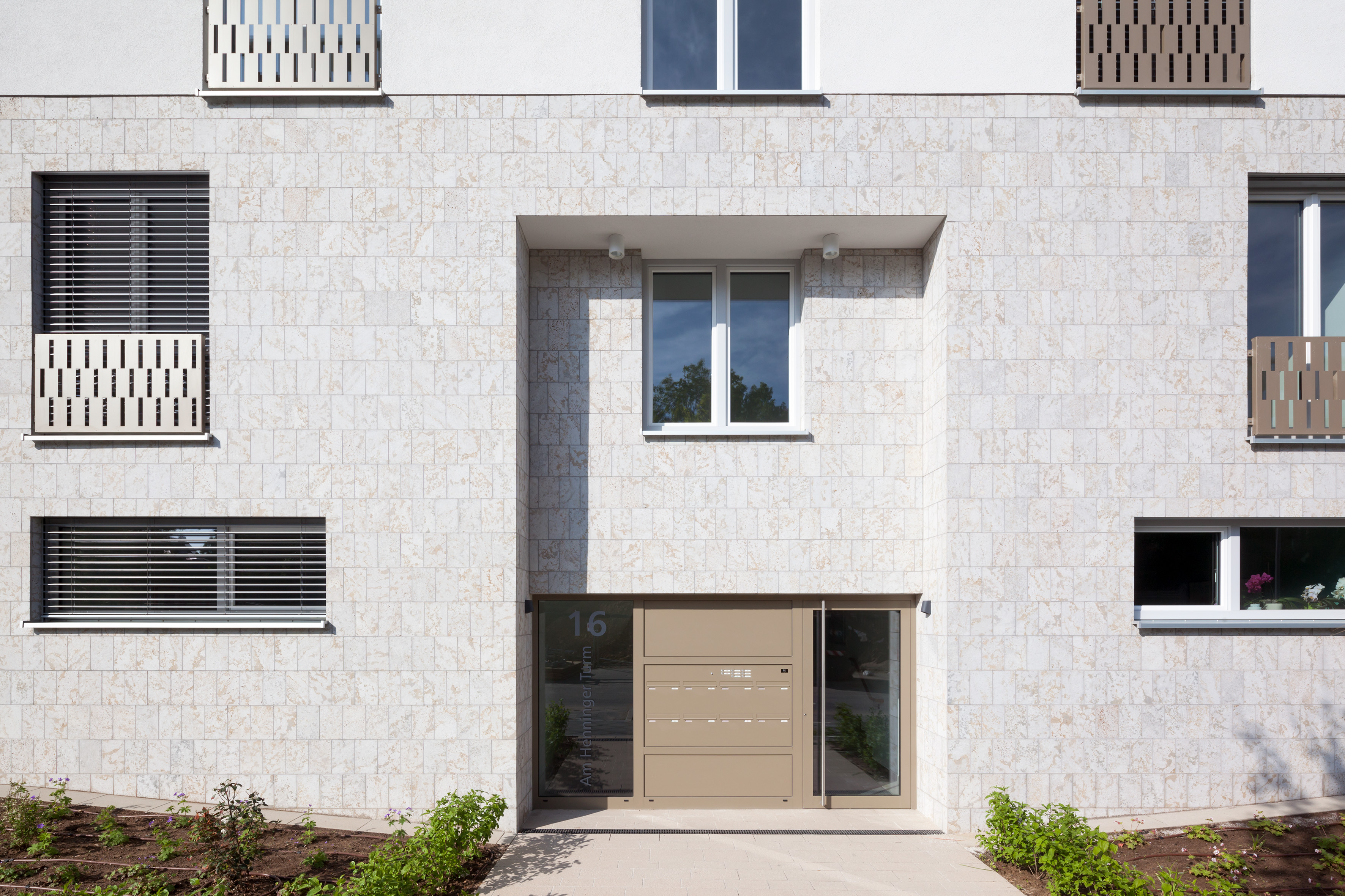 Eine architektonische Besonderheit war die Dämmung von Fassadenelementen mit Natursteinbekleidung. Einzelne Gebäude des Ensembles sind aus gestalterischen Gründen im Erdgeschoss und teilweise auch bis zum zweiten Stock mit Platten aus Muschelkalk verkleidet. „Gemeinsam mit Dr.-Ing. Heribert Oberhaus von der Ingenieurgesellschaft Bauforschung Oberhaus mbH haben wir eine Lösung gefunden, um die Natursteinplatten zulassungskonform auf dem WDVS aufzukleben“, berichtet Westerberger. Insgesamt wurden an dem Objekt ca.1.500 Quadratmeter Natursteinfassade auf WDVS hergestellt.