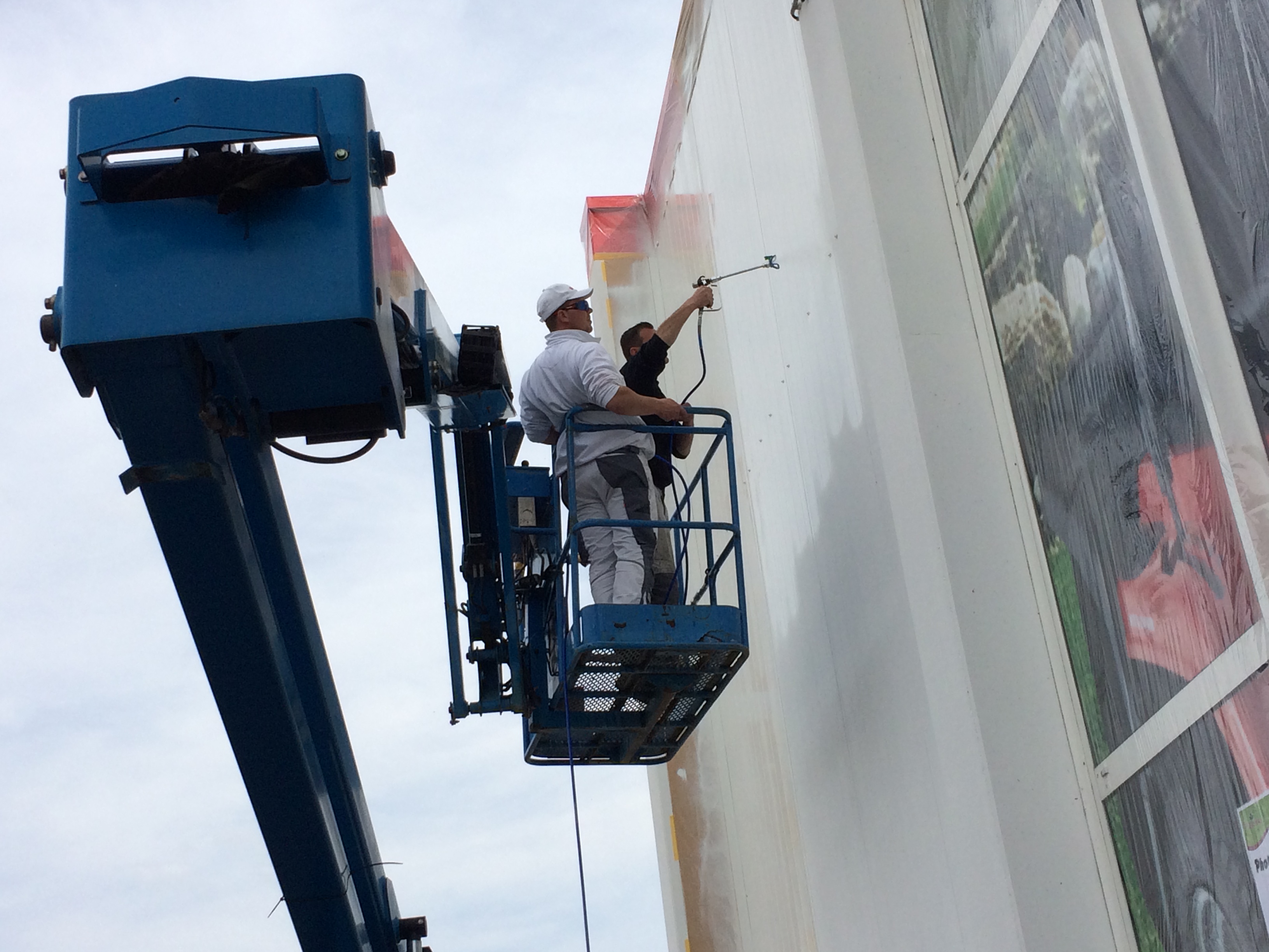 Mit Airless-Gerät und Hubsteiger Fläche machen