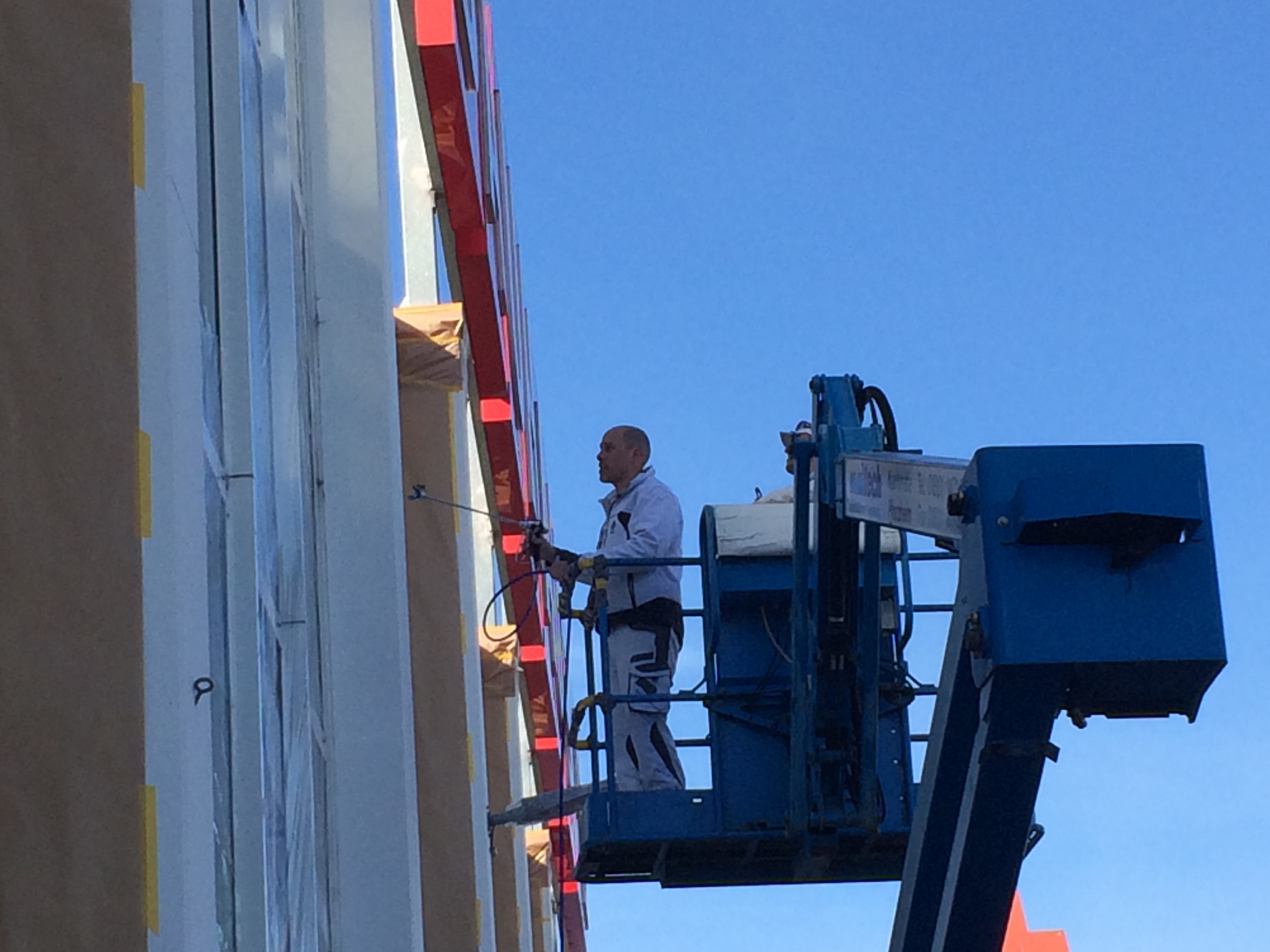 Den Malermeister freute es besonders, dass durch das Arbeiten vom Hubsteiger aus keinerlei Ansätze an der Metallfassade zu sehen waren. Bihler war mit zwei Mannschaften zu zwei bis vier Malern dort insgesamt ca. vier Wochen beschäftigt. Der Einsatz des Hubsteigers und des Airless-Spritzverfahrens ist nicht nur sehr effizient und wirtschaftlich. Es kann damit sehr flexibel etappenweise gearbeitet werden.