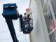(pressebox) (Ober-Ramstadt, 25.09.2017) Glanzvoller Auftritt für einen Hubsteiger, ein Airless-Gerät, Capacryl Haftprimer und den Einkomponenten-Lack Capacryl PU Satin an der Metallfassade des BAUHAUS in Pforzheim.