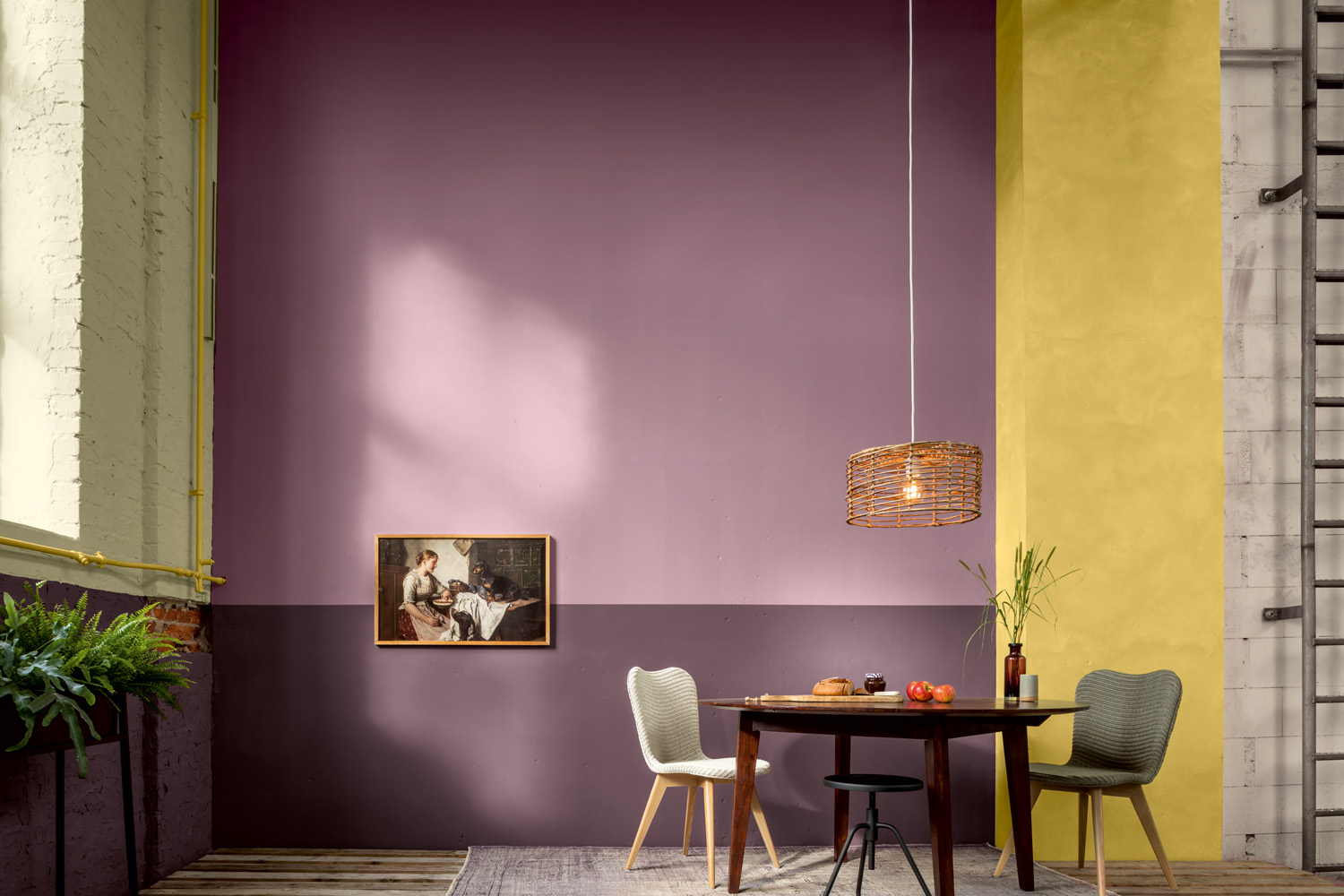 Pastelliger, sanfter und farbig zeigt sich die Farbwelt 2, wobei zartes Gelb und leichtes Violett eine zwar lebendige, aber klare, ernste Stimmung erzeugen. Interessant ist hier das wandelbare Mauvegrau „Cameo 10“, das je nach Nachbarfarben und Licht unterschiedliche Charaktere annimmt.