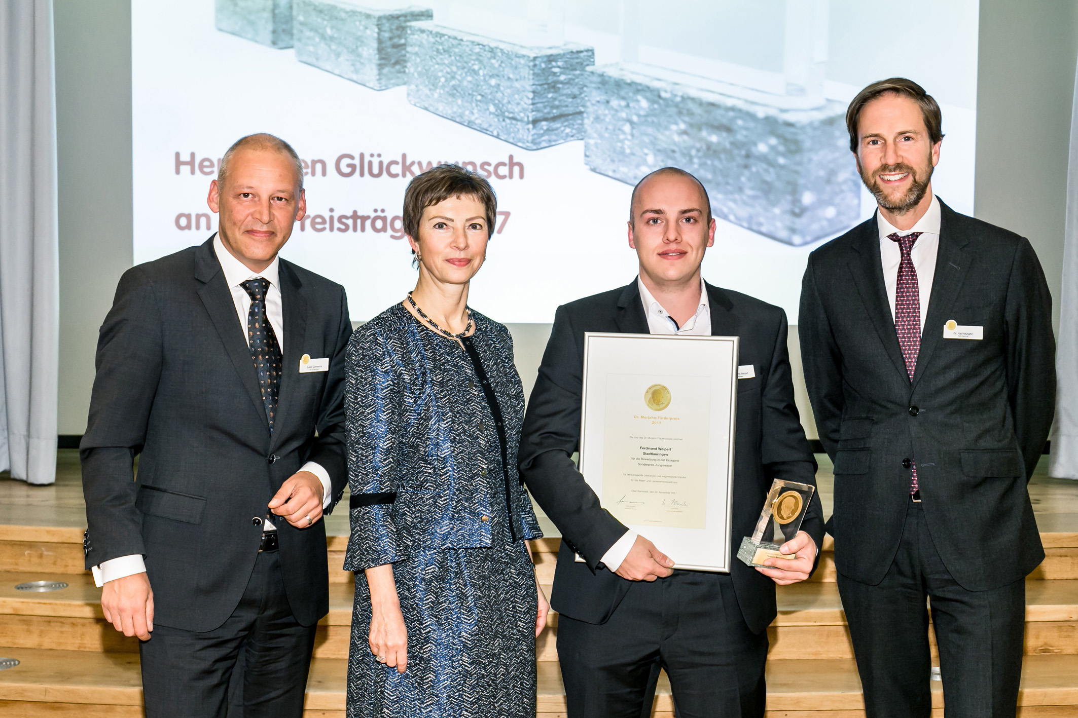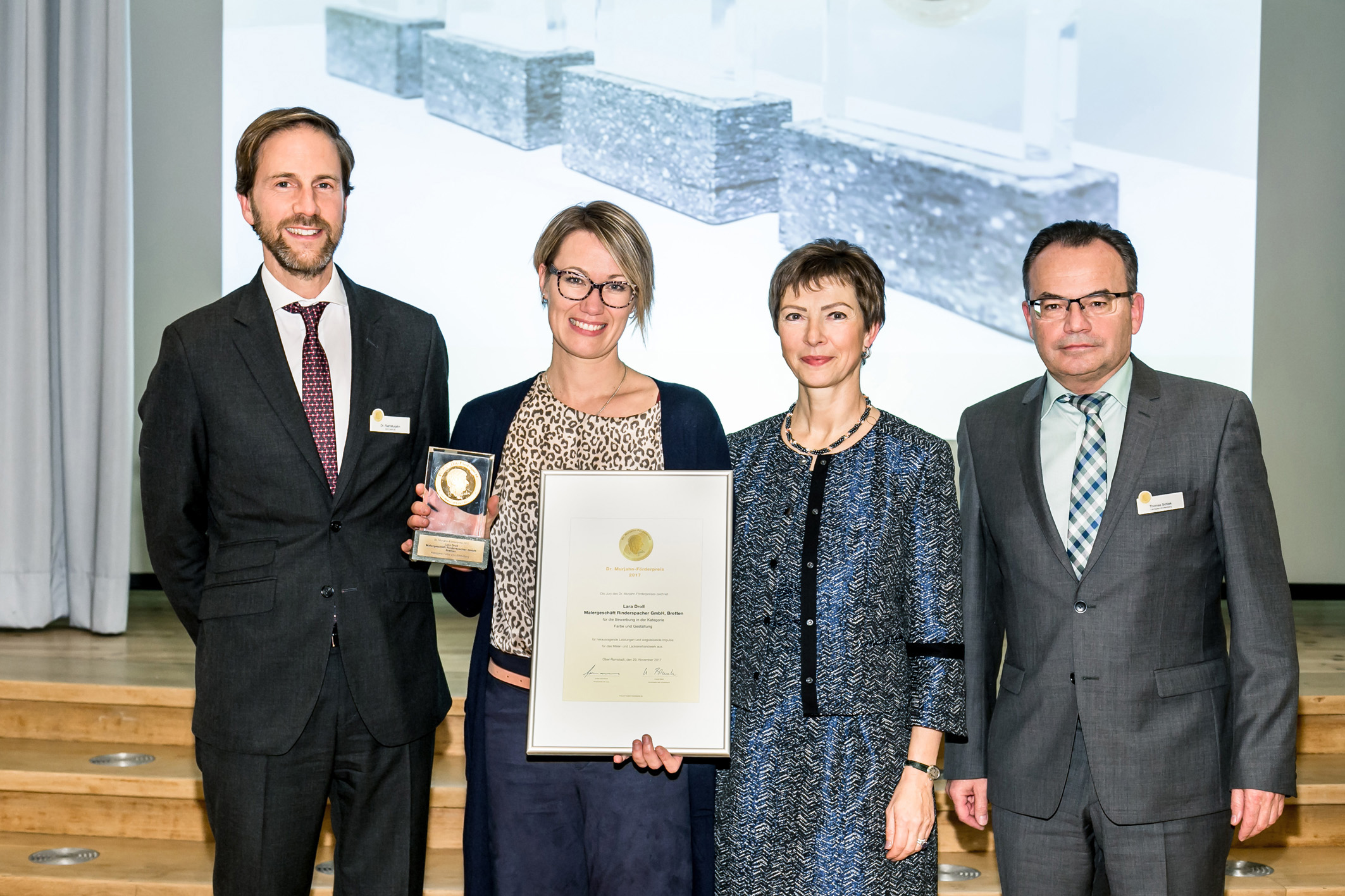 (pressebox) (Berlin, 11.12.2017) Preisträger beim Dr. Murjahn-Förderpreis 2017 sind Jens-Uwe Lutz und seine Mitarbeiter vom Malerbetrieb Lutz (Berlin), Lara Droll vom Malergeschäft Rinderspacher in Bretten und das Berufsbildungszentrum für Farbtechnik und Raumgestaltung der Maler und Lackierer Innung München Stadt und Land. Ihre wegweisenden Projekte für das Maler- und Lackiererhandwerk wurden mit jeweils 15.000 Euro dotiert. Den mit 5000 Euro ausgelobten Sonderpreis für Jungmaler erhielt Malermeister Ferdinand Weipert. Die Preisverleihung am 29. November im Meistersaal des Zentralverbandes des Deutschen Handwerks (ZDH) in Berlin war eingebunden in eine Veranstaltung des Bundesverbandes Farbe Gestaltung Bautenschutz, der Partner des Förderpreises ist.