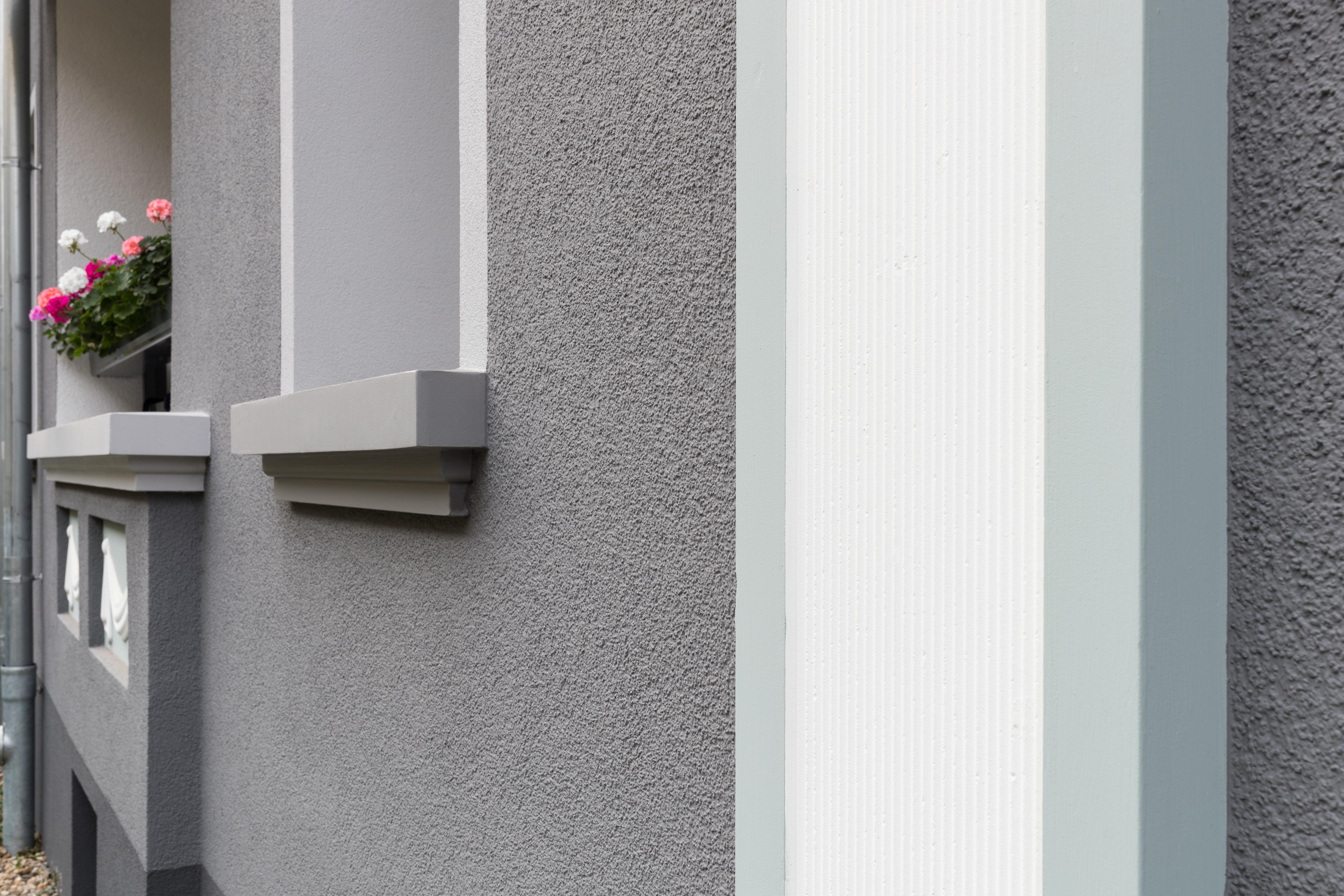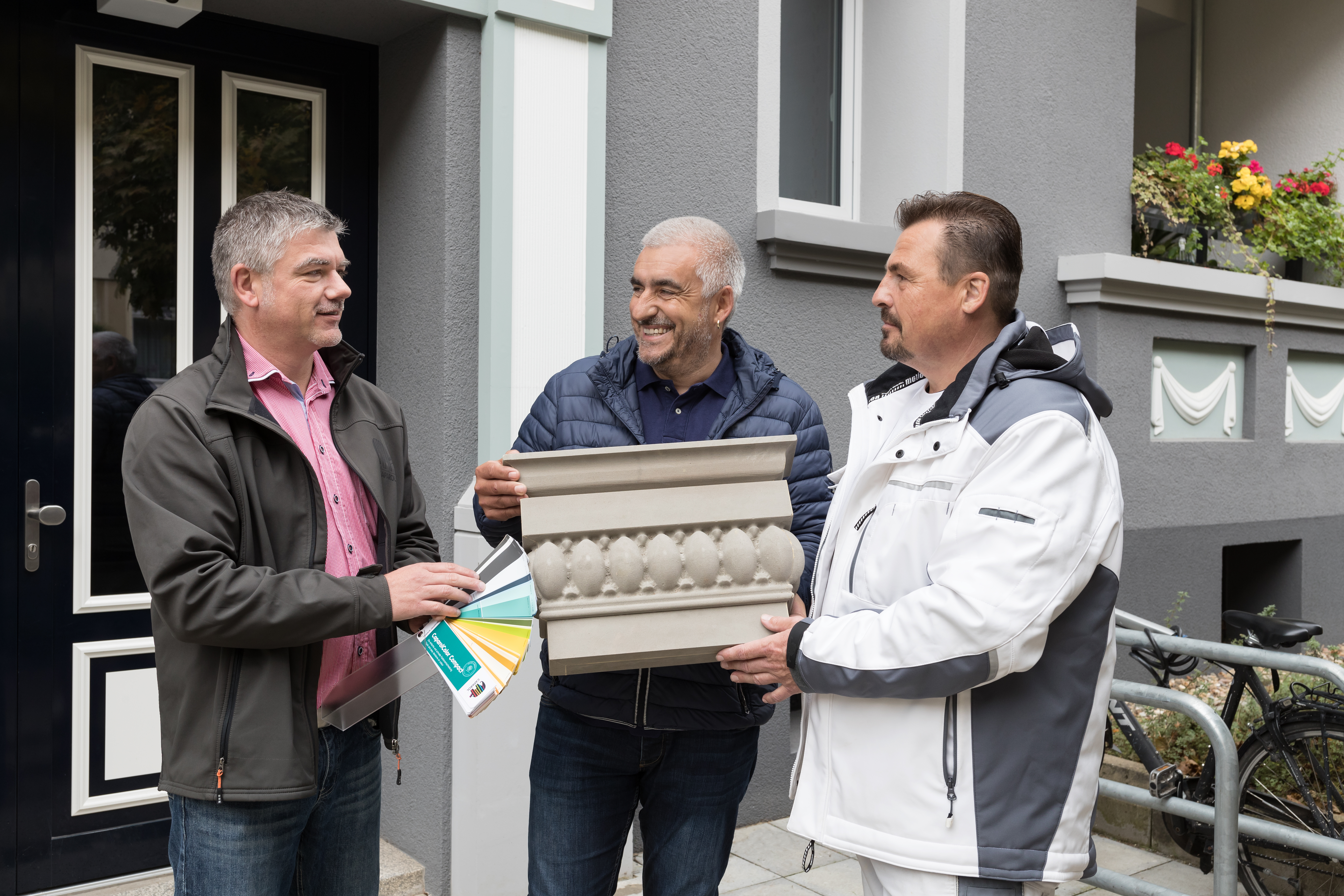 Caparol Außendienstmitarbeiter Kai Quedenfeld, der das Objekt betreute, betont an dieser Stelle das Zusammenspiel aller beteiligten Parteien: „Die Ornamente mussten präzise und unter einer bestimmten Zeitvorgabe hergestellt werden. Ohne das reibungslose Zusammenspiel und die vertrauensvolle Zusammenarbeit hätten wir die eine oder andere Schwierigkeit nicht meistern können. Insbesondere Prokurist Matthias Aue sowie Thomas Schwitzer vom Malerbetrieb Borrmann zeigten Expertise und Ausdauer, die Profile passend zu machen und die schwierige Montage durchzuführen.“ In Spitzenzeiten waren zehn Mitarbeiter des Betriebs im Einsatz, um dem Gebäude mit seinen 24 Wohneinheiten sein Gesicht wiederzugeben. Der abschließende Anstrich mit AmphiSilan Fassadenfarbe NQG³ taucht die Fassade in kräftiges, edles Grau. Durch die neuartige Siliconharz-Bindemittelkombination mit integrierten Nano-Quarz-Strukturen sorgt diese Fassadenfarbe für auf lange Zeit saubere, schnell abtrocknende Fassaden.
