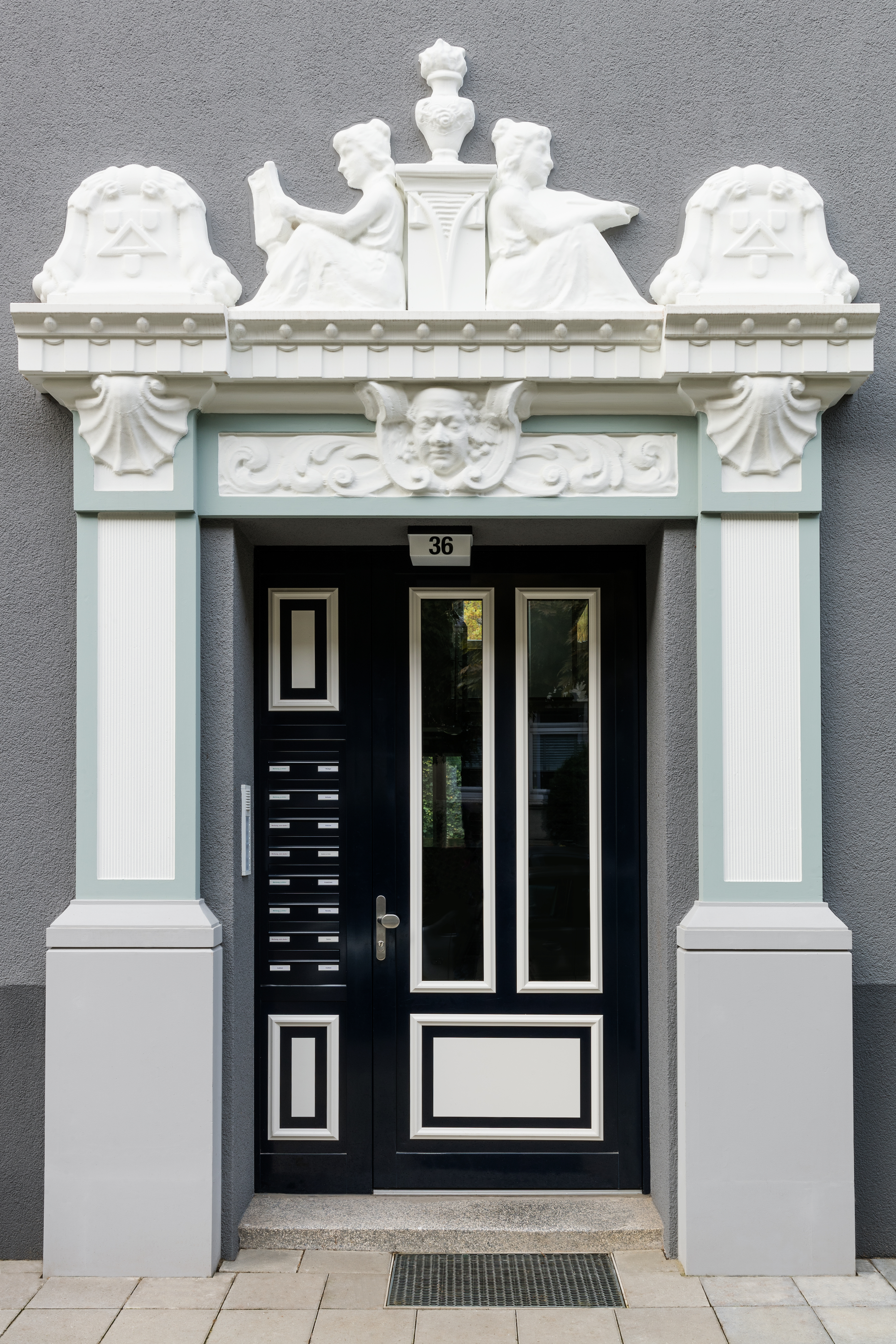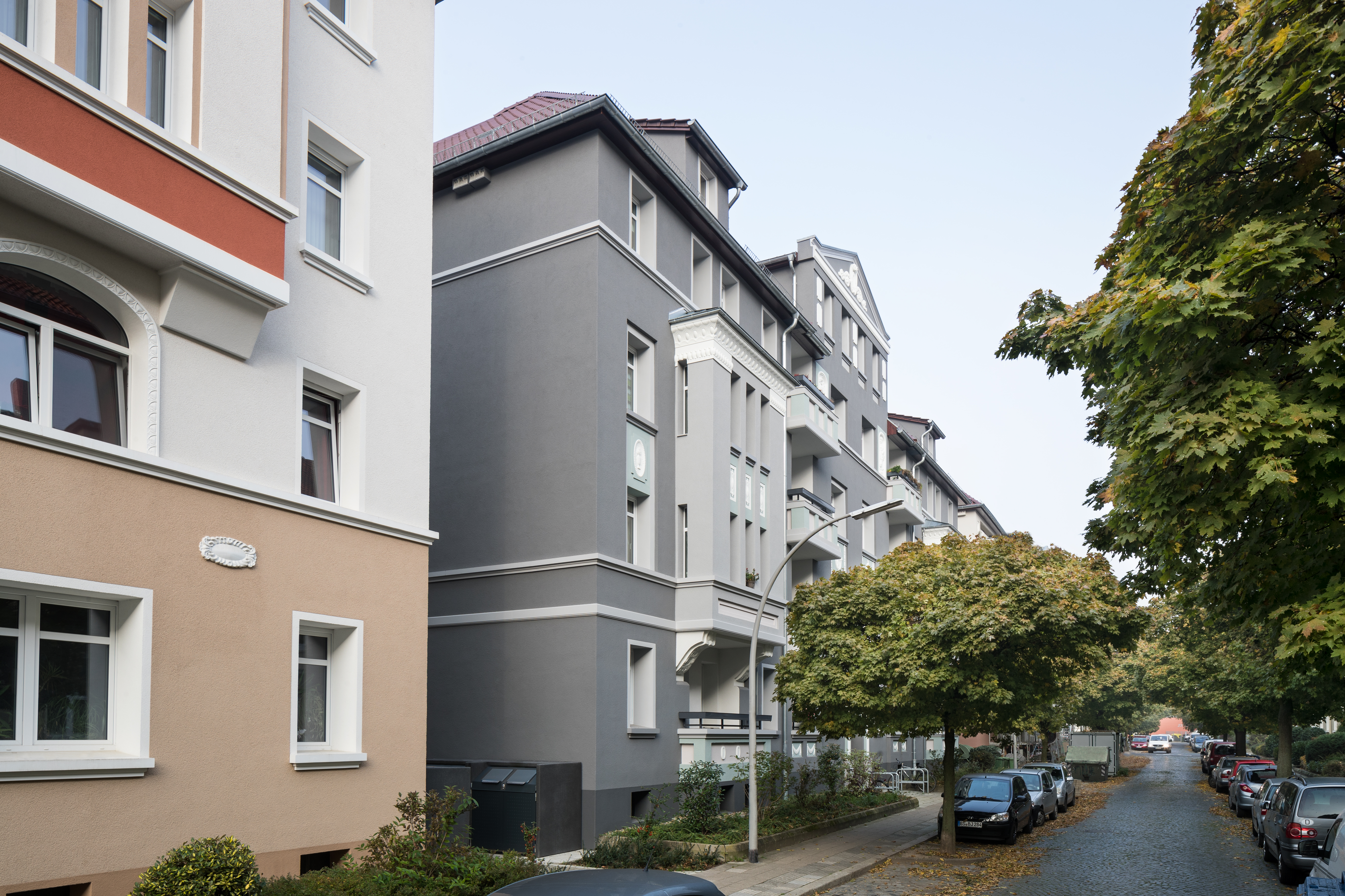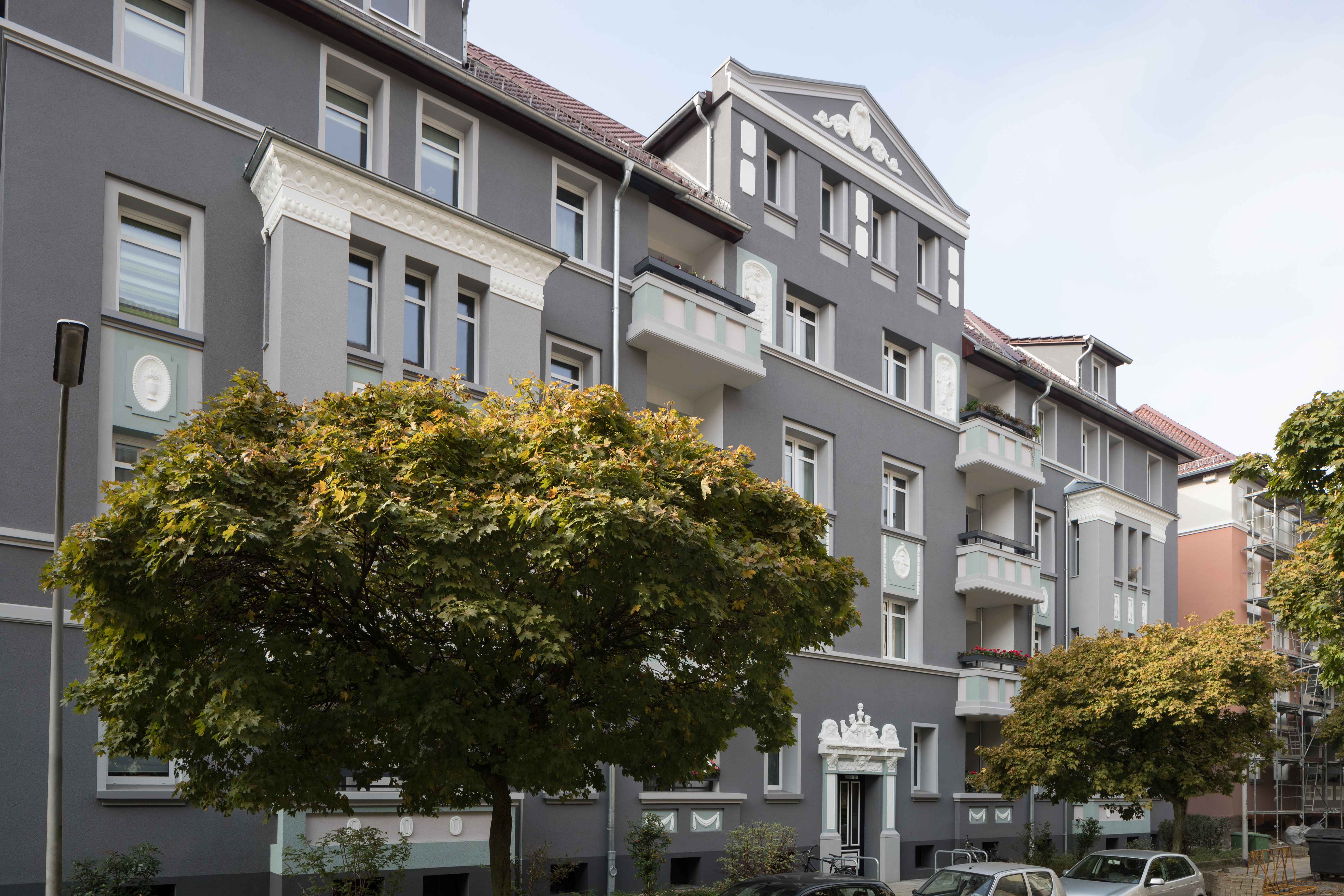 Mit der Vorgabe, dass sich die Farbgebung in die geschlossene Bebauung einfügen, jedoch trotzdem markant sein sollte, erarbeitete Architektin und Farbgestalterin Carmen Rubinacci vom CaparolFarbDesignStudio zwei Entwürfe: „Letztendlich fiel die Entscheidung auf ein edles, dunkles Grau - im Kontrast dazu bilden die Schmuckelemente, Brüstungen und Balkone in einem patinierten Kupferfarbton wirkungsvolle Akzente.“ Dieser Solitäransatz stieß bei der BBG auf so positive Resonanz, dass künftig jedes Gebäude nach diesem Prinzip saniert werden soll.
