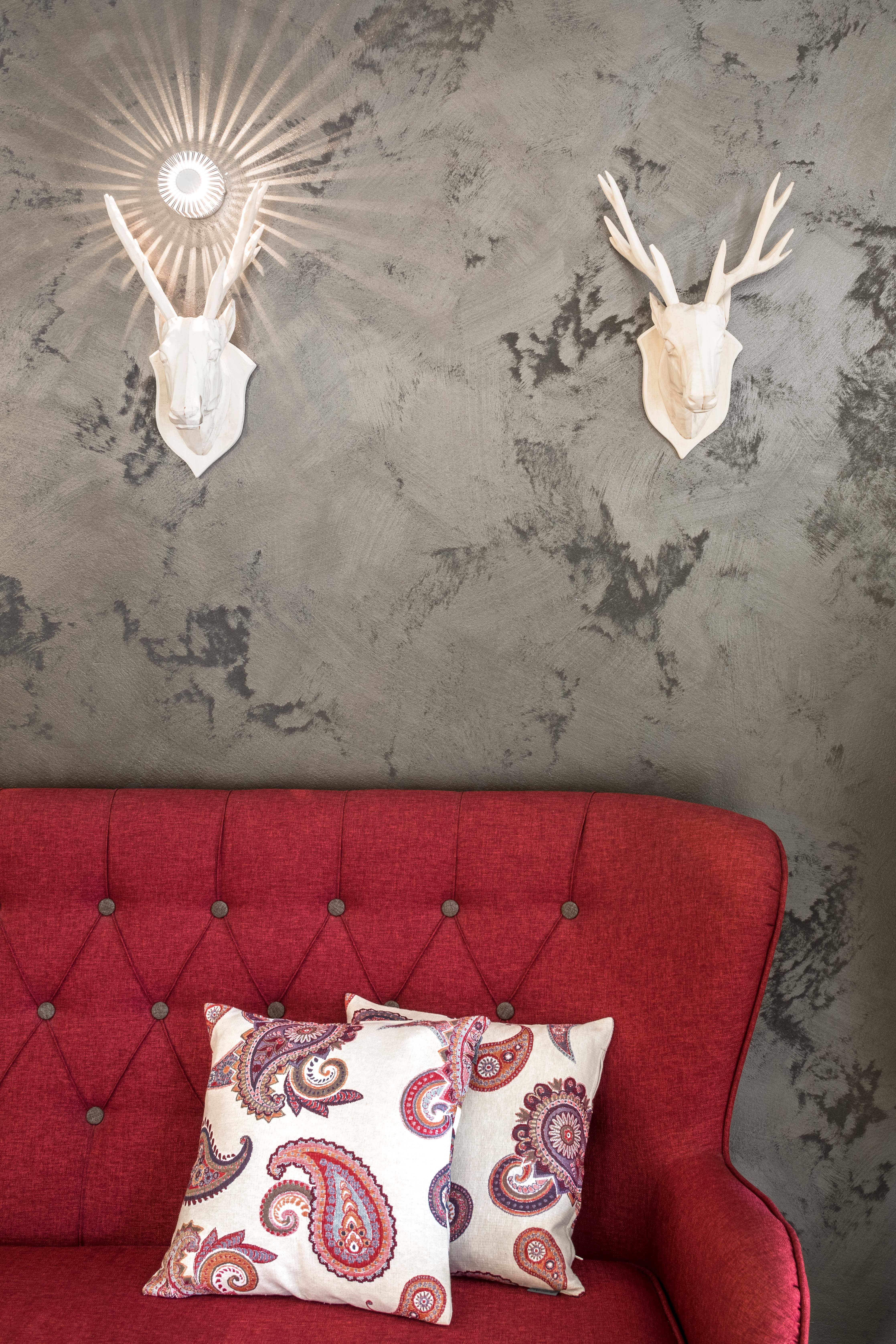 Die Gestaltung ist bis ins Detail durchdacht – zum Beispiel im Foyer. Holz, Pflanzen und Tieraccessoires verleihen dem Raum einen natürlichen Charakter. Das Auge aber zieht es unwiderstehlich zur dunkelbraunen Akzentwand. Die elegante, metallisch schimmernde Oberflächenbeschichtung in Metallocryl Perle ist durch eine Leuchte und drei Hirschgeweihe in Szene gesetzt: Die perfekte Bühne für ein rotes Sofa. Ein Blickfang, der mehr an ein Boutique-Hotel erinnert als an ein Pflegeheim.
