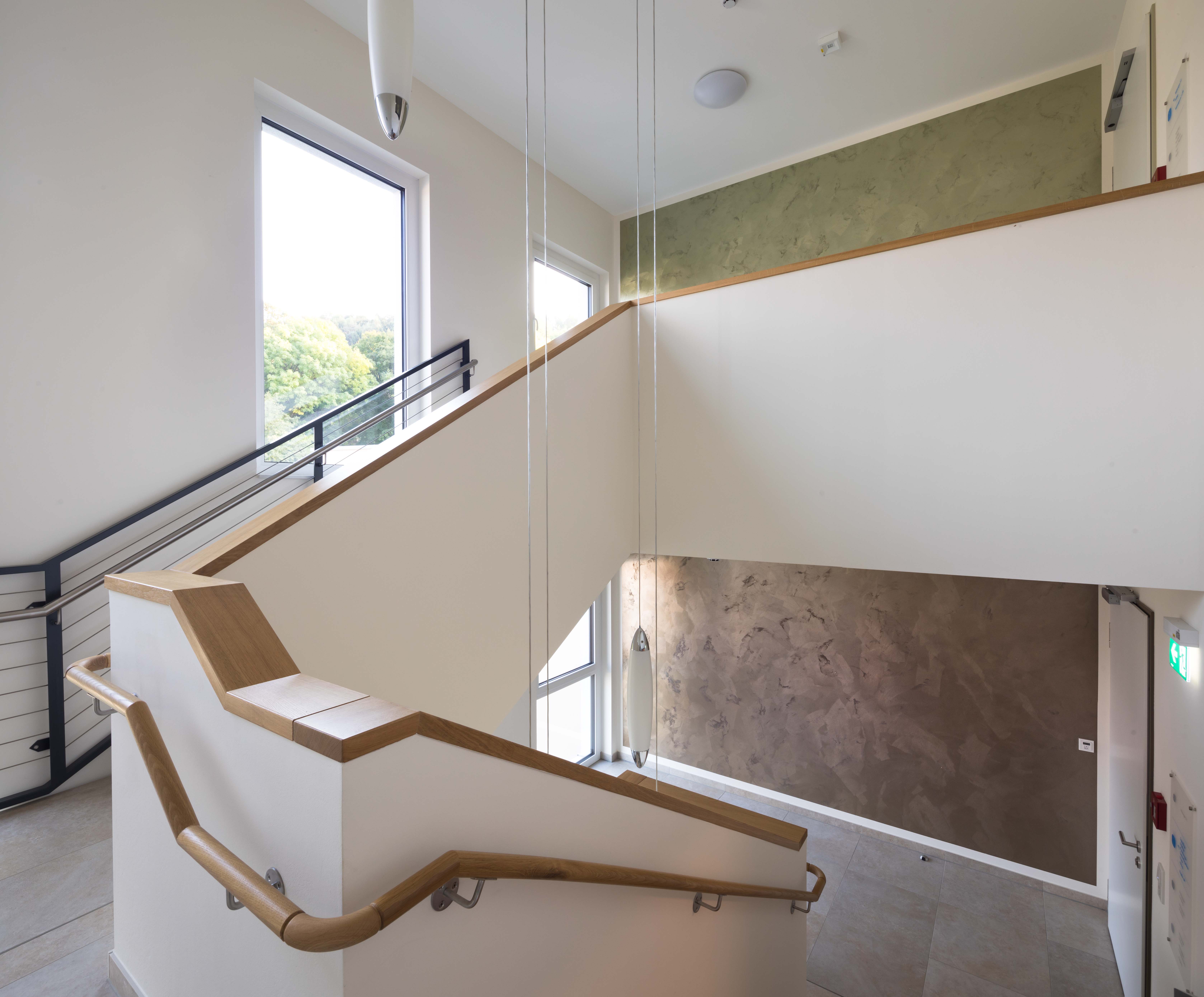 Dieser Eindruck setzt sich im Treppenhaus fort. Auf jeder Ebene ist die Stirnwand ebenfalls mit Metallocryl Perle beschichtet. Die Farben schaffen einen Bezug zur Farbstimmung des jeweiligen Geschosses. Sie sind eher verhüllt, wirken aber durch die Bürstenschlagstruktur individuell und sehr lebendig. Der Charakter der metallischen Oberfläche kommt durch das Streiflicht im Treppenhaus auf besondere Weise zur Geltung. Auch für Roger Eichenauer sind die Stirnwände ein Highlight. Der geschäftsführende Gesellschafter des ausführenden Malerunternehmens Herm. Hohmann (Fulda) betont die hohe Qualität des Entwurfs. Das Unternehmen hat sowohl die Arbeiten an der Fassade als auch die Innengestaltung umgesetzt. Eichenauer fasst die Zusammenarbeit mit Bauherrn und Caparol knapp zusammen: „Super. Alles perfekt geplant, begleitet und umgesetzt.“