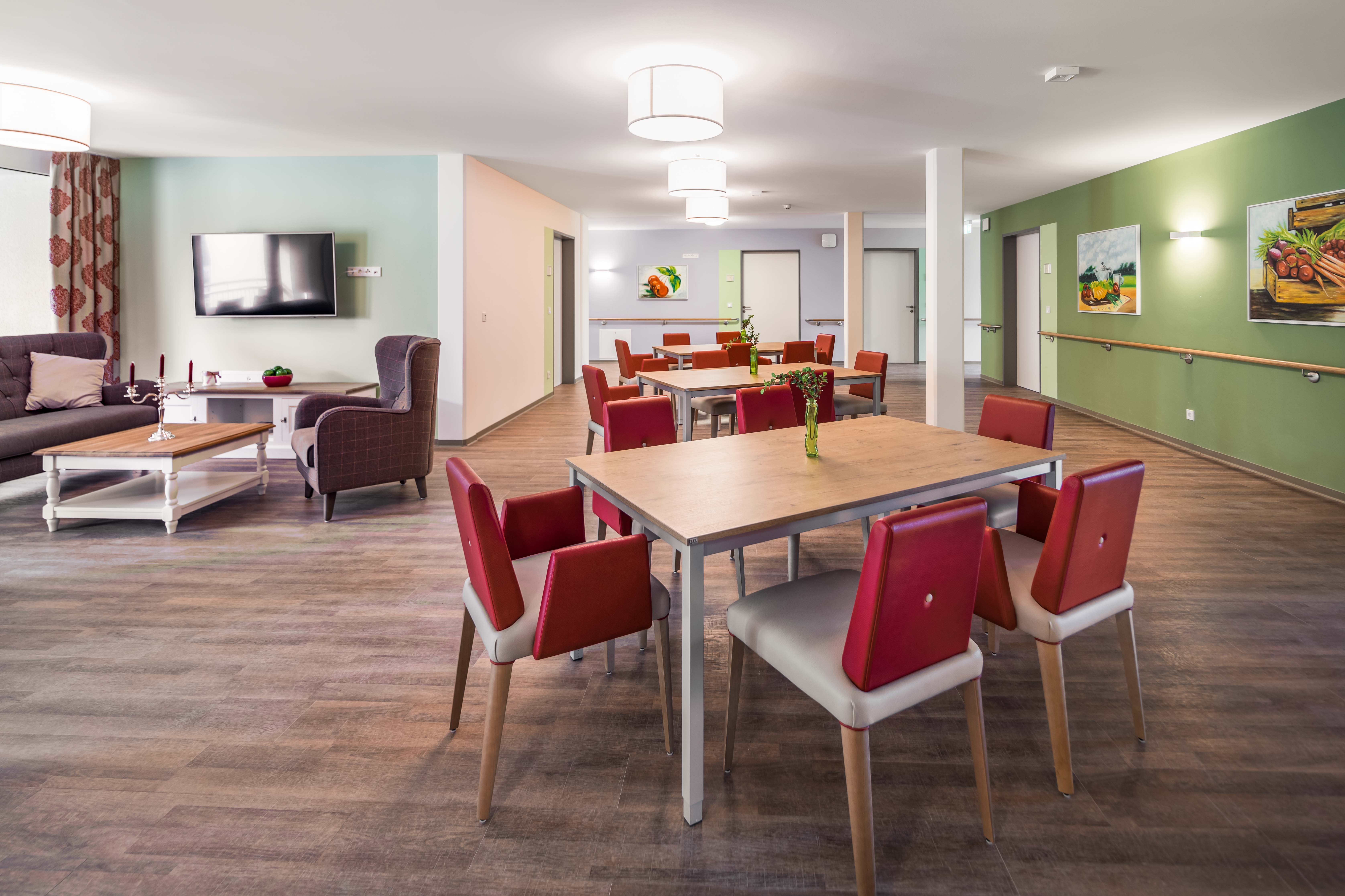Naturgemäß ist die Mobilität von pflegebedürftigen Menschen häufig mehr oder minder stark eingeschränkt. Farbdesignerin Martina Lehmann hat daher bei der Gestaltung der Innenräume besonderen Wert darauf gelegt, dass sich in jede Blickrichtung neue Farbeindrücke eröffnen. So ergibt sich auch bei eingeschränkter Beweglichkeit eine an die Außenwelt erinnernde Vielfalt von Eindrücken.
