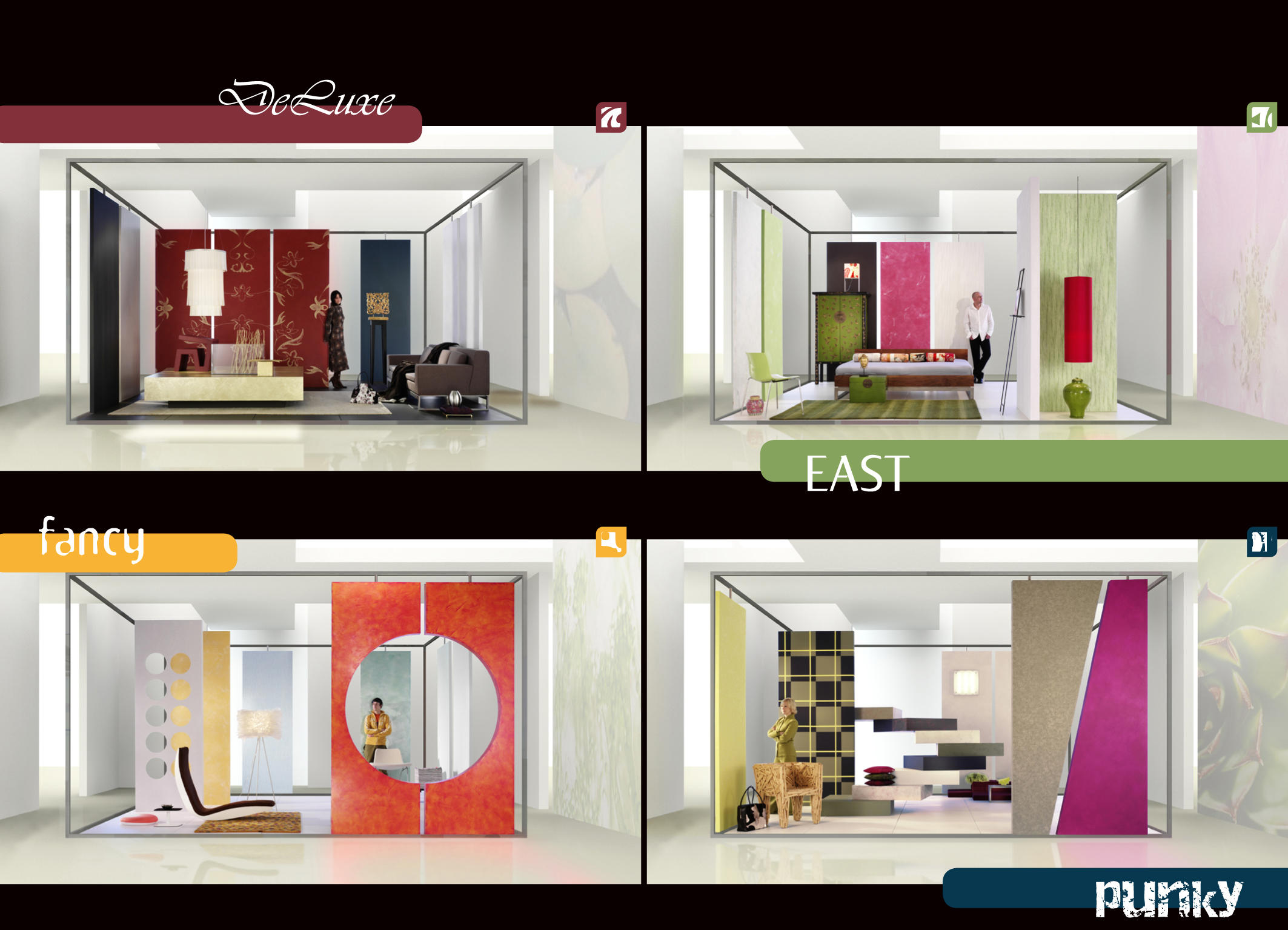 Zwei wesentliche Aufgaben standen im Sinne von Prägnanz und Vermittlungsmöglichkeit bevor: Eine Herausarbeitung und somit Reduzierung auf die wesentlichsten Töne, so daß eine klar wahrnehmbare Eindeutigkeit erzielt wird, und die gleichzeitige Beantwortung der Fragen: Was bedeuten diese Entwicklungen für die Gestaltung der raumgebenden Flächen wie Wand und Decke? Wie können diese den Trend transportieren bzw. ihm den passenden Rahmen bieten? Lassen sich die Farbtöne 1:1 übernehmen oder muß eine Anpassung an Raumfarbigkeiten erfolgen? Im Ergebnis wird jede Welt durch eine Zusammenstellung von fünf Farbtönen repräsentiert. Es ist eine Verknüpfung von Akzenttönen mit Farbtönen, die sich auch für große Wandflächen eignen.