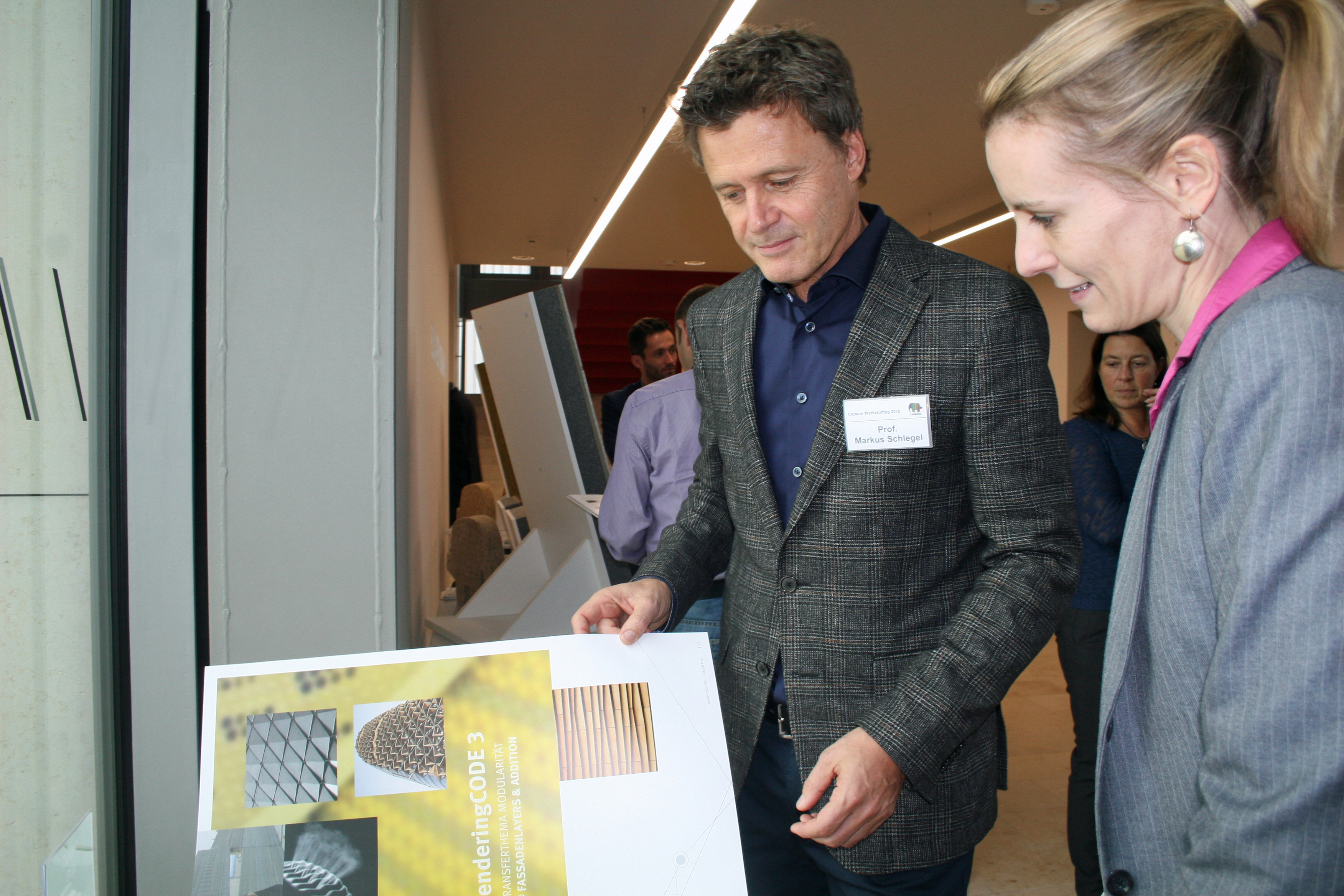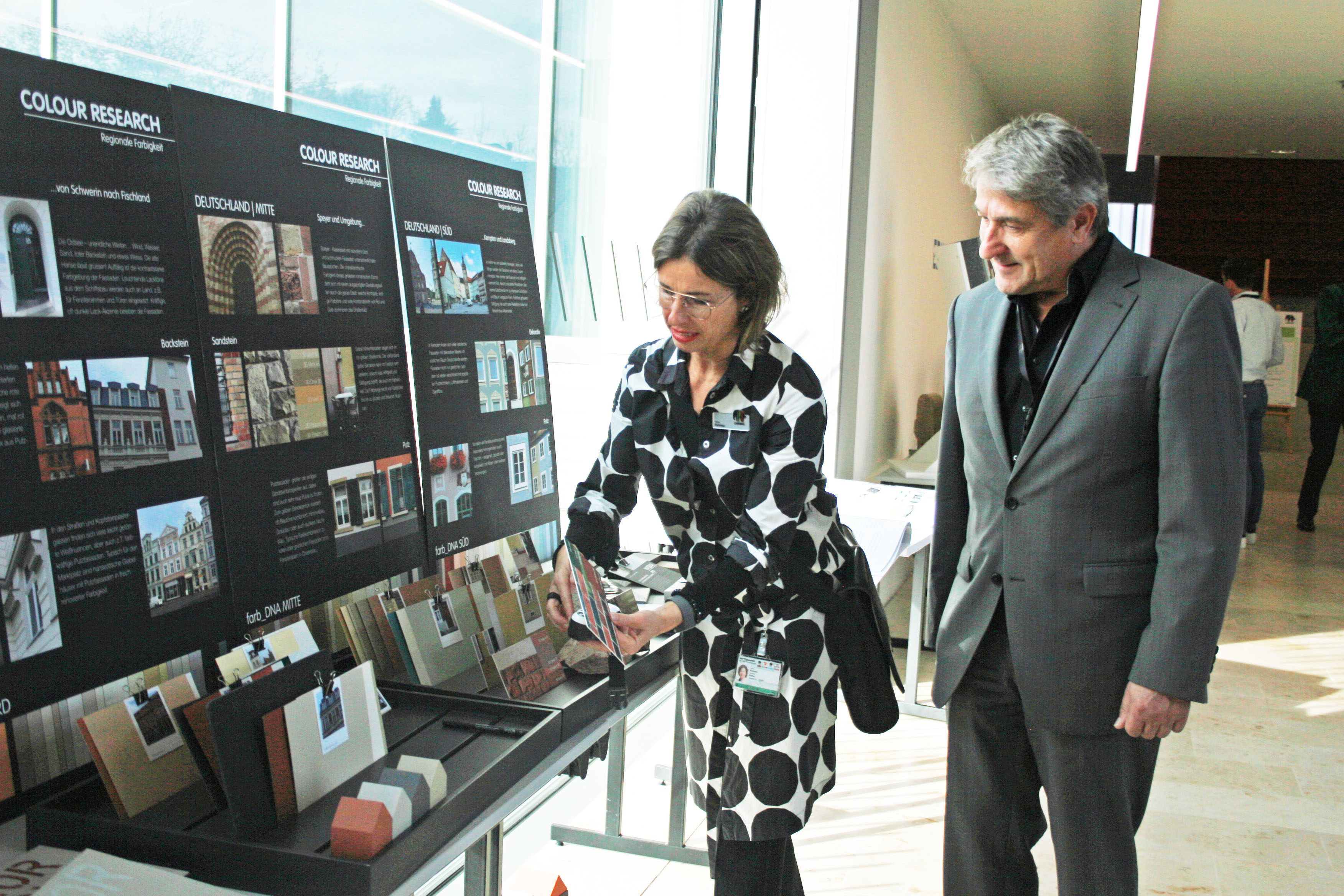 Funktionales Design stand erstmals auf der Tagesordnung des eher technikorientierten Werkstofftags. Doch die Referenten Margit Vollmert, Leiterin des Caparol FarbDesignStudios, und Professor Markus Schlegel, Prodekan Internationalisierung an der HAWK Hildesheim, verdeutlichten dem Auditorium, weshalb die Gestaltung als Zukunftsthema erkannt wurde. „Man kann nicht nicht kommunizieren“, zitierte Vollmert den berühmten Ausspruch des bekannten Kommunikationswissenschaftlers Paul Watzlawick: „Auch Fassaden kommunizieren.“ Sie bieten je nach Gestaltung Orientierung oder weisen auf die Nutzung des Gebäudes hin. Farben und Formen müssen dabei im Kontext betrachtet werden, zudem müssen Design und Funktion zusammen gehen. Gestaltung und Handwerk könnten hier viel voneinander lernen. „Architekten und Meisterschüler müssen zusammenarbeiten“, forderte Vollmert. Dass Städte typische Farbigkeiten aufweisen, verdeutlichte sie anhand umfangreicher, ortsbezogener Farbrecherchen: „Wir haben heute alle Möglichkeiten und sollten die richtigen Farben finden, die hinsichtlich Funktionalität und Umgebung passen – sie wirken in Zeiten der Globalisierung identitätsstiftend.“