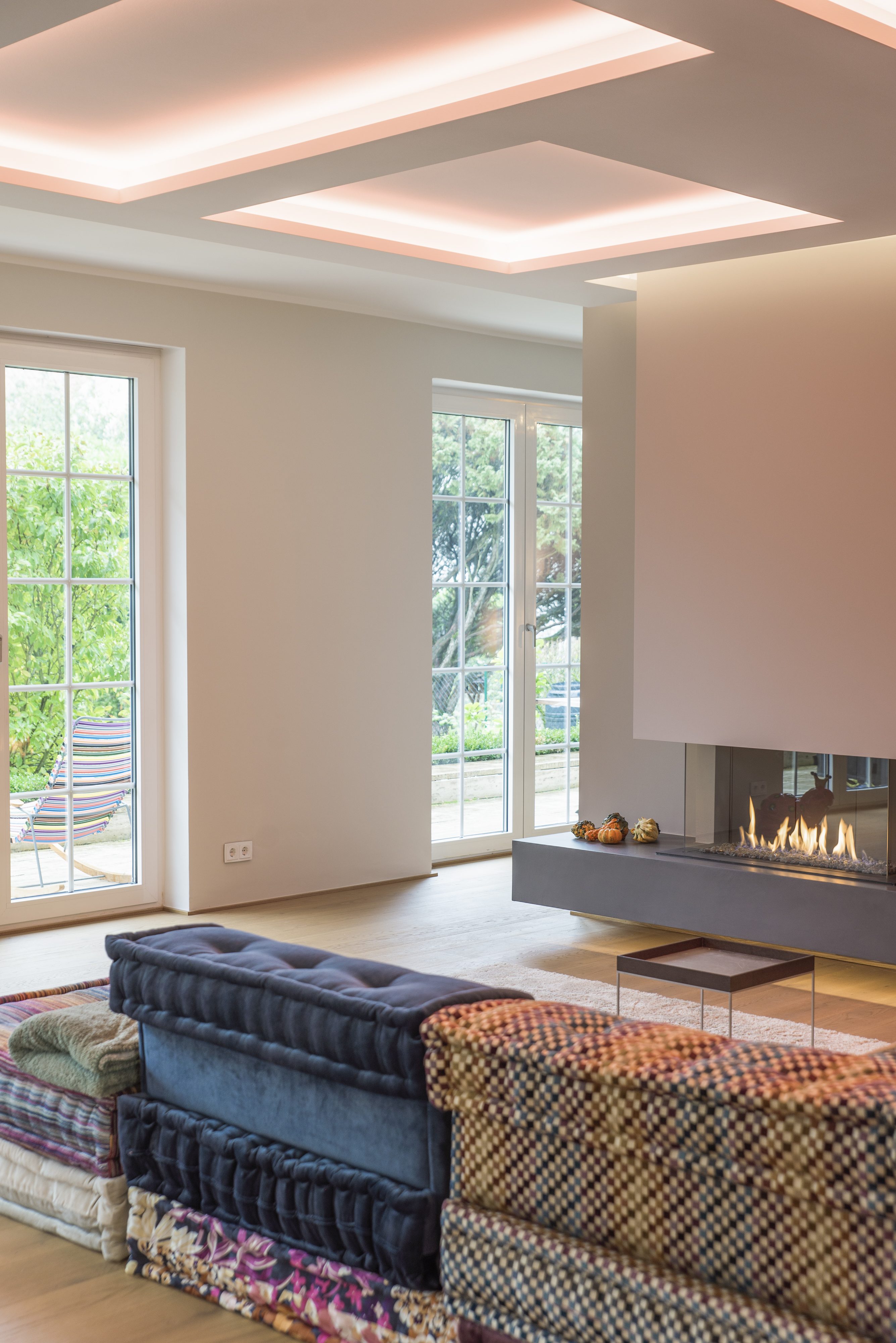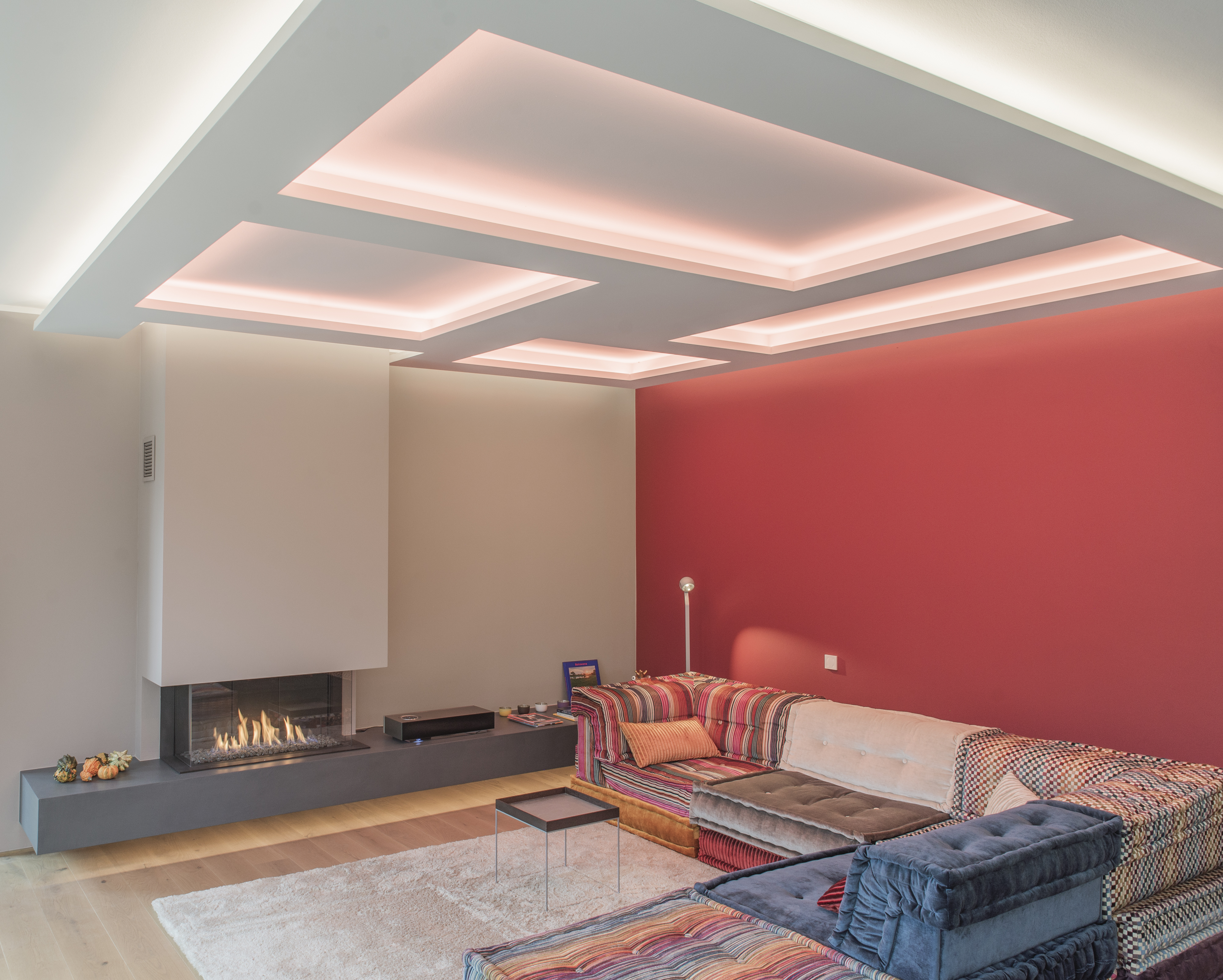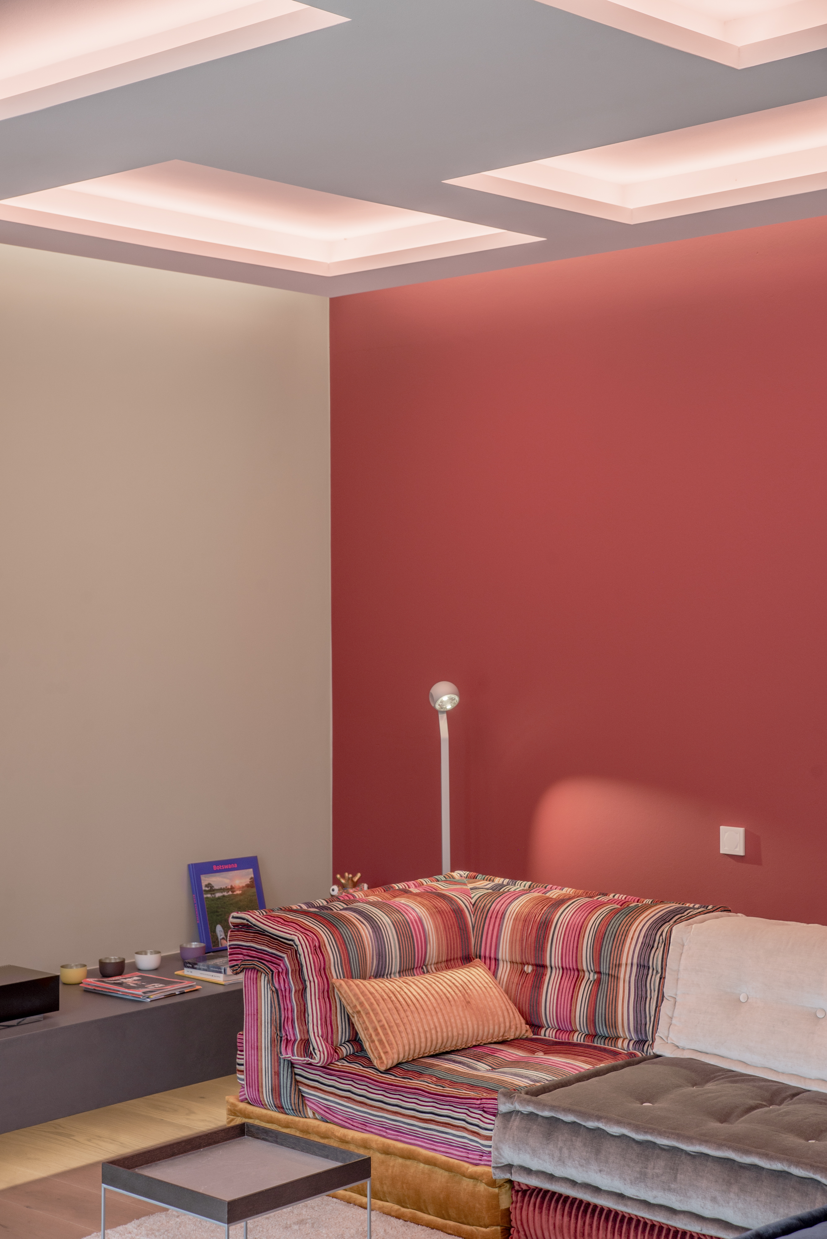 Sämtliche Maler- und Rigipsarbeiten – etwa die abgehängte Decke für die Leuchten - wurden vom Meisterbetrieb Farbpunkt Sobert & Ierardi ausgeführt, an den sich anspruchsvolle Kunden mit ihren vielfältigen und extravaganten Wünschen seit 2001 wenden. Giovan B. Ierardi hat auch die Kaminbank und die Sitzbank des Fernsehraums mit Pandomo Studio im Betonlook beschichtet. Er sagt: „Die brillanten, sehr gut deckenden CAPAROL ICONS-Farben sind auf dem Markt etwas ganz Besonderes. Da wir großen Wert auf Qualität legen, werden wir unseren Kunden in Zukunft die Farben der CAPAROL ICONS-Serie empfehlen.“