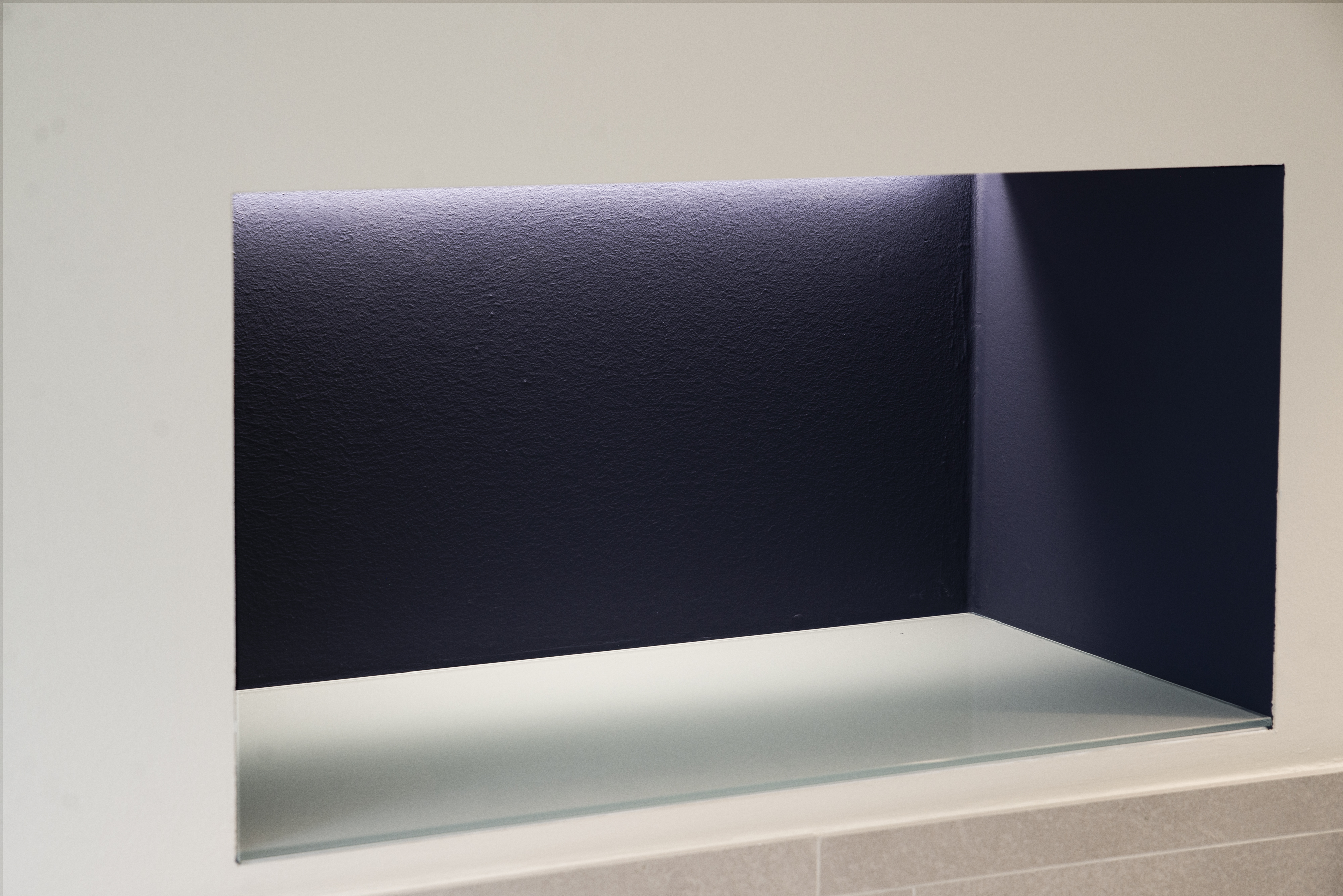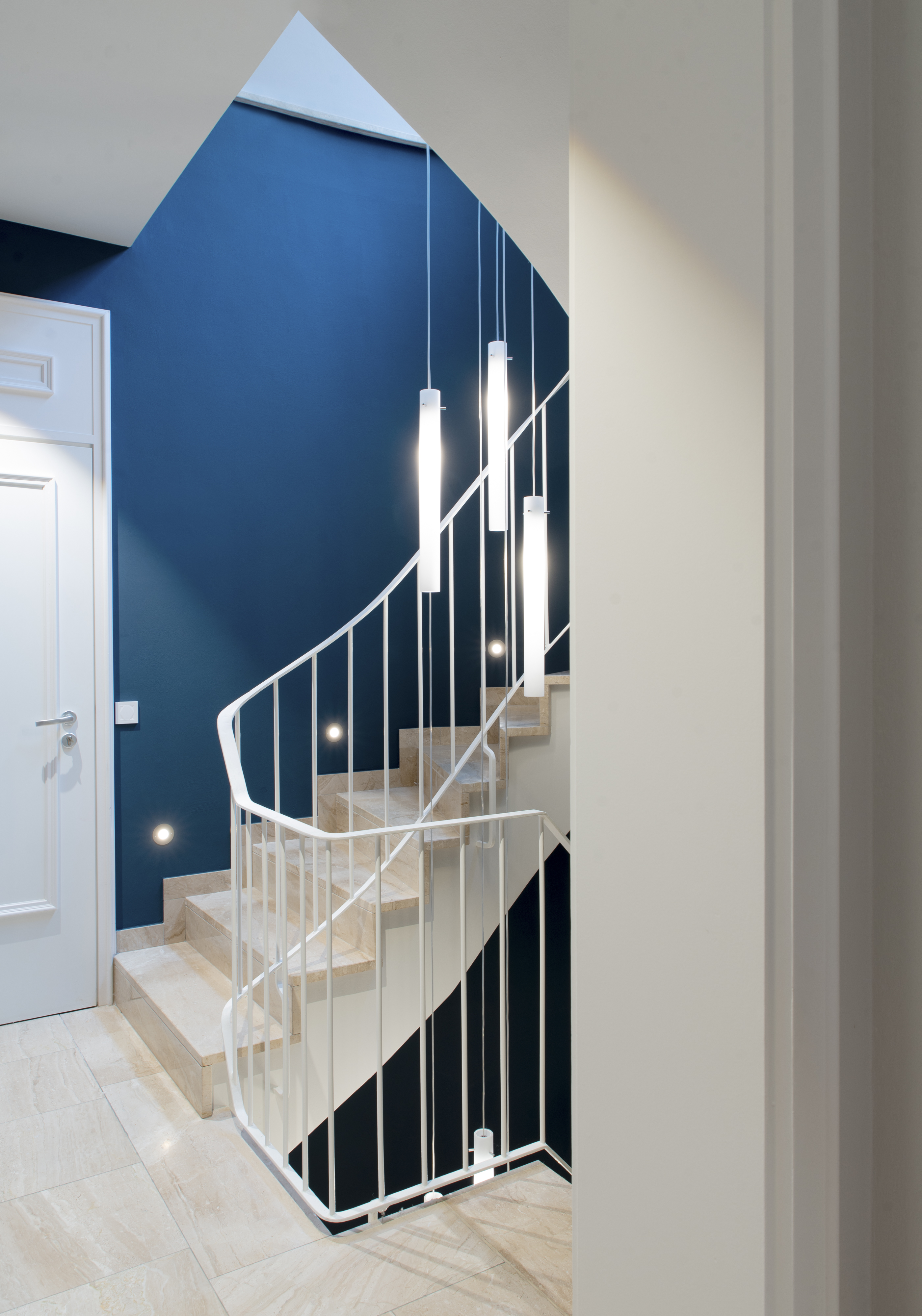 Im Treppenhaus begleitet das Petrolblau von „Skater“ den Besucher ins obere Stockwerk. Aus diesem atmosphärischen Blau heraus strahlen Lichtspots in Fußhöhe der Stufen wie Sterne im Nachthimmel. Diese Treppenstufenleuchten folgen dem runden Treppenlauf, sorgen für Trittsicherheit und betonen die warmen Steinstufen sowie die Architektur des Treppenhauses. Eine Lichtinstallation erstreckt sich über alle Stockwerke. Zur Aufhellung und Betonung der dunklen Wandflächen und als verbindendes Element zwischen den Geschossen wurde sie von der schrägen Deckenfläche bis ins Untergeschoss nach unten abgependelt. Mit feinen Stahlseilen verbunden sind lange Zylinder aus opalweißem, mattem, handgearbeitetem Glas, die das Treppenauge im Ganzen erhellen. Die matten weißen Gläser nehmen den opaken Charakter der Wandfarbe auf und stehen in einem schönen Kontrast zu dem recht dunklen, warmen Petrolfarbton. Diese Beleuchtung kann geschossweise zugeschaltet und gedimmt werden.