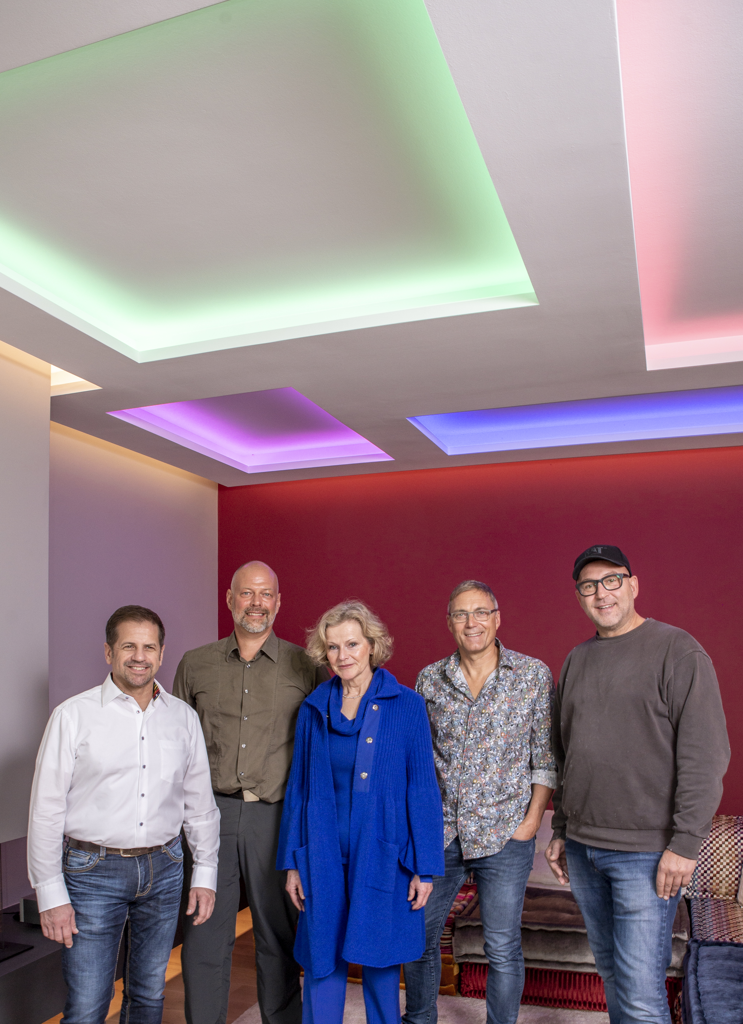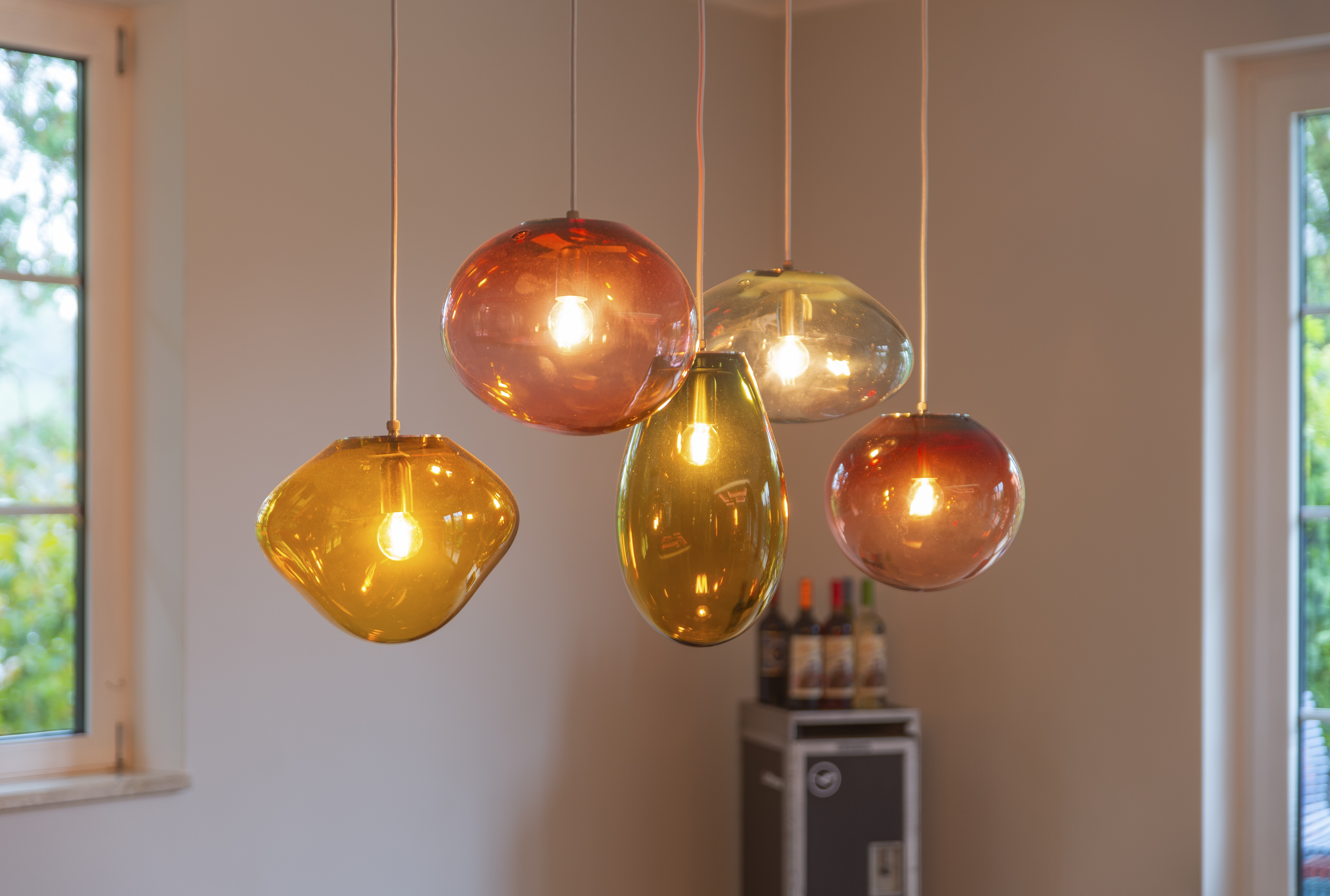 Weil die Sofalandschaft mit ihrem extravaganten Muster- und Farbenmix besonders hervorgehoben werden sollte, zog Lichtdesignerin Beate Schulte über diesem Bereich ein um wenige Zentimeter abgehängtes Deckenfeld ein, das durch Öffnungen zur Rohdecke unterbrochen und indirekt beleuchtet wird. Die Deckenelemente können per LED Controller in allen Farben des Regenbogens und allen Sättigungsgraden, aber auch in einem eleganten Warmweißton zum Erstrahlen gebracht werden. Es ist also möglich, die Sofazone zu jeder Tages- und Nachtzeit in jede gewünschte Lichtstimmung zu tauchen. Gelungen ist Schulte auch die Verzauberung des Essbereichs durch die schwebende Komposition von mehrfarbigen Glaslampen in Kugel- und Tropfenform.