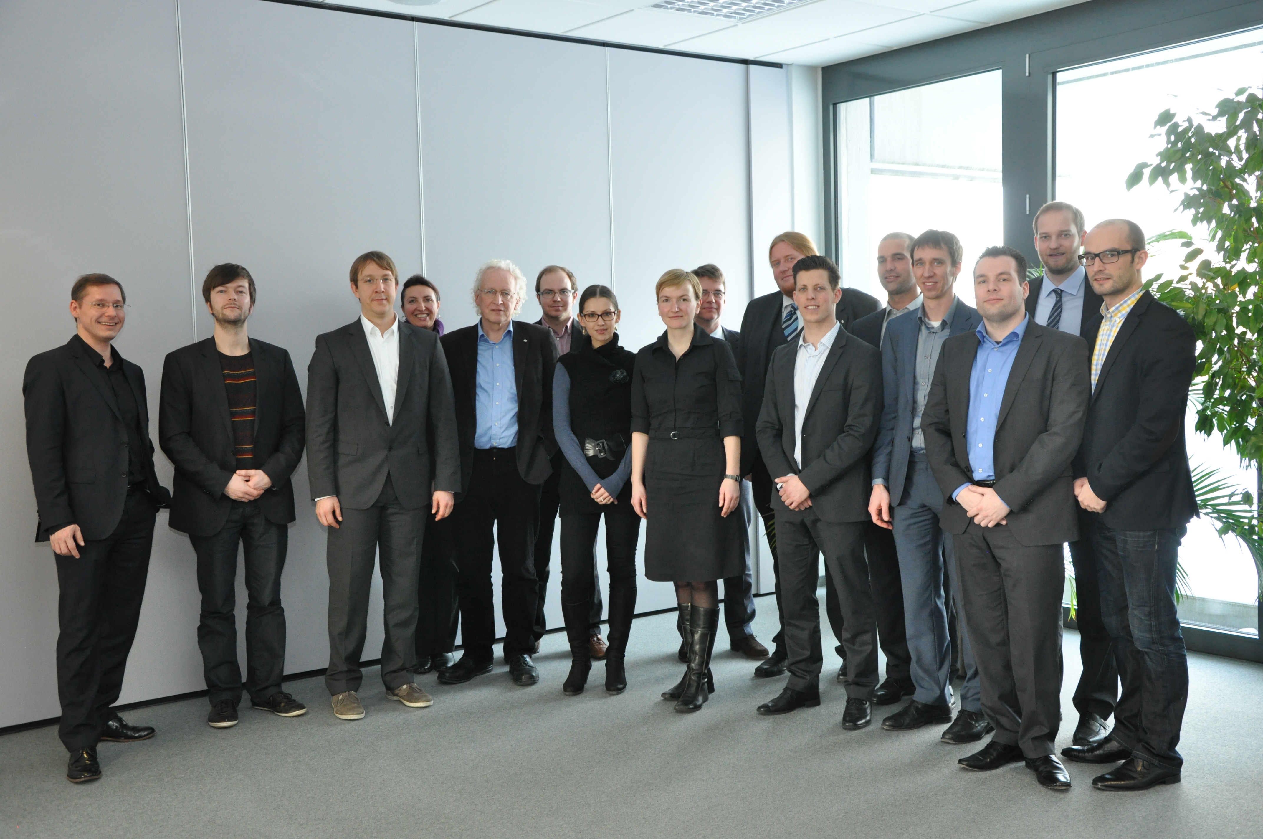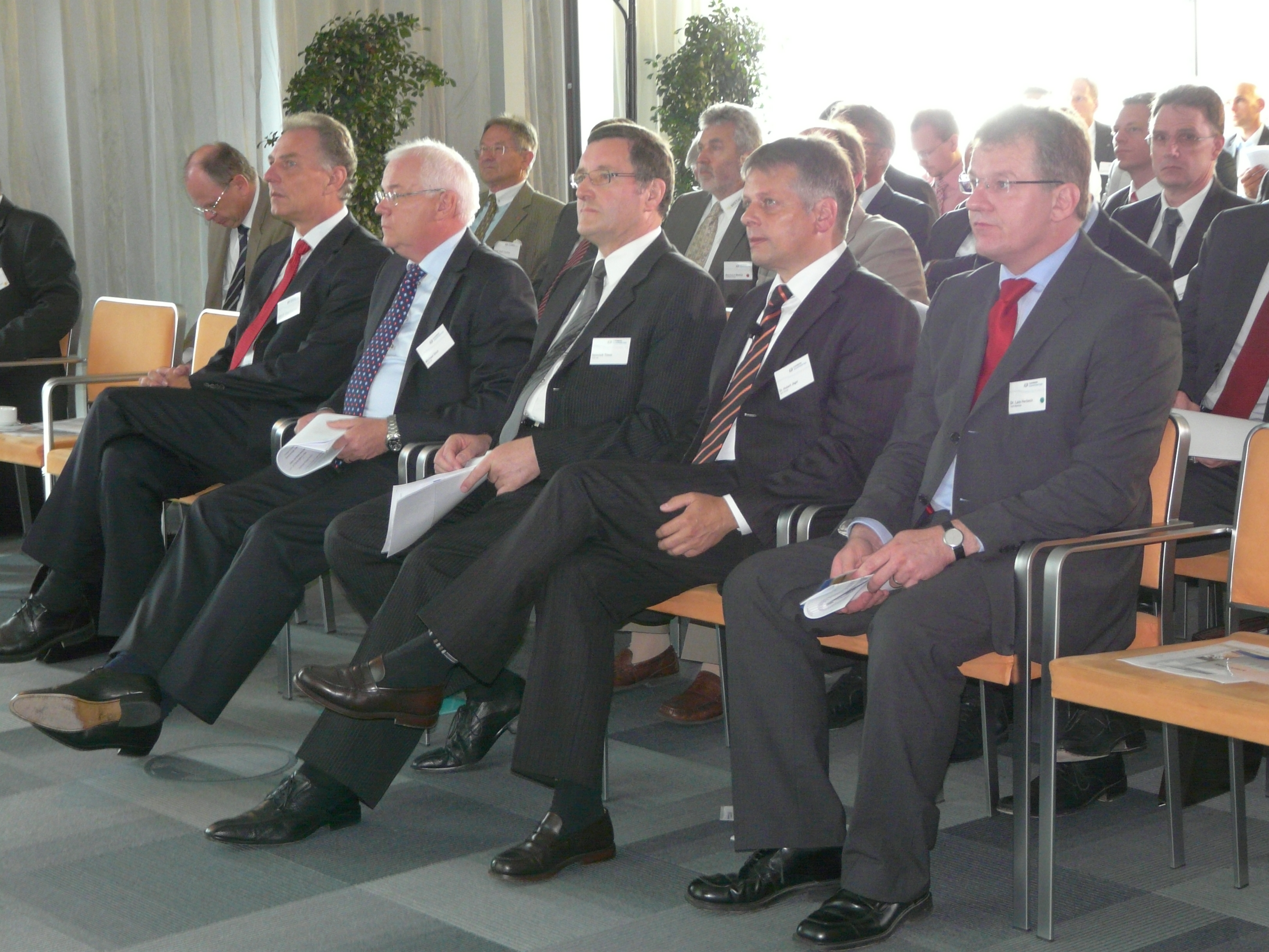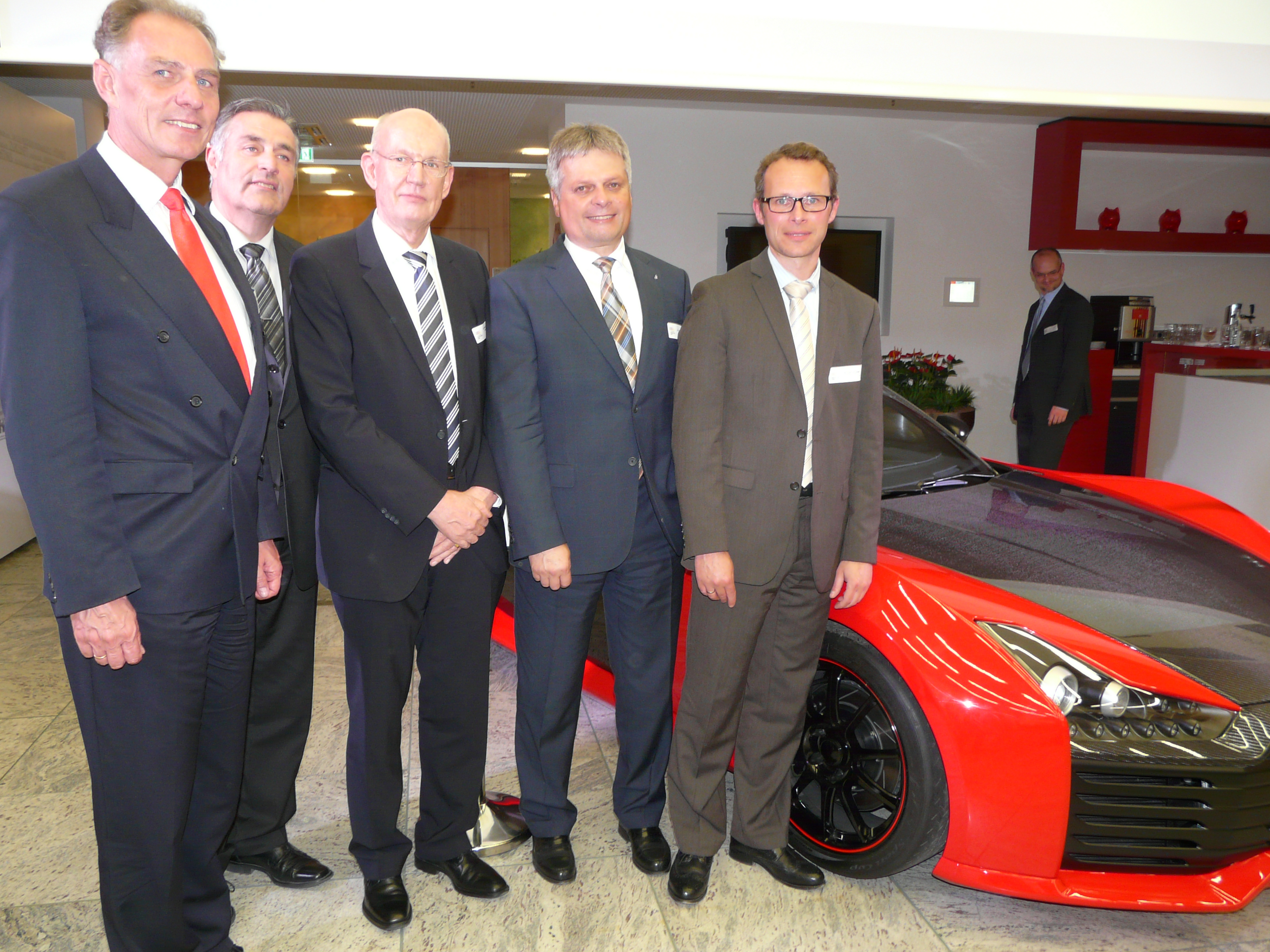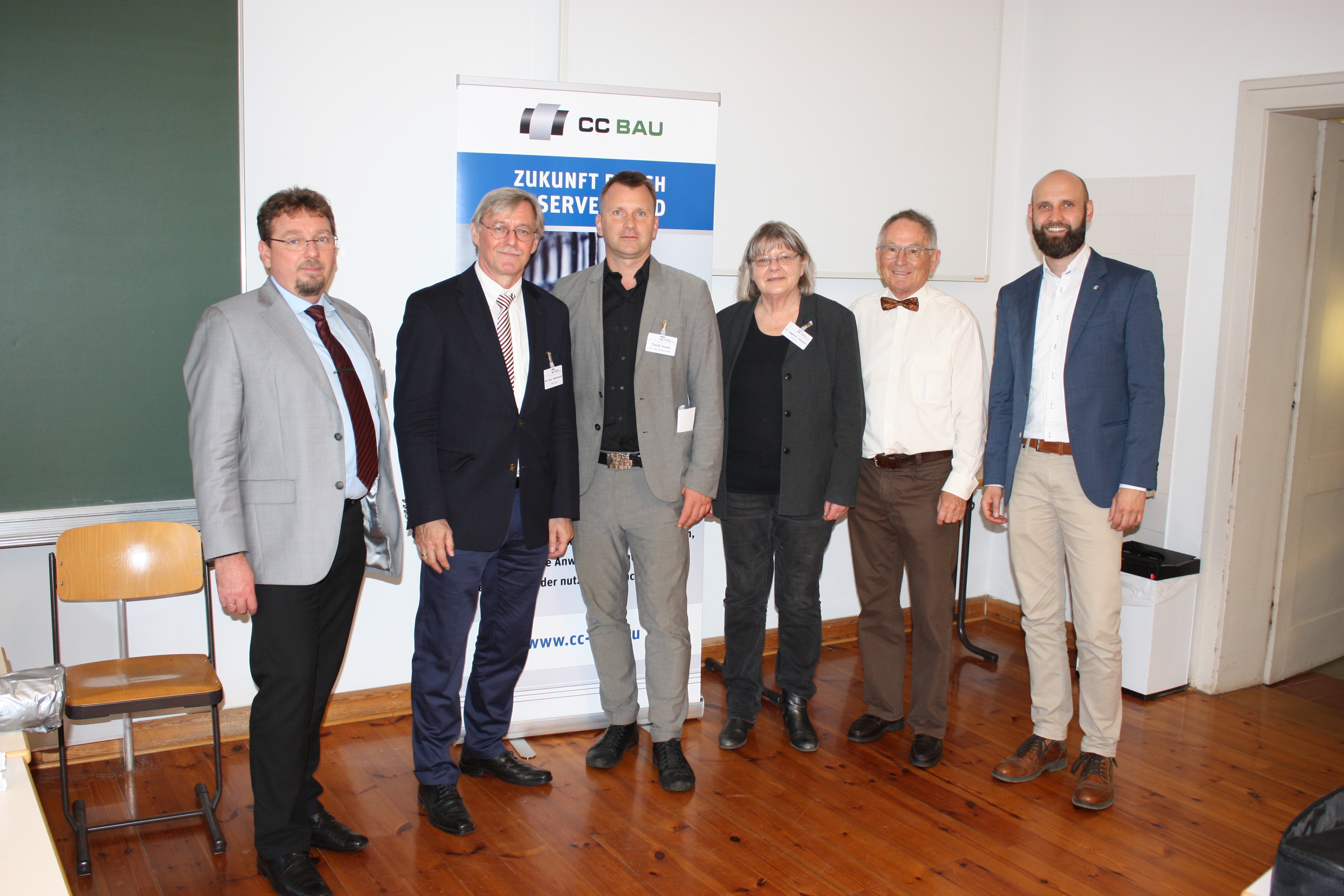 Gäste auf der "Verlobungsfeier" des CC TUDALIT in Dresden: Ulrich Assmann, Geschäftsführer TUDAG, Dr. Thomas Heber, Geschäftsführer CC Ost, Silvio Weiland (stellvertretender Geschäftsführer TUDALIT e.V.), Roy Thyroff, Geschäftsführer TUDALIT e.V., Dr. Frank Schladitz, Geschäftsführer CC TUDALIT (hinten von links), Dr. Hans-Wolfgang Schröder, Geschä