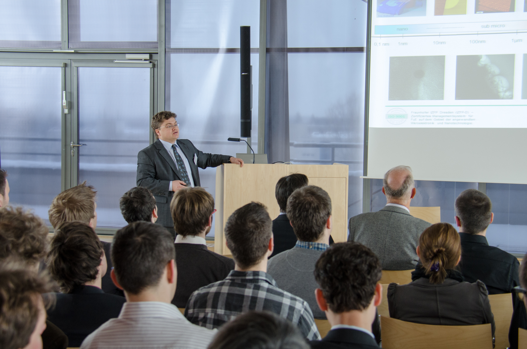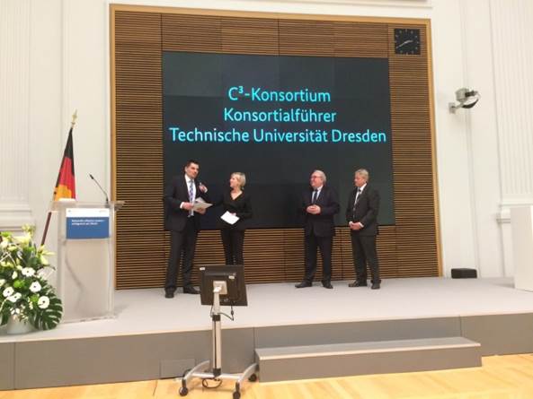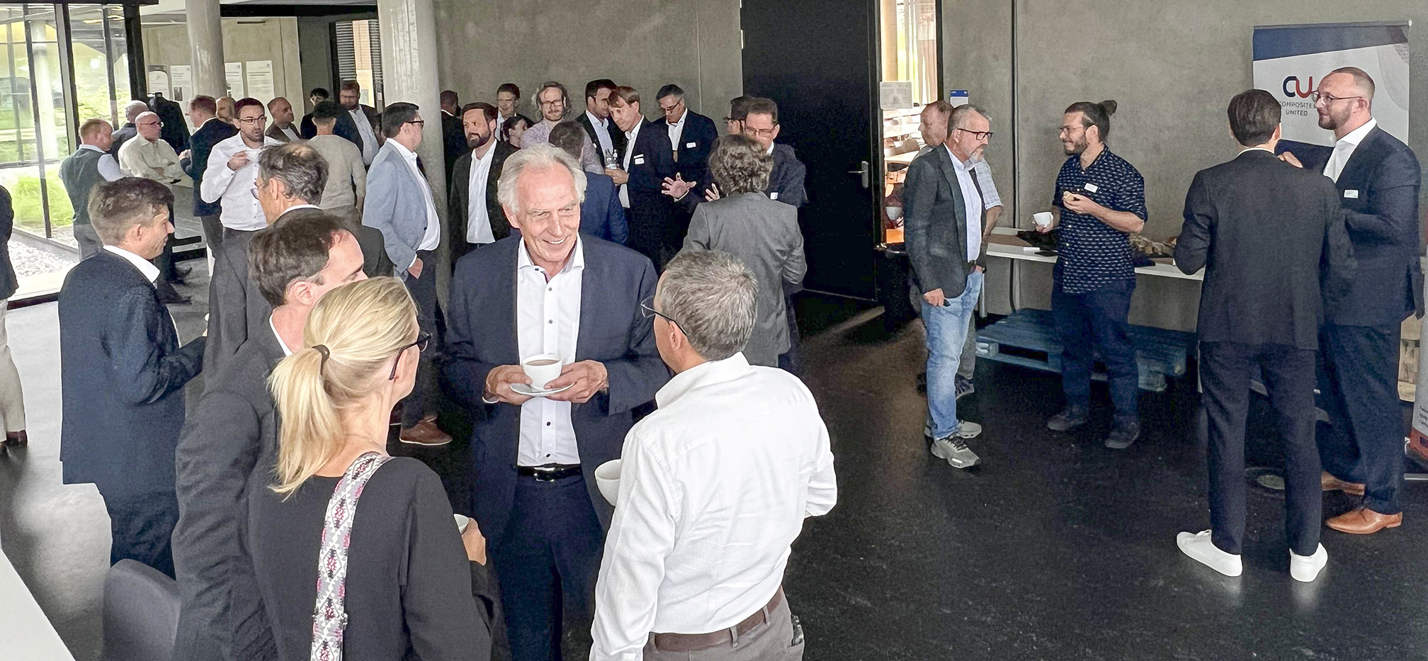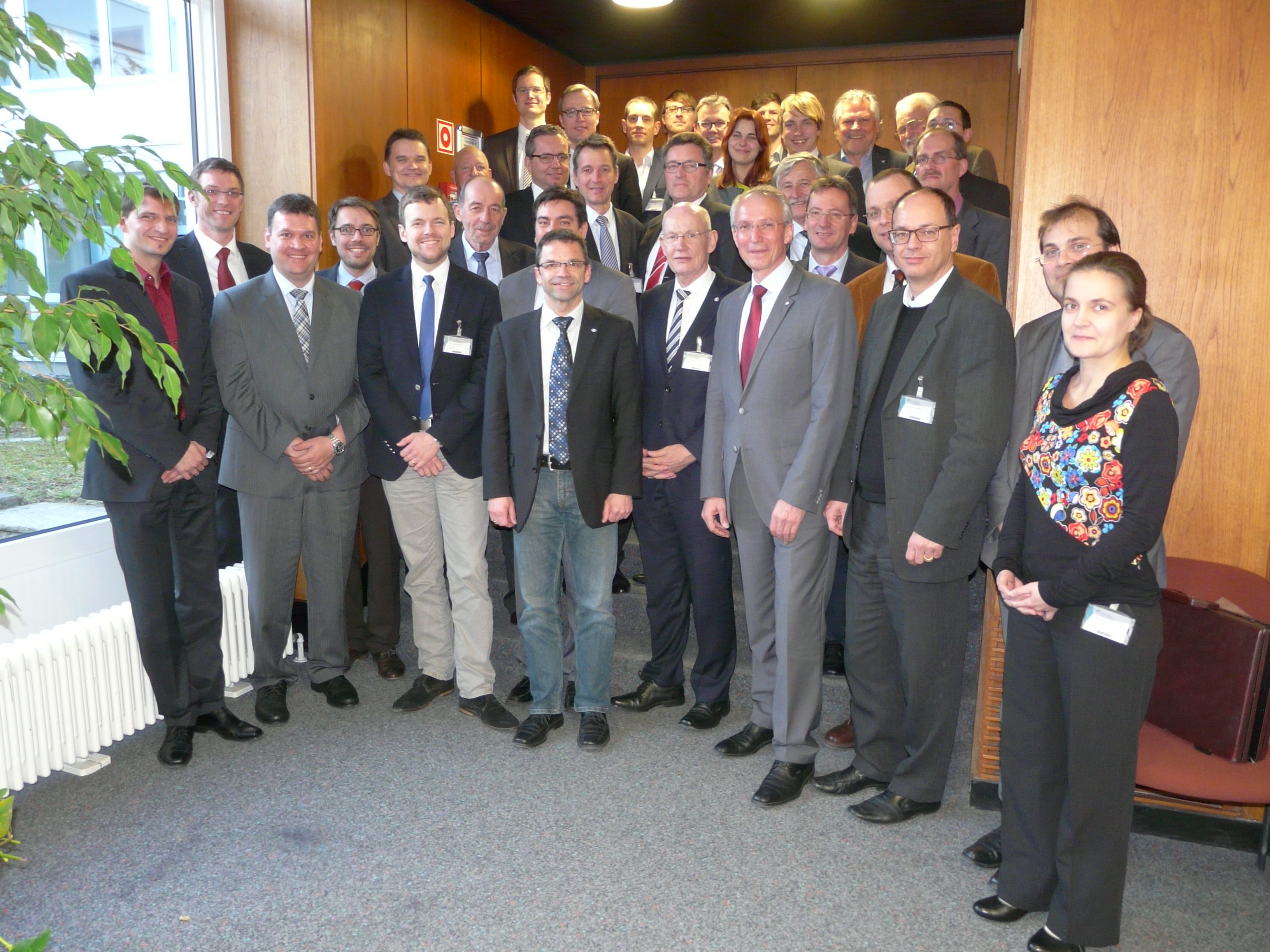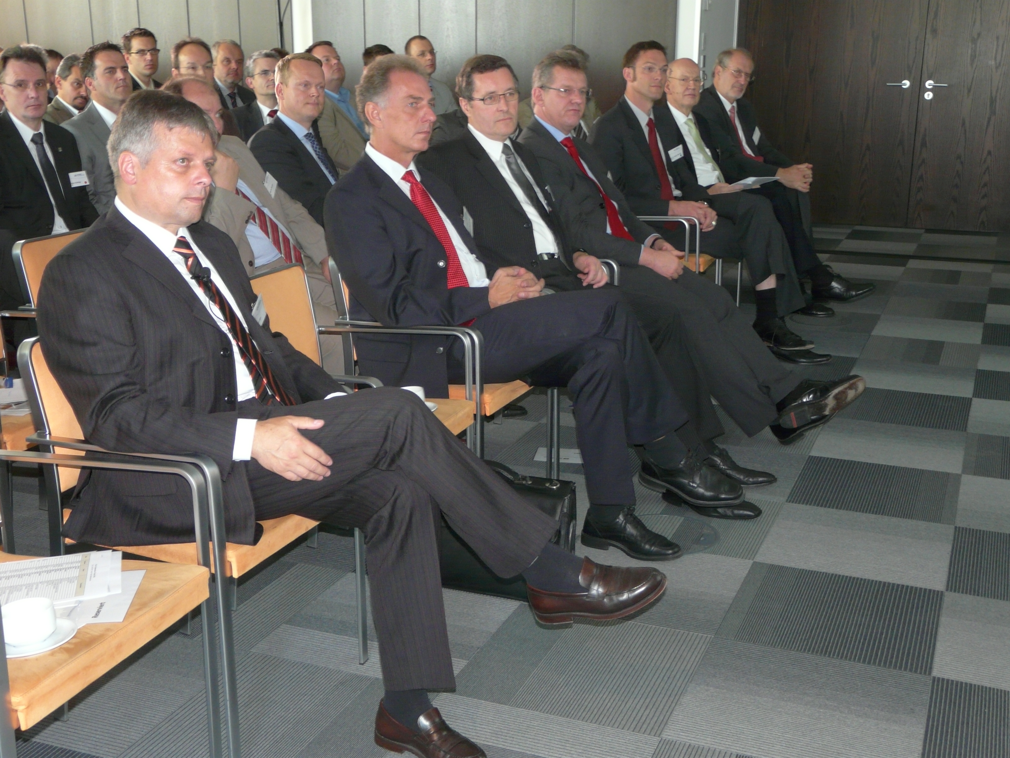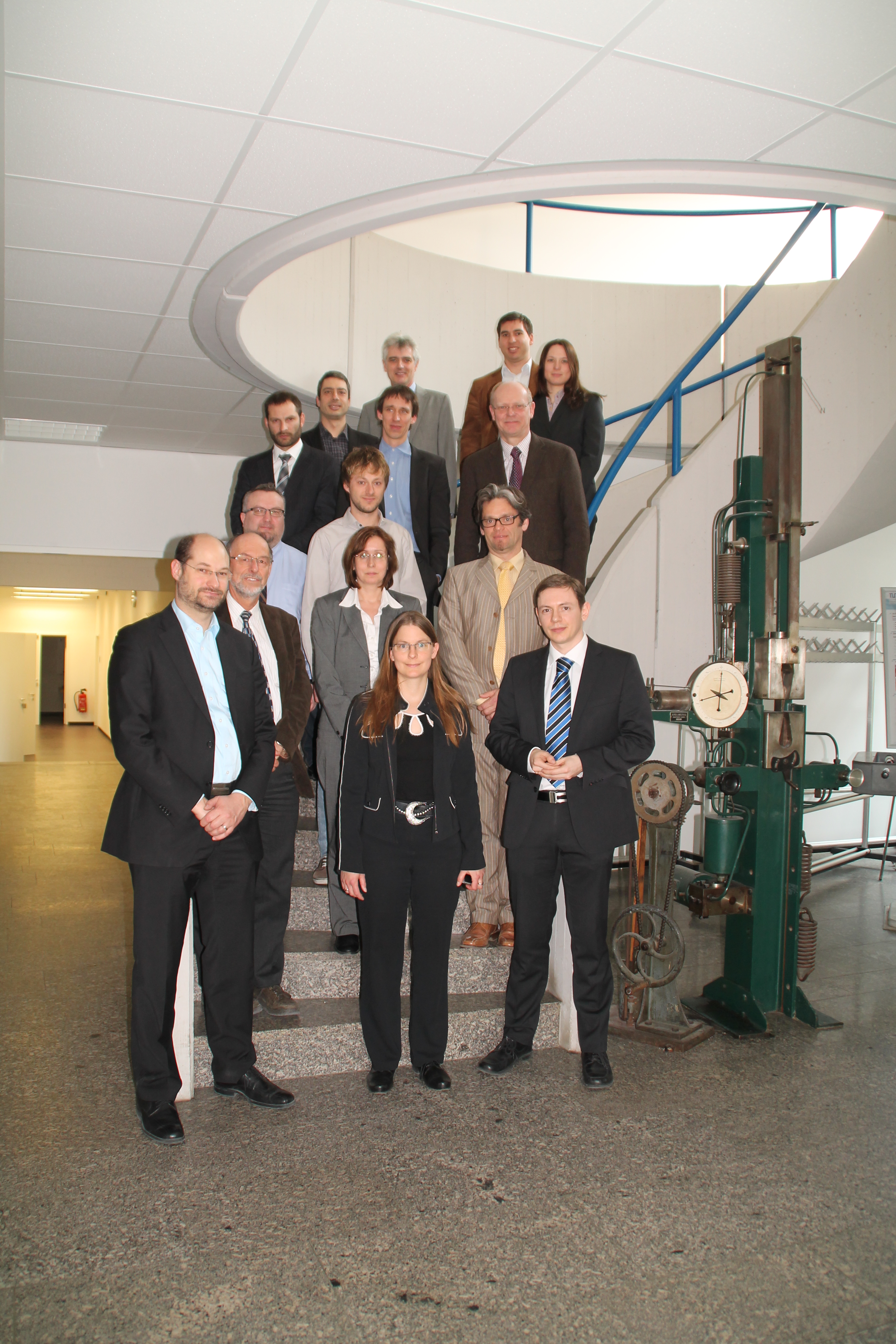 Gäste auf der "Verlobungsfeier" des CC TUDALIT in Dresden: Ulrich Assmann, Geschäftsführer TUDAG, Dr. Thomas Heber, Geschäftsführer CC Ost, Silvio Weiland (stellvertretender Geschäftsführer TUDALIT e.V.), Roy Thyroff, Geschäftsführer TUDALIT e.V., Dr. Frank Schladitz, Geschäftsführer CC TUDALIT (hinten von links), Dr. Hans-Wolfgang Schröder, Geschä