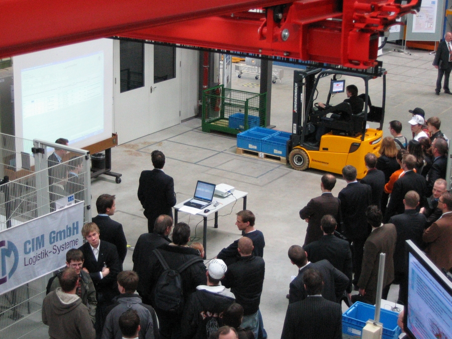 Live-Demonstration in der Versuchshalle der TU München: RFID-gesteuerte Umlagerung im Blocklager.