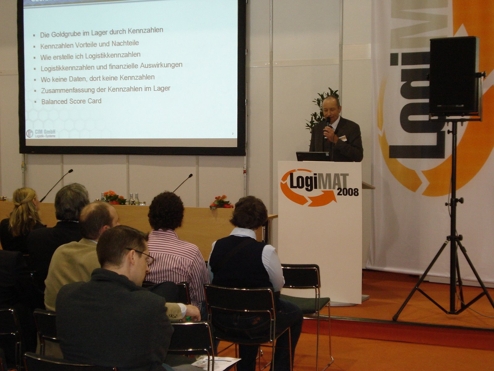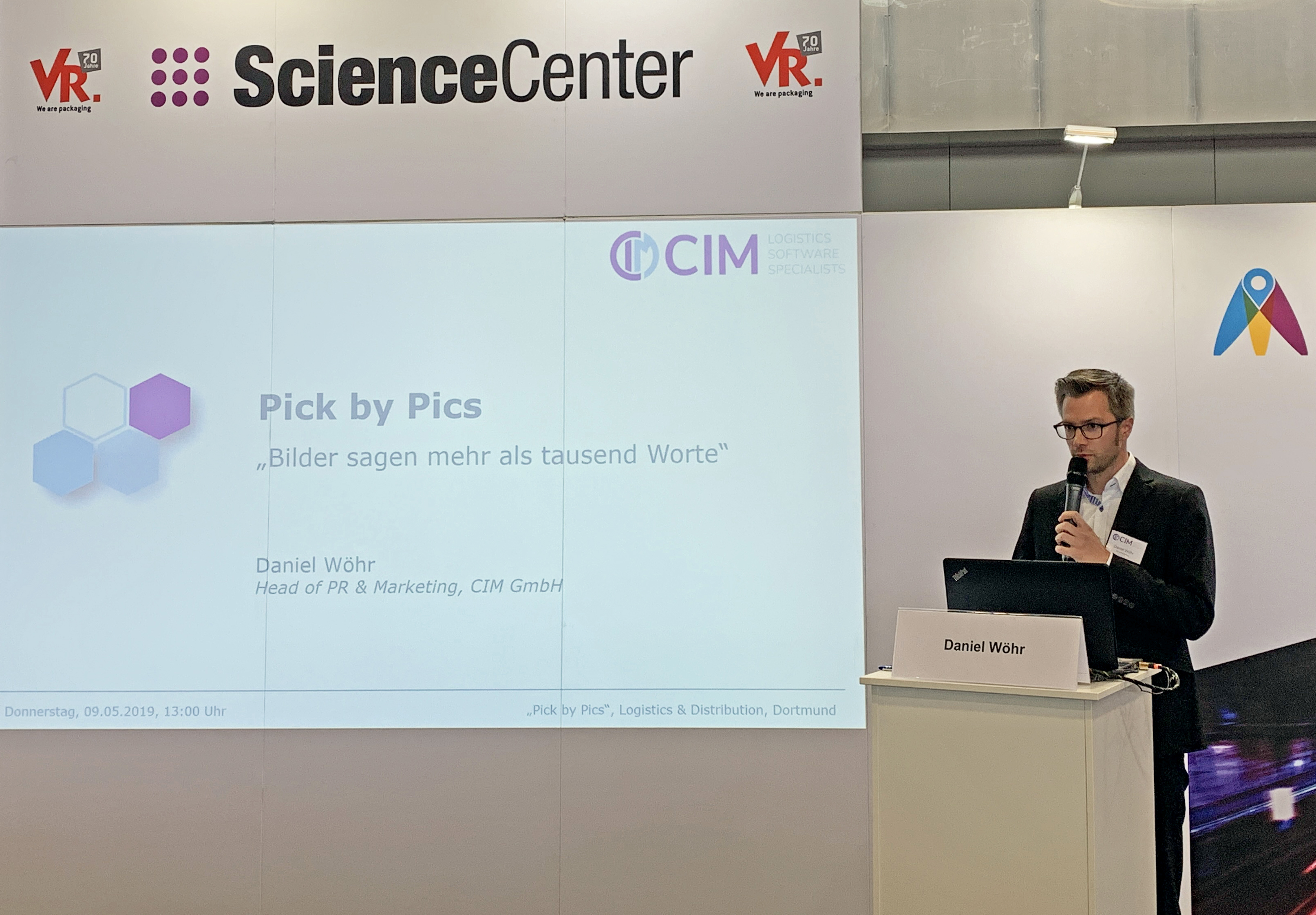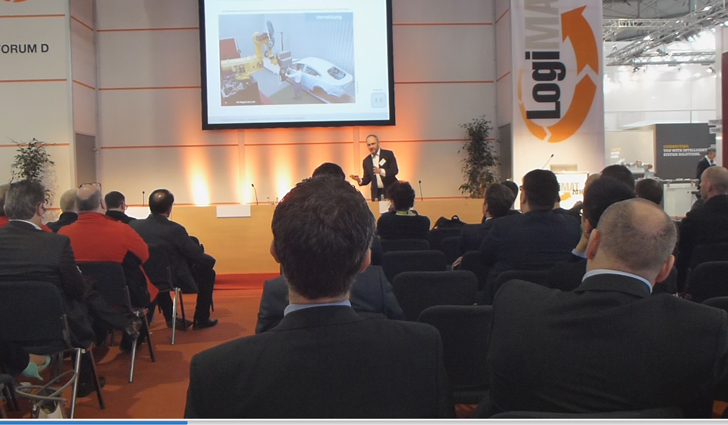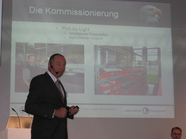 Pick-by-Vision in der Kommissionierung. Dipl.-Ing. Fritz Mayr während des Vortrags auf der CeMAT.