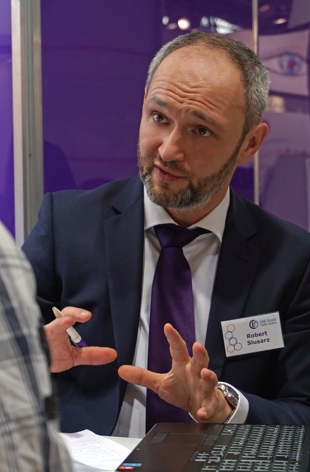 Andrang auf der LogiMAT: Logistikberater Gennadiy Novak im Interessentengespräch