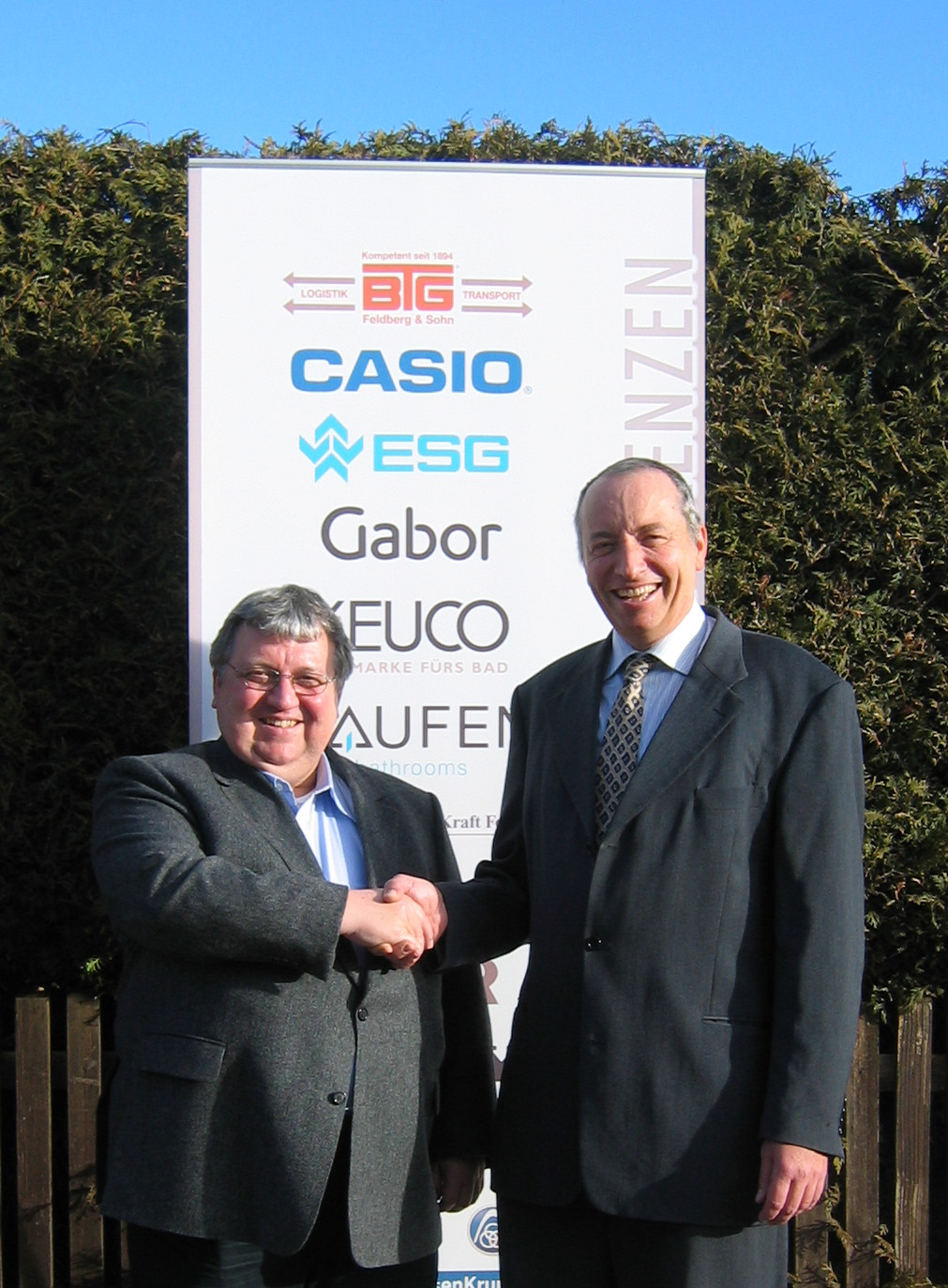 Tobias Laxa (Marketingleiter CIM GmbH) und Florian Hopen (Channel Manager LXE GmbH) besiegeln die strategische Partnerschaft beider Unternehmen (v.l.n.r.)