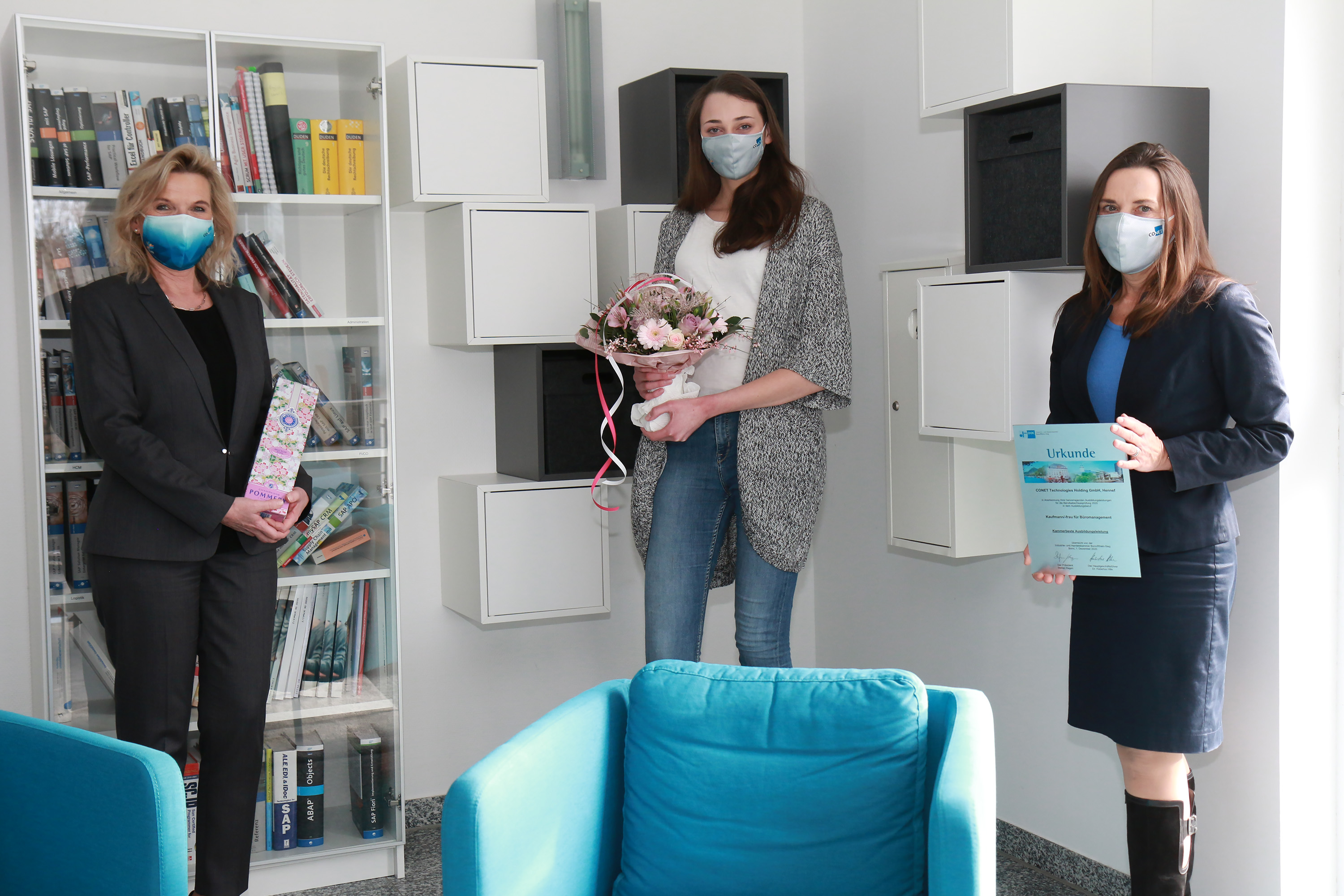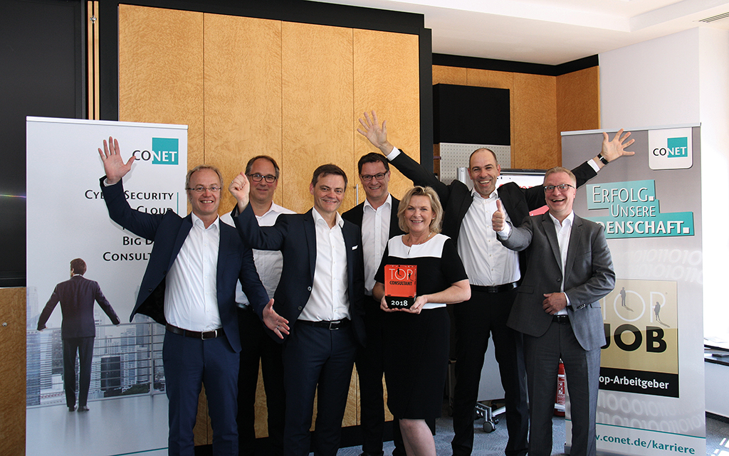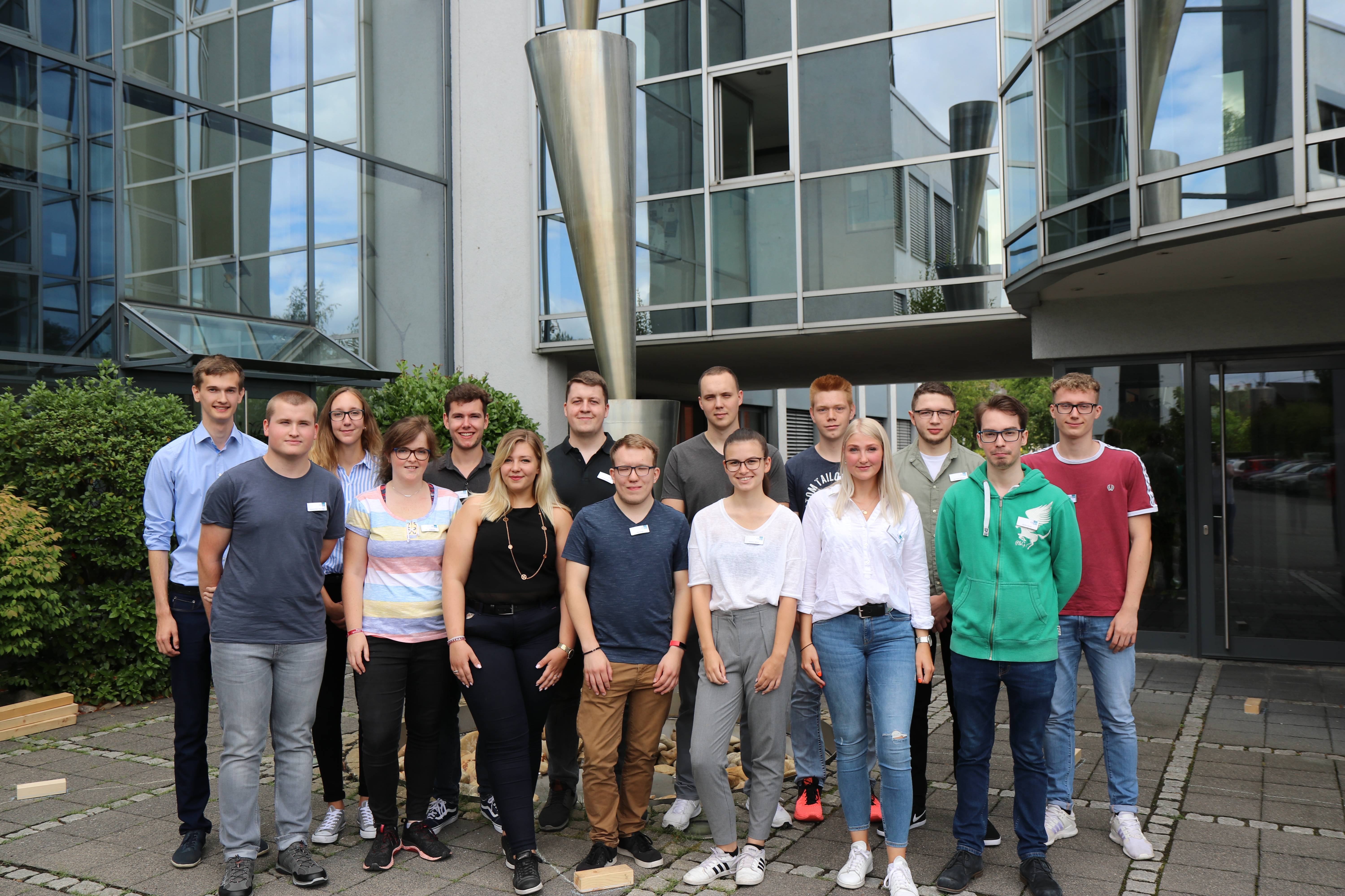 Die CONET-Auszubildenden 2019 (v.l.n.r. hinten): Lukas Baum, Lara Ullrich, Andre Kurz, Thorben Köller, Stefan Felder, Niclas Neßhöver, Jan Peter Stöcker, Alexander Zink; (v.l.n.r. vorne): Maximilian Henning, Naomi Nöckel, Christina Adamec, Max Döge, Vanessa Böhm, Julia Kreft, Justin Zanas