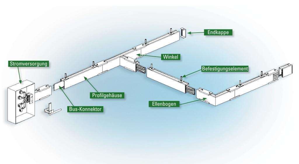 Alle Komponenten der modularen Starline Stromschiene auf einen Blick.