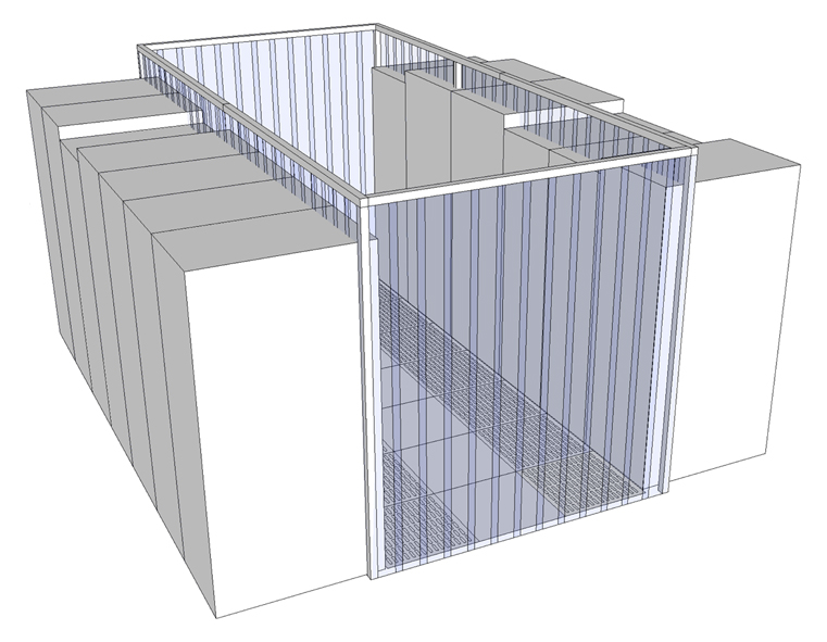 Die Skizze zeigt eine erhöhte Einhausung, die ohne Dachelemente auskommt und sich für eine Integration von Overhead-Löschsystemen eignet.