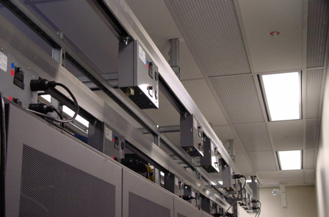 Hier ein Beispiel für die Stromversorgung per Schiene und Abgangskästen in einer Overhead-Infrastruktur.