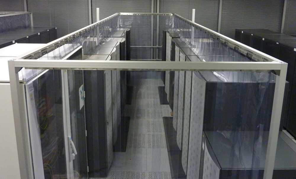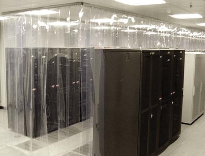 Hier ein Beispiel für eine kostengünstige Kaltgangeinhausung per Kunststoffvorhang.