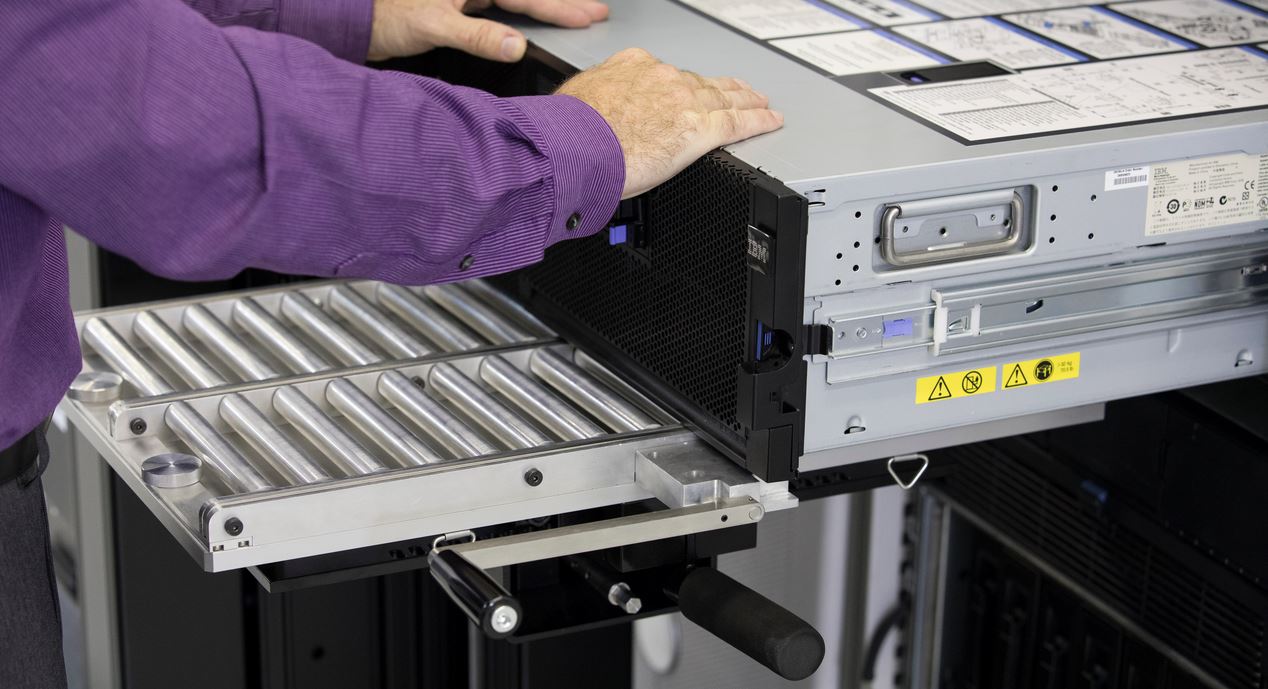 Mittels der Gleitplattform wird schweres IT-Equipment einfach ins Rack zur Montage eingeschoben.
