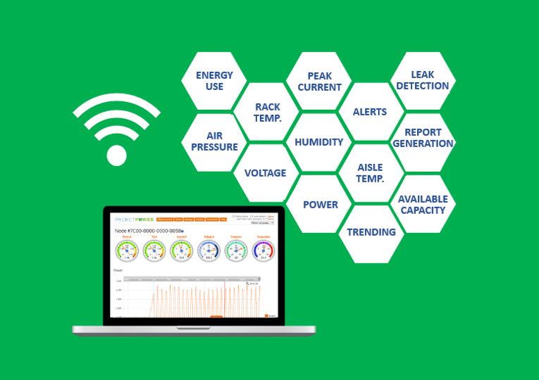 The main benefit of all wire-free monitoring modules is that they are not connected via cable to each other. As soon as they are activated the monitoring devices instantly configure themselves automatically and begin to share measurement data such as power, temperature, humidity and differential pressure via a self-configuring wire-free radio mesh network. All measurement data is wirelessly gathered by a system gateway that simply uses the SNMP or Modbus TCP/IP protocol to transmit the data to the Packet Power EMX Energy Portal or a third party BMS or DCIM tool.