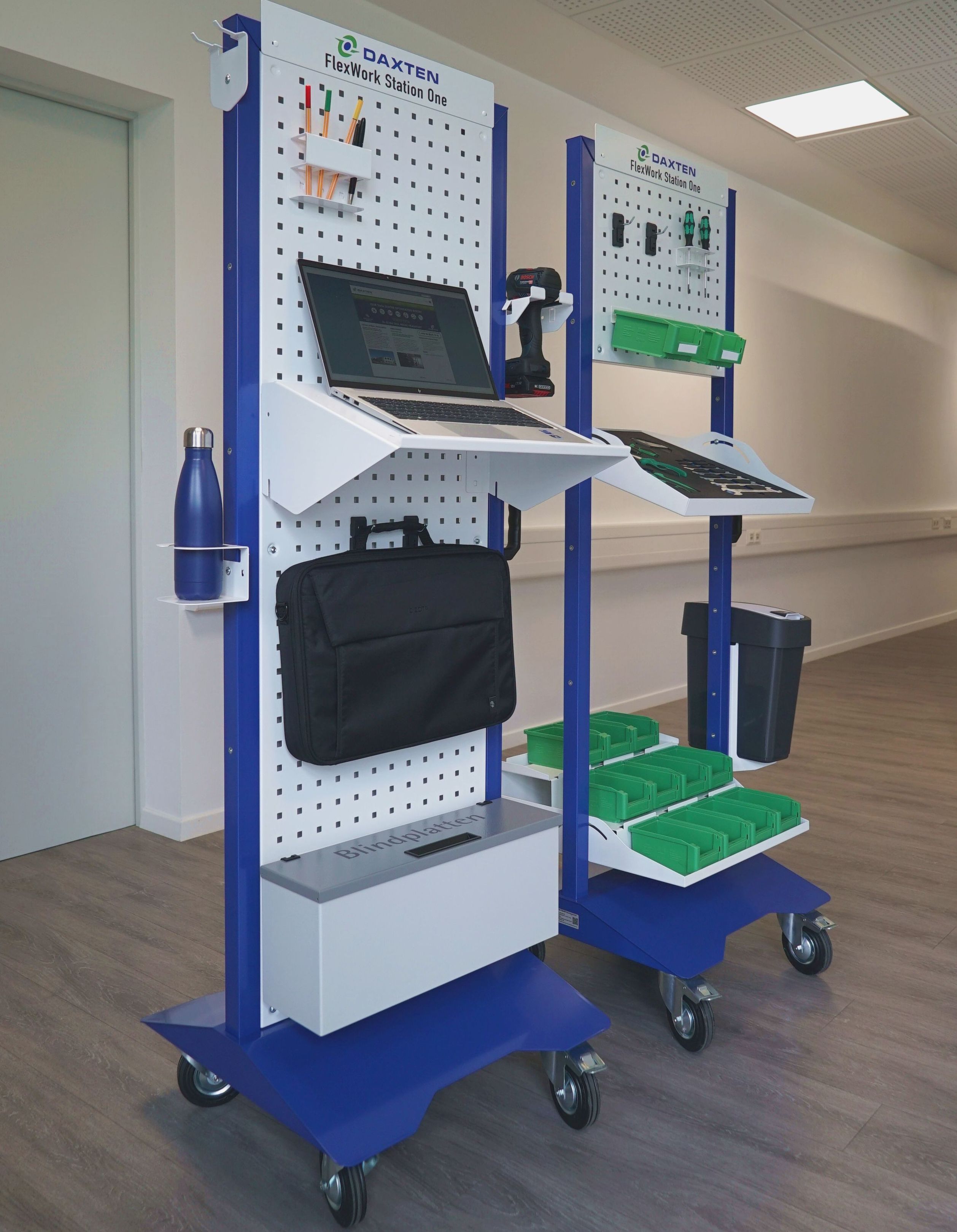 Das knapp über 1,80 Meter hohe, 0,60 Meter tiefe sowie 0,65 Meter und damit etwas mehr als Standardbodenplatte breite Gestell der Arbeitsstation steht auf vier großformatigen und gummierten Lenkrollen, die über integrierte Feststellbremsen verfügen. Diese sorgen für komfortable Mobilität, hohe Wendigkeit in engen Gängen und eine einfache Manövrierbarkeit sowie sichere Arretierung. Zur Ausstattung gehört ferner ein B1 Raster- beziehungsweise Lochblech. Und damit ist die Basis benannt, auf der Anwenderinnen und Anwender ihre FlexWork Station One weiter individuell konfigurieren können: Zur Wahl stehen etwa Werkzeughalter, Einhängehaken, Ablagefächer, Klemmhalter, Kabelhalter, Materialablagen und Werkzeugfachböden in diversen Ausführungen und Abmessungen. In Letztere lassen sich auch sogenannte Schattenboards einsetzen. Das sind in einen Schaumstoff vorgestanzte Einlagen für verschiedene Werkzeuge. So können Rechenzentrumsprofis vor jedem Montageeinsatz auf einen Blick erkennen, ob alles parat liegt oder ein Werkzeug fehlt. Auf diese Weise wird sichergestellt, dass auch wirklich alles am Ort der Installation zur Hand ist und lästiges Hin- und Hergerenne vermieden wird. Praktisch sind auch Halterungen für Mülleimer zur sicheren Entsorgung von Verpackungsmaterial, Verkabelungsresten und Kleinabfällen, die nicht auf den Bodenplatten liegen und keinesfalls in den Doppelboden gelangen dürfen. Ebenfalls erhältliche Ablagen für Dokumente sowie frei gestaltbare Beschriftungsplatten sorgen für Ordnung, Übersicht und dafür, dass alles stets am richtigen Platz ist.