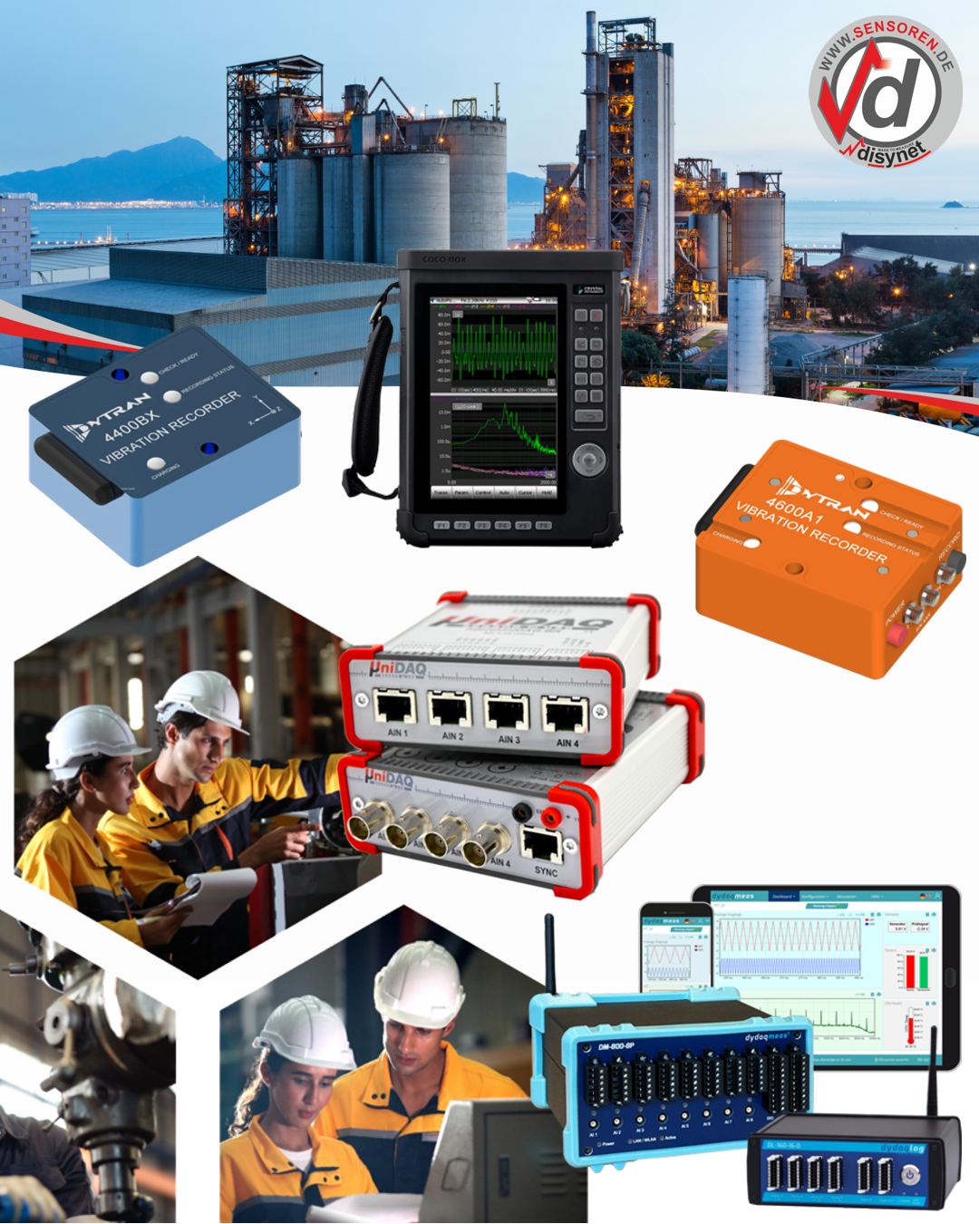 Innovative Datenlogger von disynet: die kompakten VibraCorder zur Vibrationsmessung, das tragbare CoCo80x Signalanalysegerät, den handlichen microUniDAQ USB-Datenlogger und das flexible dydaqmeas/dydaqlog System mit Weboberfläche – alle optimiert für unterschiedliche Anwendungen in Industrie, Forschung und Technik. Die Geräte veranschaulichen Vielfalt und Präzision der disynet-Lösungen.