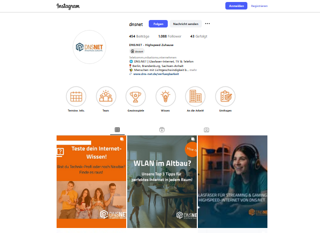 Mehr zu Praxistipps rund um die Glasfaseranwendungen, Profitipps und Technik-Gewinnspiel in den Social Media Kanälen von DNS:NET: Facebook und Instagram