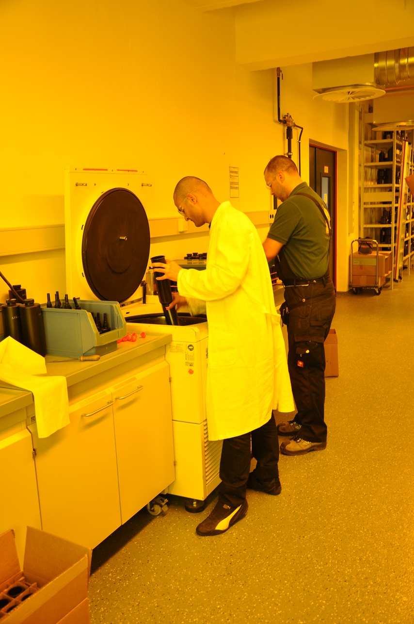 DYMAX Mitarbeiter bei der Zentrifugierung von Klebstoffkartuschen, um diese von Luftblasen zu befreien.