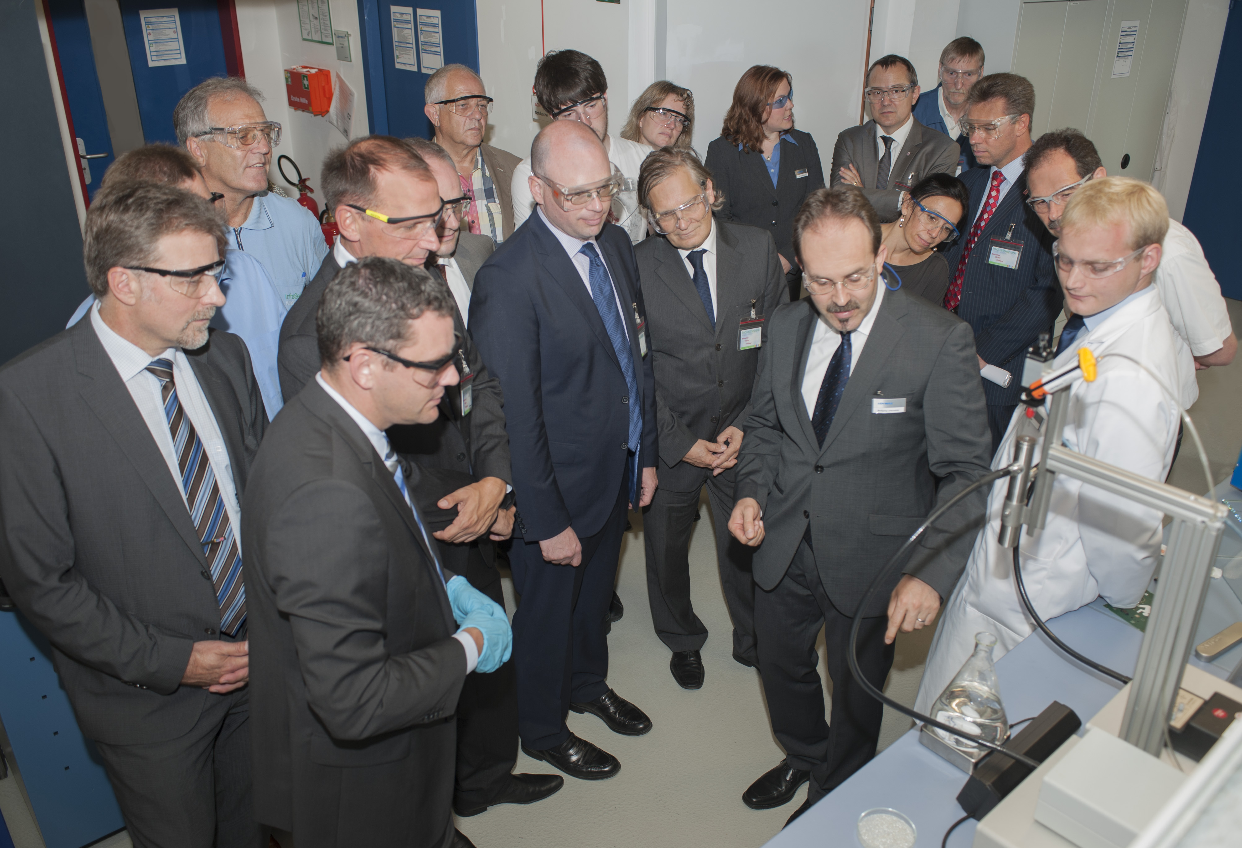 Wolfgang Lorscheider, Technischer Leiter der Dymax Europe GmbH, zeigt Sven Gerich, Oberbürgermeister von Wiesbaden, und den anderen Besuchern der offiziellen Eröffnung Anwendungen der lichthärtenden Klebstoffe.