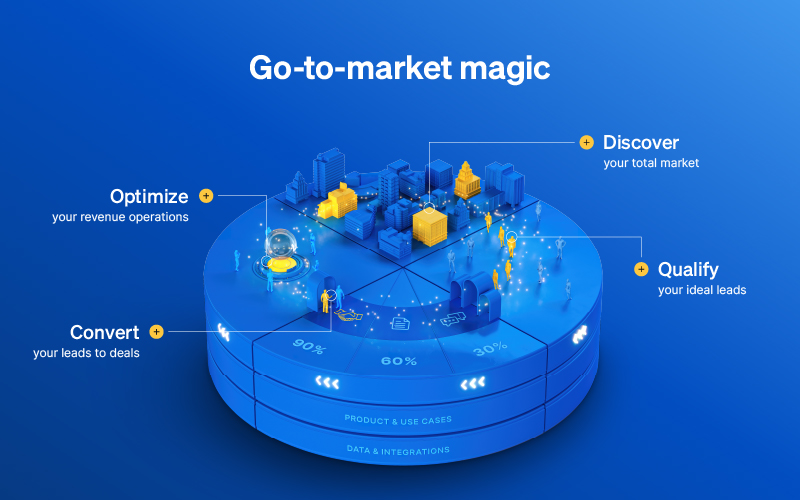 Dealfront’s platform centralizes its applications around four stages - Discover, Qualify, Convert, and Optimize. Each stage feeds the next, creating a flywheel effect that constantly refines the process in a perpetual loop, propelling revenue growth forward. This flywheel effect turns static ICPs into dynamic, self-optimizing, and real-time customer profiles that always improve in accuracy and reflect reality. The result is more leads that end in sales, transforming businesses into a self-propelled revenue engine.