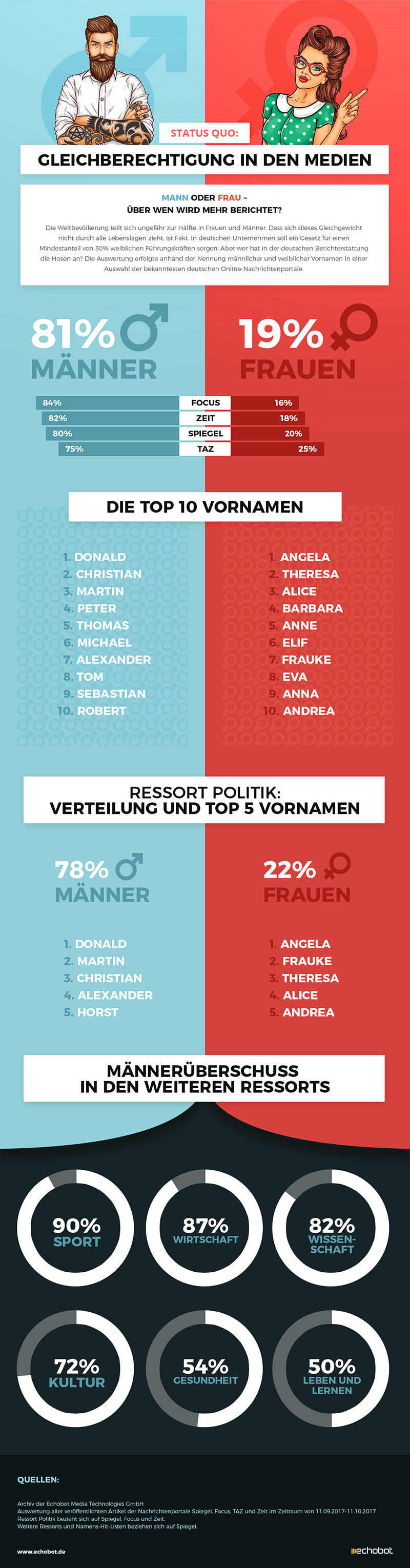 Die Natur macht mit der Gleichberechtigung kurzen Prozess. Über die Zeit sorgt sie in der Masse der Geburten dafür, dass das Verhältnis Mann/Frau auf der Welt ungefähr ausgeglichen ist. In den Führungsetagen klappt das noch nicht so richtig, deshalb soll das seit 2015 ein Gesetz regeln. Thomas Wagener hat jetzt untersucht, wie das denn die Plattformen halten, über die viele Gender-Diskussionen ins Rollen kommen – die Medien. Er nutzte das Archiv von Echobot und wertete die Nennungen von Vornamen in einigen großen Online-Nachrichtenportalen aus. Man könnte meinen, dass wir uns im Jahr 2017, in dem Deutschland gerade eine Bundeskanzlerin wiedergewählt hat, eigentlich langsam aus der Gender-Debatte verabschieden können. Die Ergebnisse sagen etwas anderes.